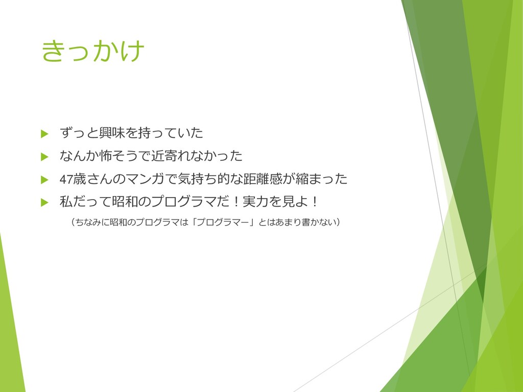 きっかけ ずっと興味を持っていた なんか怖そうで近寄れなかった 47歳さんのマンガで気持ち的な距離感が縮まった 私だって昭和のプログラマだ!実力を見よ! (ちなみに昭和のプログラマは「プログラマー」とはあまり書かない)