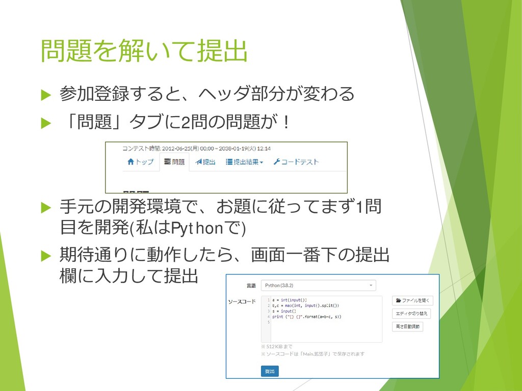 この資料の内容と趣旨 AtCoder というサービスで「競技プログラム」というの を初めて体験してみました まだ体験したことがない人向けに、最初にどんな手順で 進むのかを、自らの体験をもとに紹介します 私にとっての発表のメリットは、こういう発表をしちゃ