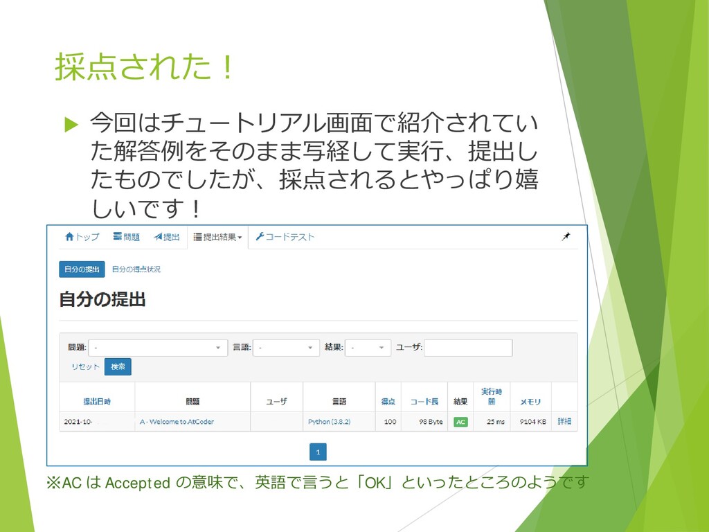 採点された! 今回はチュートリアル画面で紹介されてい た解答例をそのまま写経して実行、提出し たものでしたが、採点されるとやっぱり嬉 しいです! ※AC は Accepted の意味で、英語で言うと「OK」といったところのようです