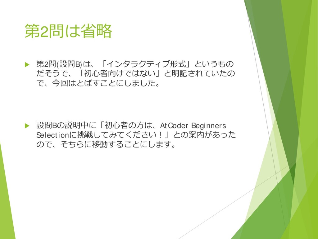 第2問は省略 第2問(設問B)は、「インタラクティブ形式」というもの だそうで、「初心者向けではない」と明記されていたの で、今回はとばすことにしました。 設問Bの説明中に「初心者の方は、AtCoder Beginners Selectionに挑戦してみてください!」との案内があった ので、そちらに移動することにします。