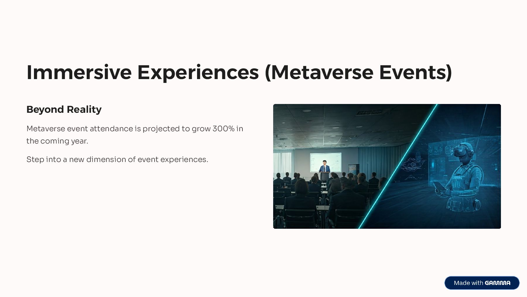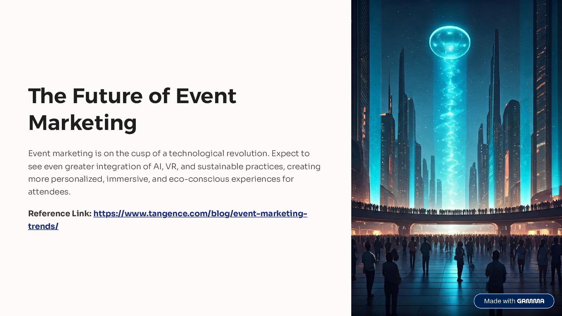 cusp of a technological revolution. Expect to see even greater integration of AI, VR, and sustainable practices, creating more personalized, immersive, and eco-conscious experiences for attendees. Reference Link: https://www.tangence.com/blog/event-marketing- trends/