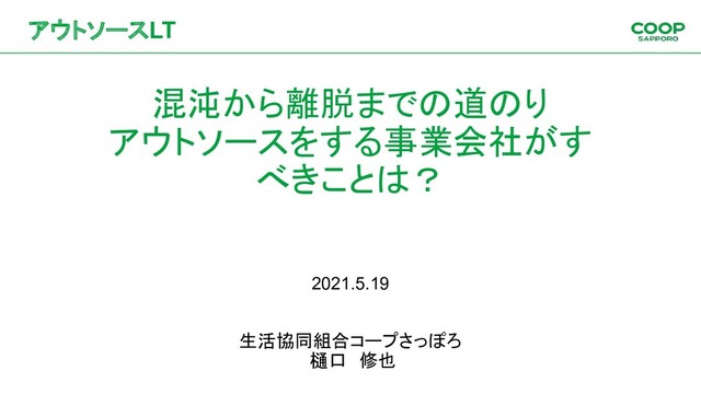 混沌から離脱までの道のり アウトソースをする事業会社がす べきことは? 2021.5.19 生活協同組合コープさっぽろ 樋口 修也 アウトソースLT
