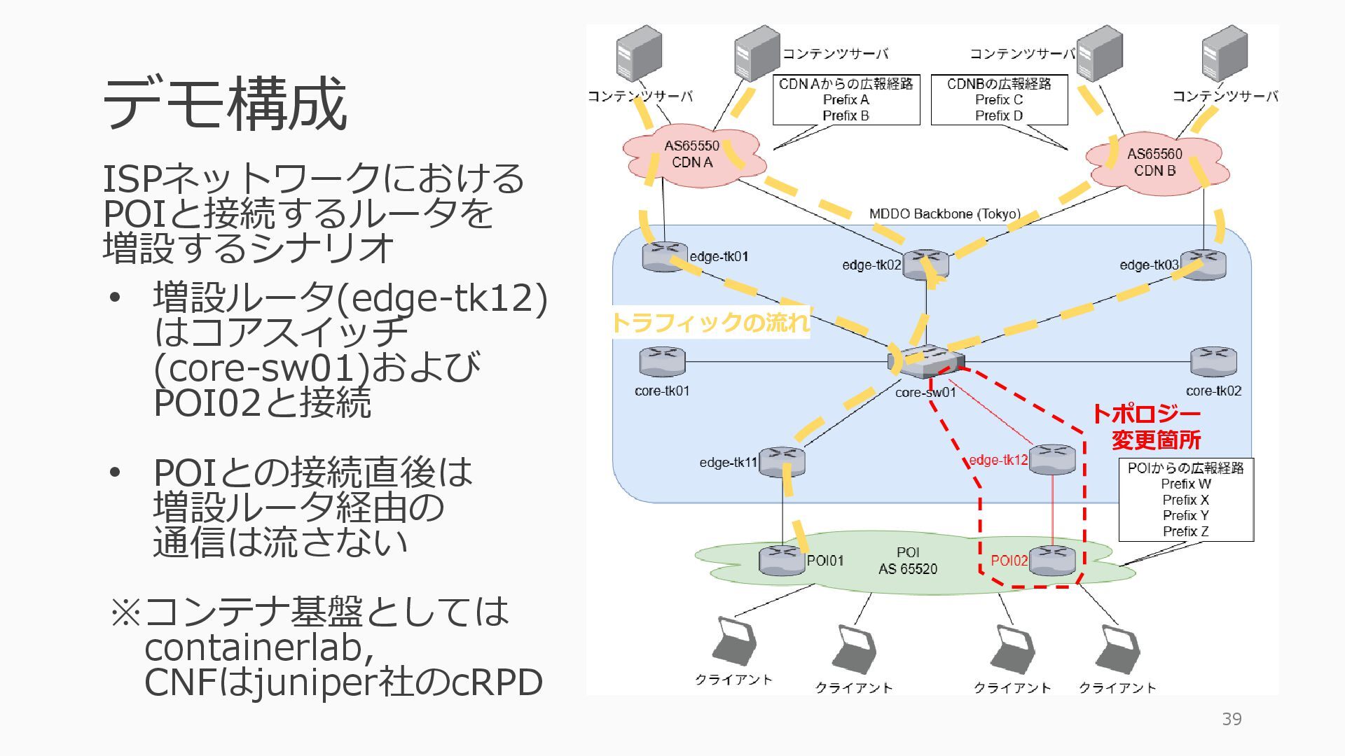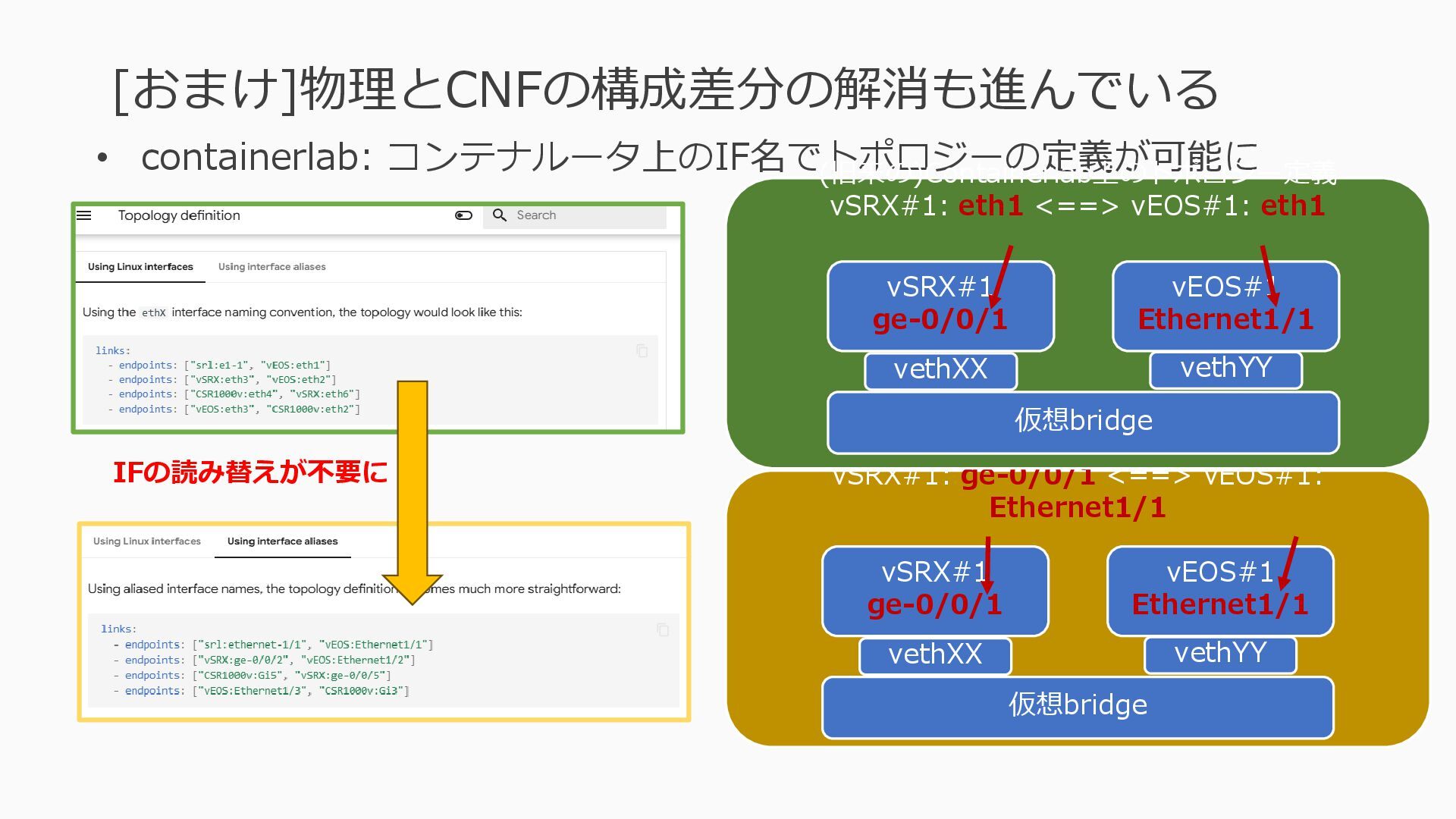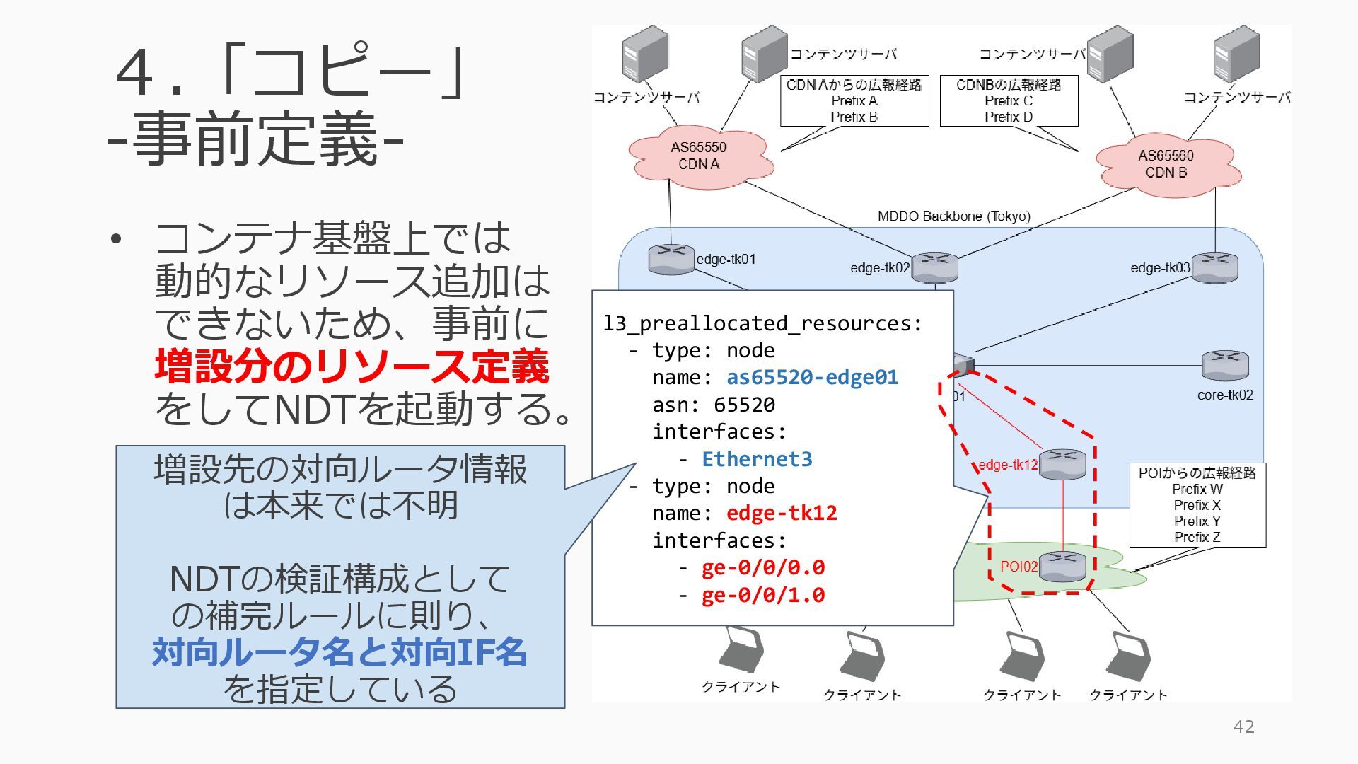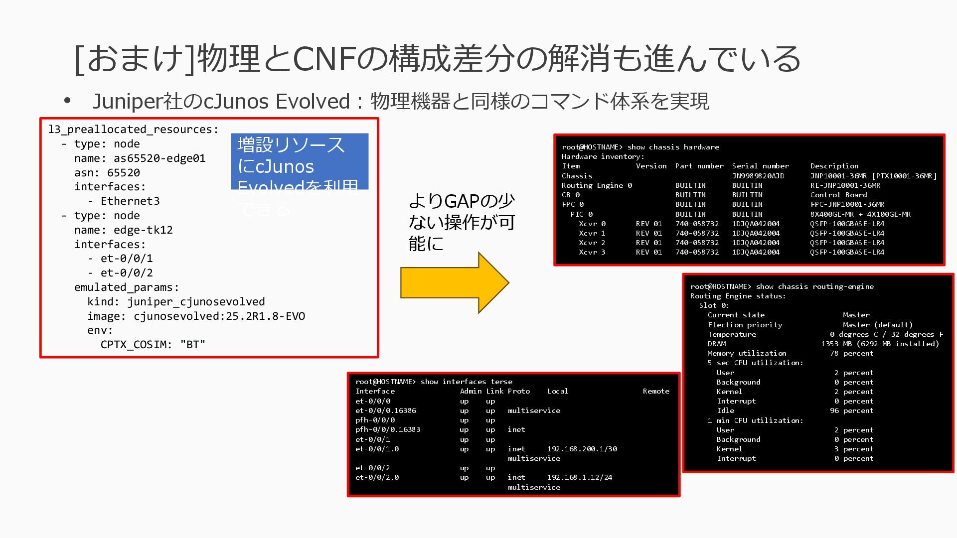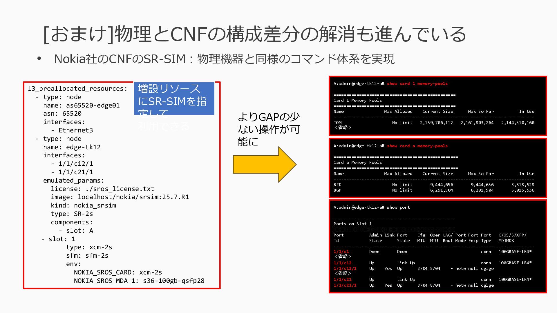 1 =============================================== Port Admin Link Port Cfg Oper LAG/ Port Port Port C/QS/S/XFP/ Id State State MTU MTU Bndl Mode Encp Type MDIMDX ------------------------------------------------------------------------------- 1/1/c1 Down Down conn 100GBASE-LR4* <省略> 1/1/c12 Up Link Up conn 100GBASE-LR4* 1/1/c12/1 Up Yes Up 8704 8704 - netw null cgige <省略> 1/1/c21 Up Link Up conn 100GBASE-LR4* 1/1/c21/1 Up Yes Up 8704 8704 - netw null cgige A:admin@edge-tk12-a# show card 1 memory-pools ================================================ Card 1 Memory Pools ================================================ Name Max Allowed Current Size Max So Far In Use ------------------------------------------------------------------------------- IOM No limit 2,159,706,112 2,161,803,264 2,144,510,160 <省略> A:admin@edge-tk12-a# show card a memory-pools ================================================= Card a Memory Pools ================================================= Name Max Allowed Current Size Max So Far In Use ------------------------------------------------------------------------------- BFD No limit 9,444,656 9,444,656 8,318,528 BGP No limit 6,291,504 6,291,504 5,015,536 l3_preallocated_resources: - type: node name: as65520-edge01 asn: 65520 interfaces: - Ethernet3 - type: node name: edge-tk12 interfaces: - 1/1/c12/1 - 1/1/c21/1 emulated_params: license: ./sros_license.txt image: localhost/nokia/srsim:25.7.R1 kind: nokia_srsim type: SR-2s components: - slot: A - slot: 1 type: xcm-2s sfm: sfm-2s env: NOKIA_SROS_CARD: xcm-2s NOKIA_SROS_MDA_1: s36-100gb-qsfp28 増設リソース にSR-SIMを指 定して 利用できる よりGAPの少 ない操作が可 能に