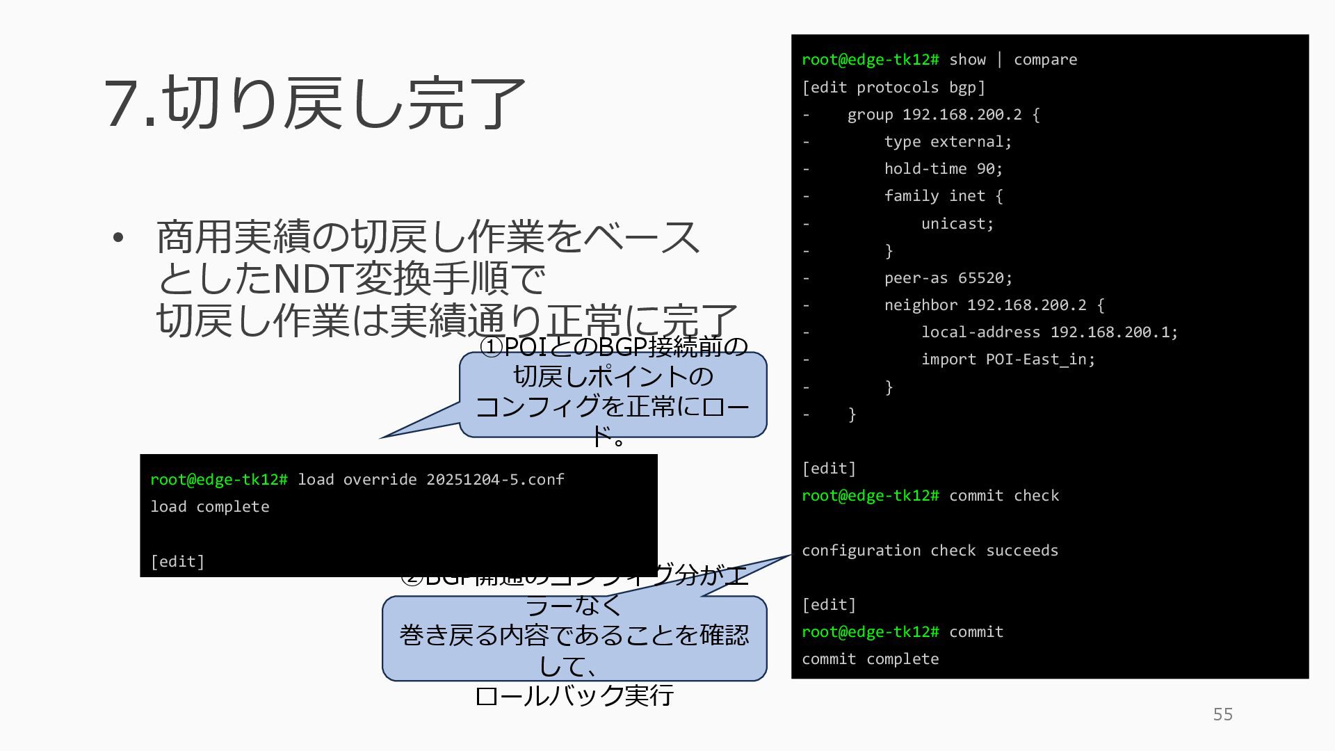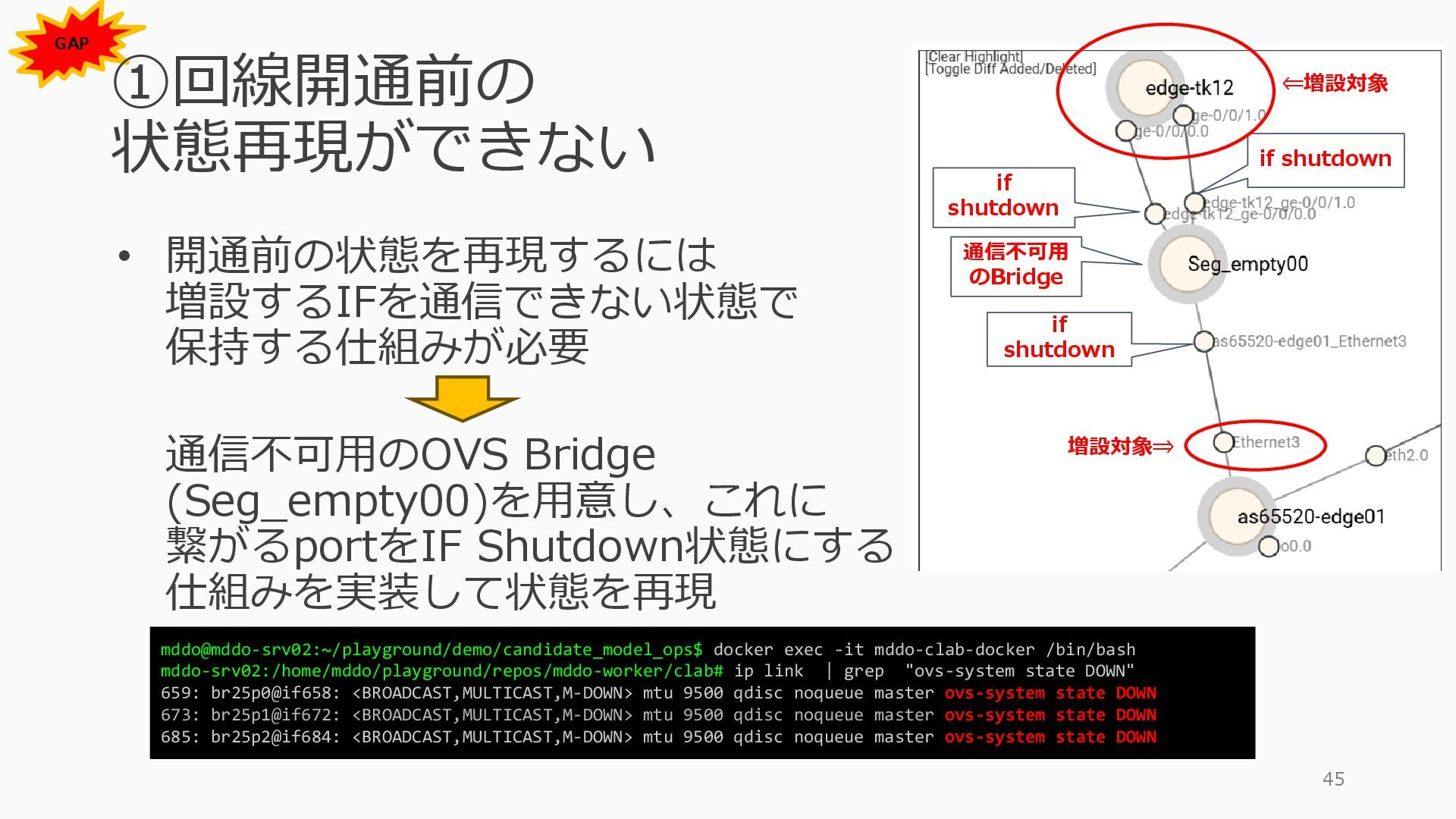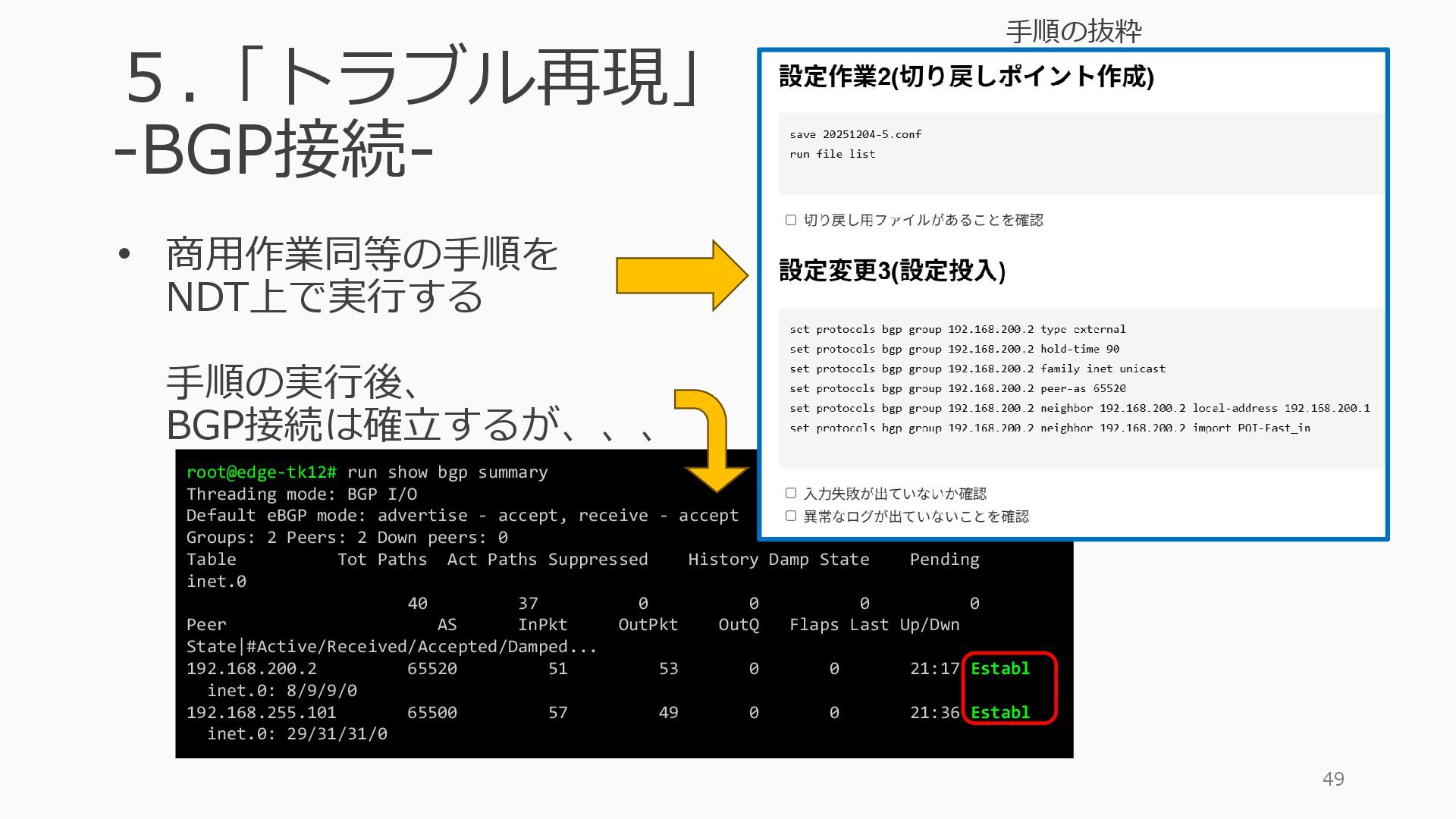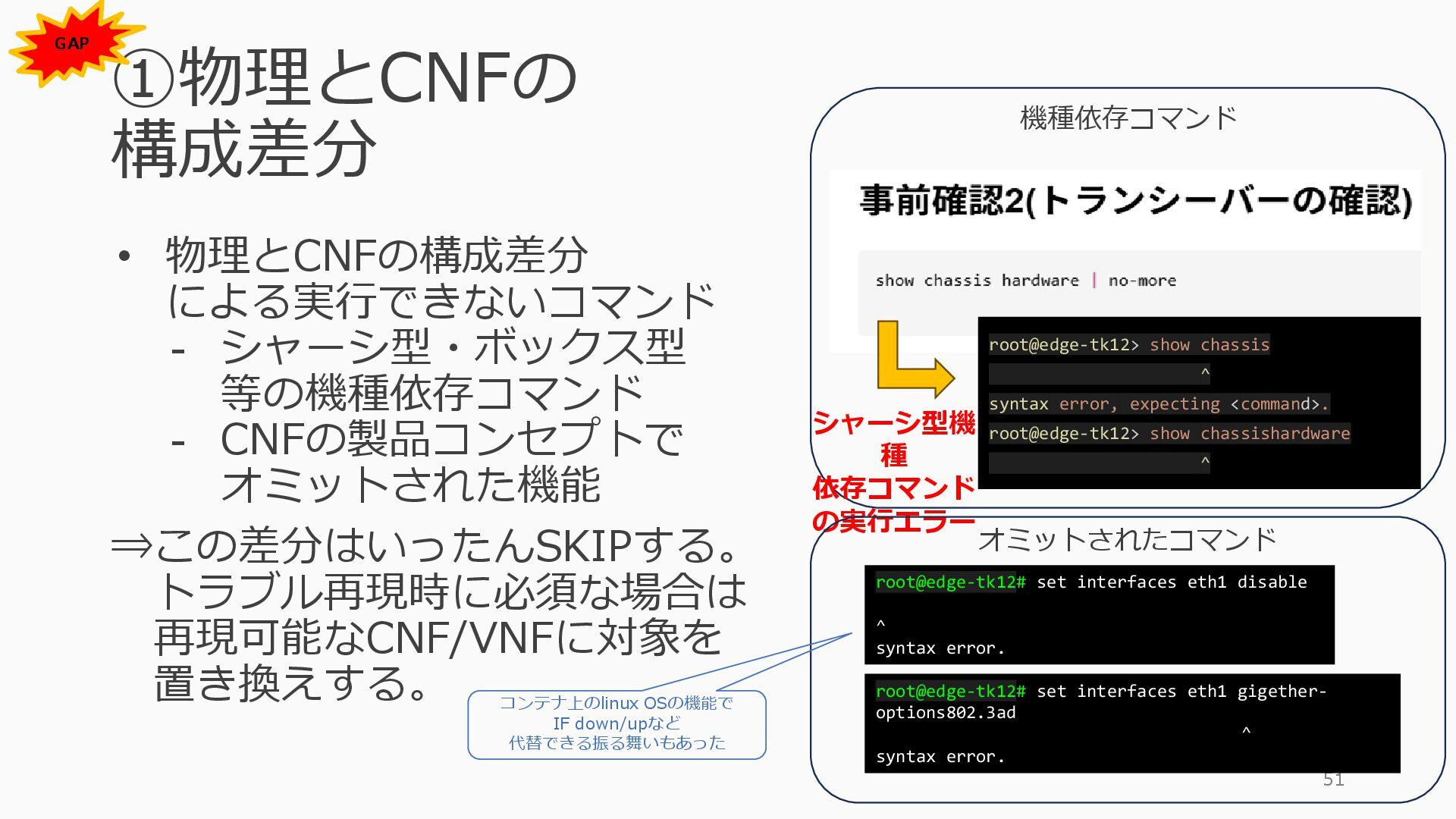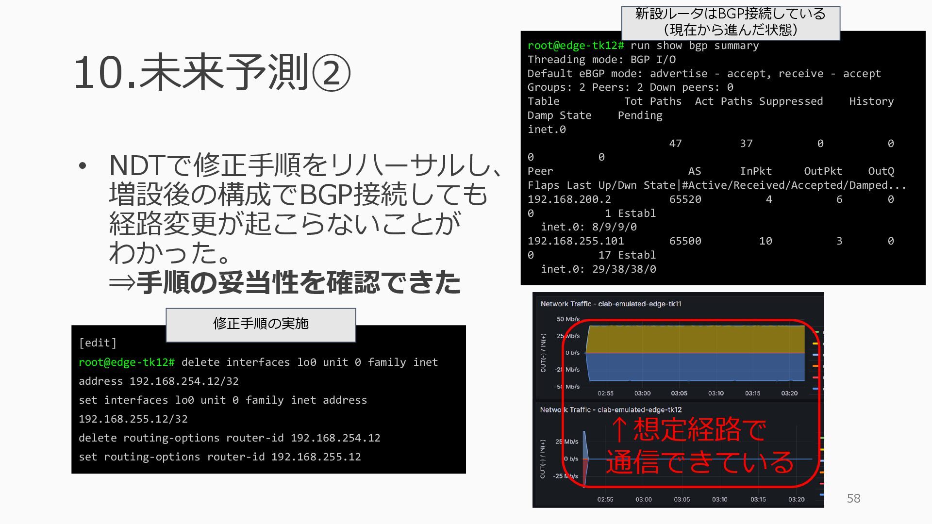 1 =============================================== Port Admin Link Port Cfg Oper LAG/ Port Port Port C/QS/S/XFP/ Id State State MTU MTU Bndl Mode Encp Type MDIMDX ------------------------------------------------------------------------------- 1/1/c1 Down Down conn 100GBASE-LR4* <省略> 1/1/c12 Up Link Up conn 100GBASE-LR4* 1/1/c12/1 Up Yes Up 8704 8704 - netw null cgige <省略> 1/1/c21 Up Link Up conn 100GBASE-LR4* 1/1/c21/1 Up Yes Up 8704 8704 - netw null cgige A:admin@edge-tk12-a# show card 1 memory-pools ================================================ Card 1 Memory Pools ================================================ Name Max Allowed Current Size Max So Far In Use ------------------------------------------------------------------------------- IOM No limit 2,159,706,112 2,161,803,264 2,144,510,160 <省略> A:admin@edge-tk12-a# show card a memory-pools ================================================= Card a Memory Pools ================================================= Name Max Allowed Current Size Max So Far In Use ------------------------------------------------------------------------------- BFD No limit 9,444,656 9,444,656 8,318,528 BGP No limit 6,291,504 6,291,504 5,015,536 l3_preallocated_resources: - type: node name: as65520-edge01 asn: 65520 interfaces: - Ethernet3 - type: node name: edge-tk12 interfaces: - 1/1/c12/1 - 1/1/c21/1 emulated_params: license: ./sros_license.txt image: localhost/nokia/srsim:25.7.R1 kind: nokia_srsim type: SR-2s components: - slot: A - slot: 1 type: xcm-2s sfm: sfm-2s env: NOKIA_SROS_CARD: xcm-2s NOKIA_SROS_MDA_1: s36-100gb-qsfp28 増設リソース にSR-SIMを指 定して 利用できる よりGAPの少 ない操作が可 能に