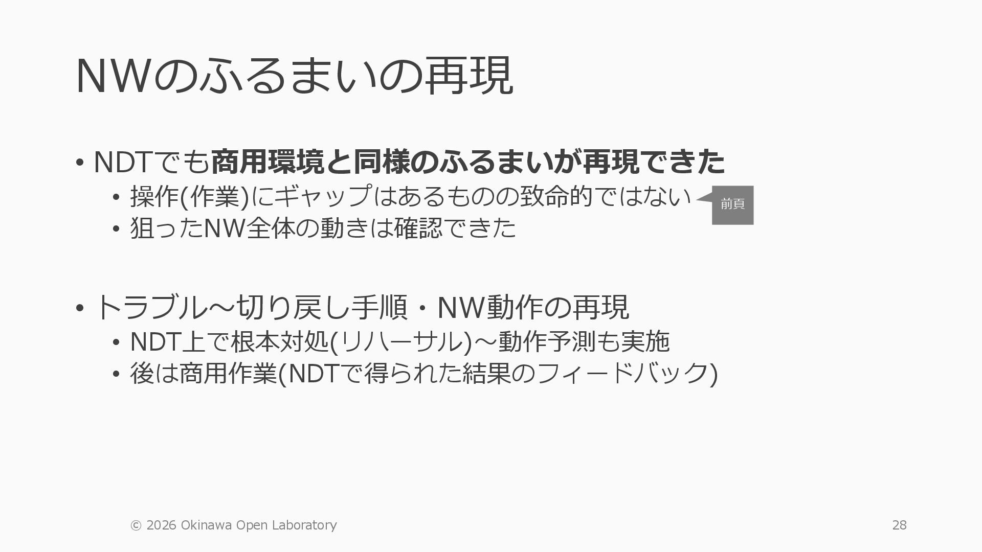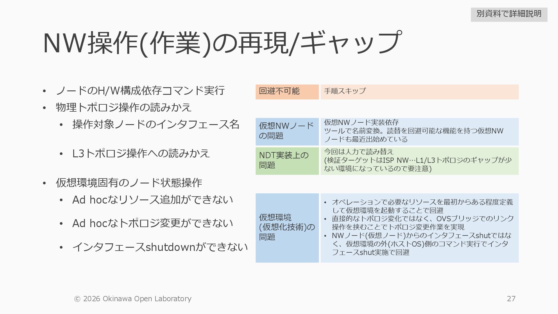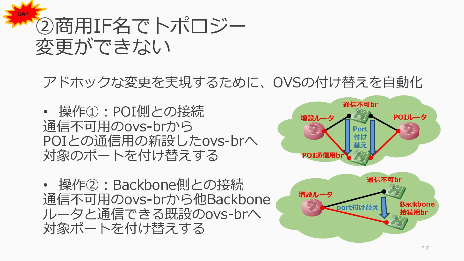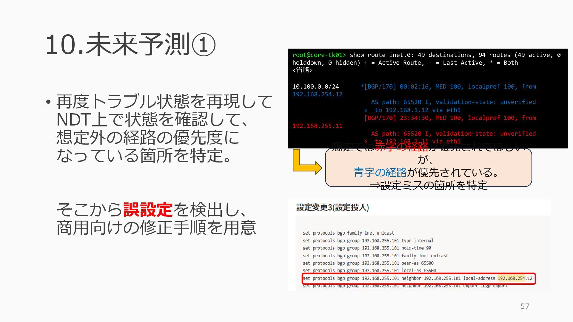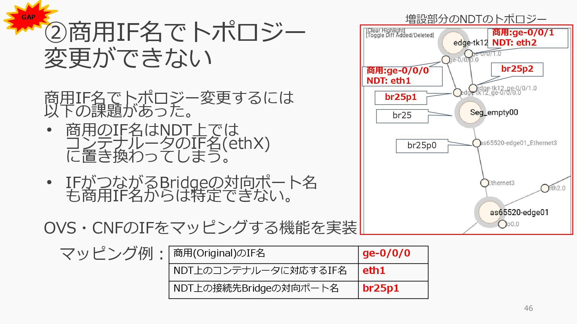 1 =============================================== Port Admin Link Port Cfg Oper LAG/ Port Port Port C/QS/S/XFP/ Id State State MTU MTU Bndl Mode Encp Type MDIMDX ------------------------------------------------------------------------------- 1/1/c1 Down Down conn 100GBASE-LR4* <省略> 1/1/c12 Up Link Up conn 100GBASE-LR4* 1/1/c12/1 Up Yes Up 8704 8704 - netw null cgige <省略> 1/1/c21 Up Link Up conn 100GBASE-LR4* 1/1/c21/1 Up Yes Up 8704 8704 - netw null cgige A:admin@edge-tk12-a# show card 1 memory-pools ================================================ Card 1 Memory Pools ================================================ Name Max Allowed Current Size Max So Far In Use ------------------------------------------------------------------------------- IOM No limit 2,159,706,112 2,161,803,264 2,144,510,160 <省略> A:admin@edge-tk12-a# show card a memory-pools ================================================= Card a Memory Pools ================================================= Name Max Allowed Current Size Max So Far In Use ------------------------------------------------------------------------------- BFD No limit 9,444,656 9,444,656 8,318,528 BGP No limit 6,291,504 6,291,504 5,015,536 l3_preallocated_resources: - type: node name: as65520-edge01 asn: 65520 interfaces: - Ethernet3 - type: node name: edge-tk12 interfaces: - 1/1/c12/1 - 1/1/c21/1 emulated_params: license: ./sros_license.txt image: localhost/nokia/srsim:25.7.R1 kind: nokia_srsim type: SR-2s components: - slot: A - slot: 1 type: xcm-2s sfm: sfm-2s env: NOKIA_SROS_CARD: xcm-2s NOKIA_SROS_MDA_1: s36-100gb-qsfp28 増設リソース にSR-SIMを指 定して 利用できる よりGAPの少 ない操作が可 能に