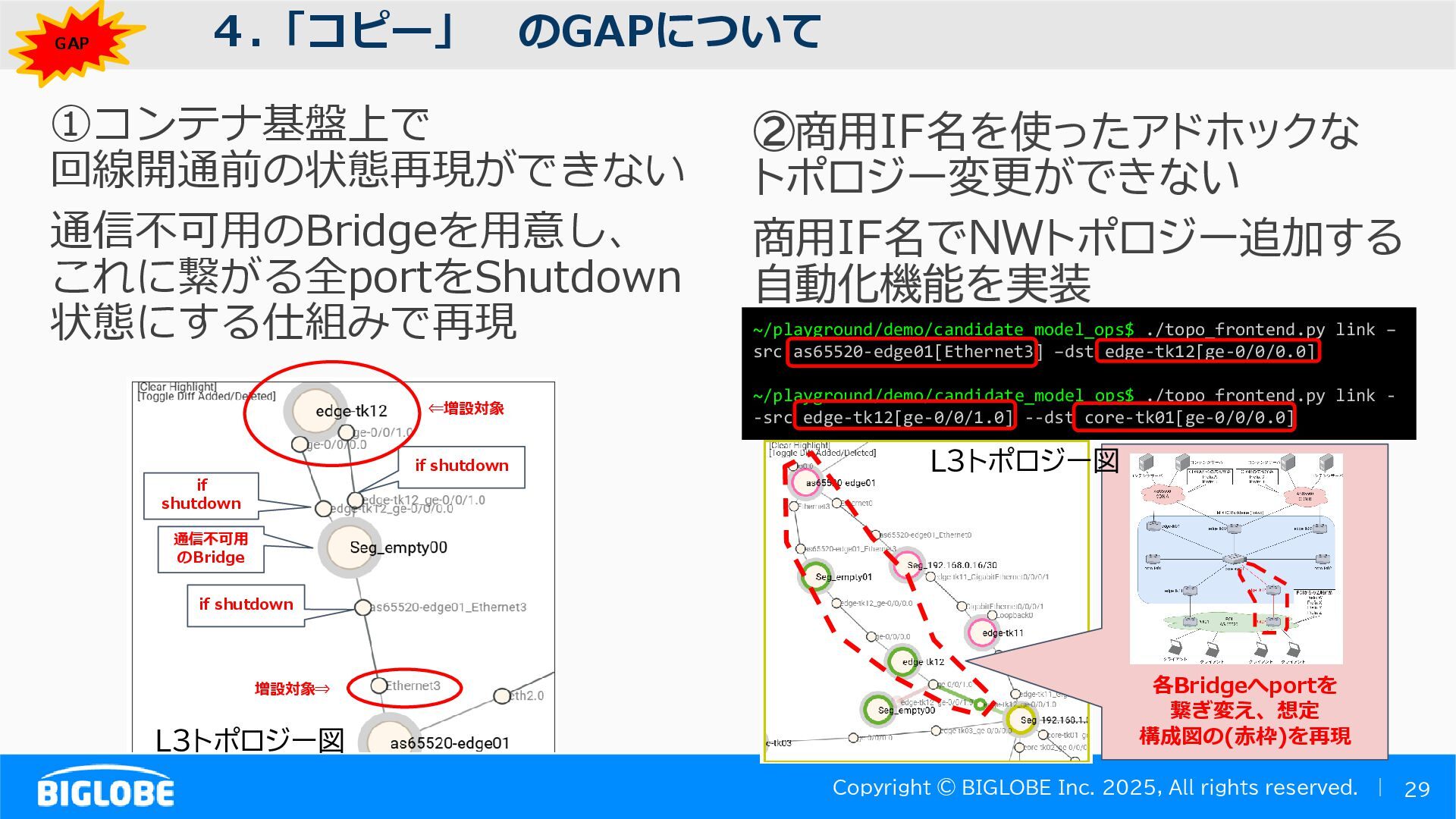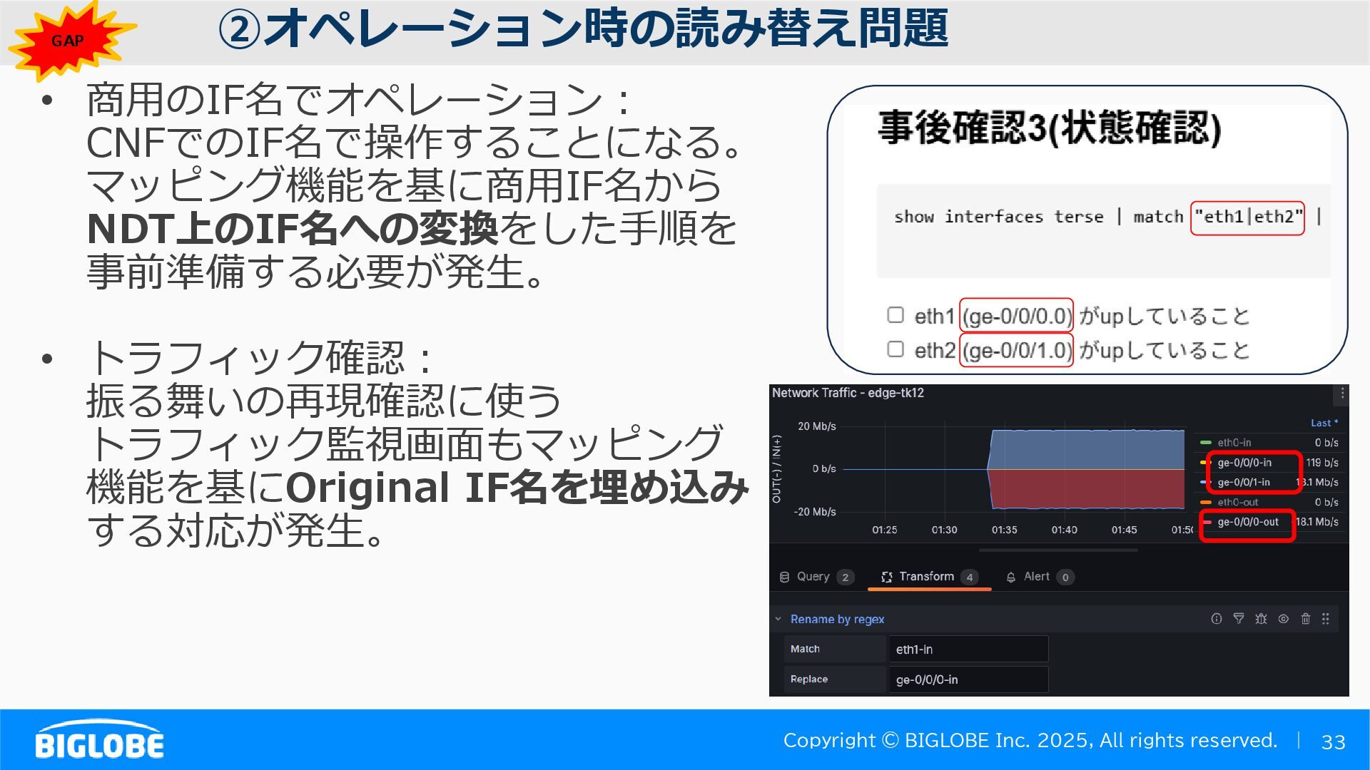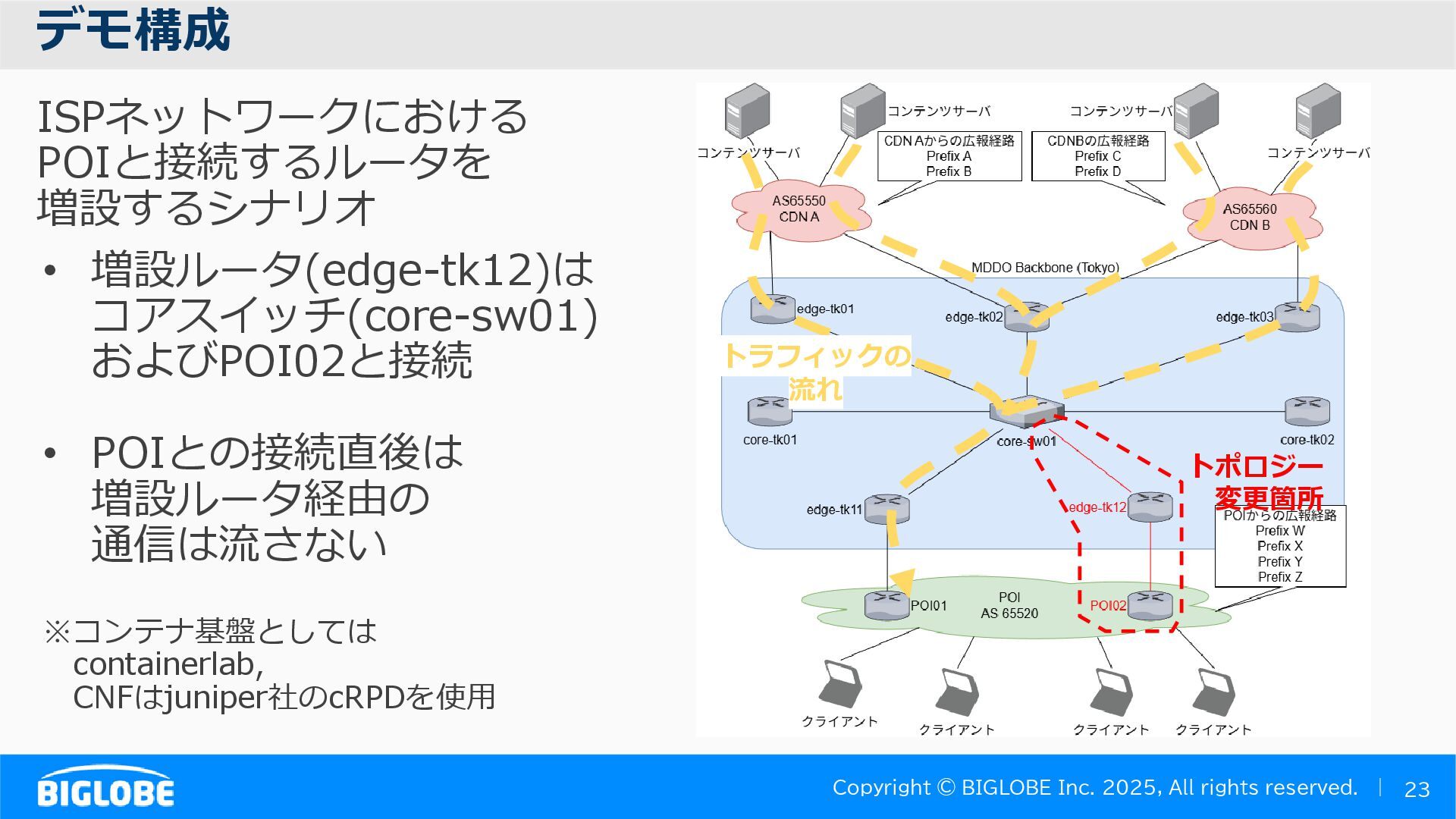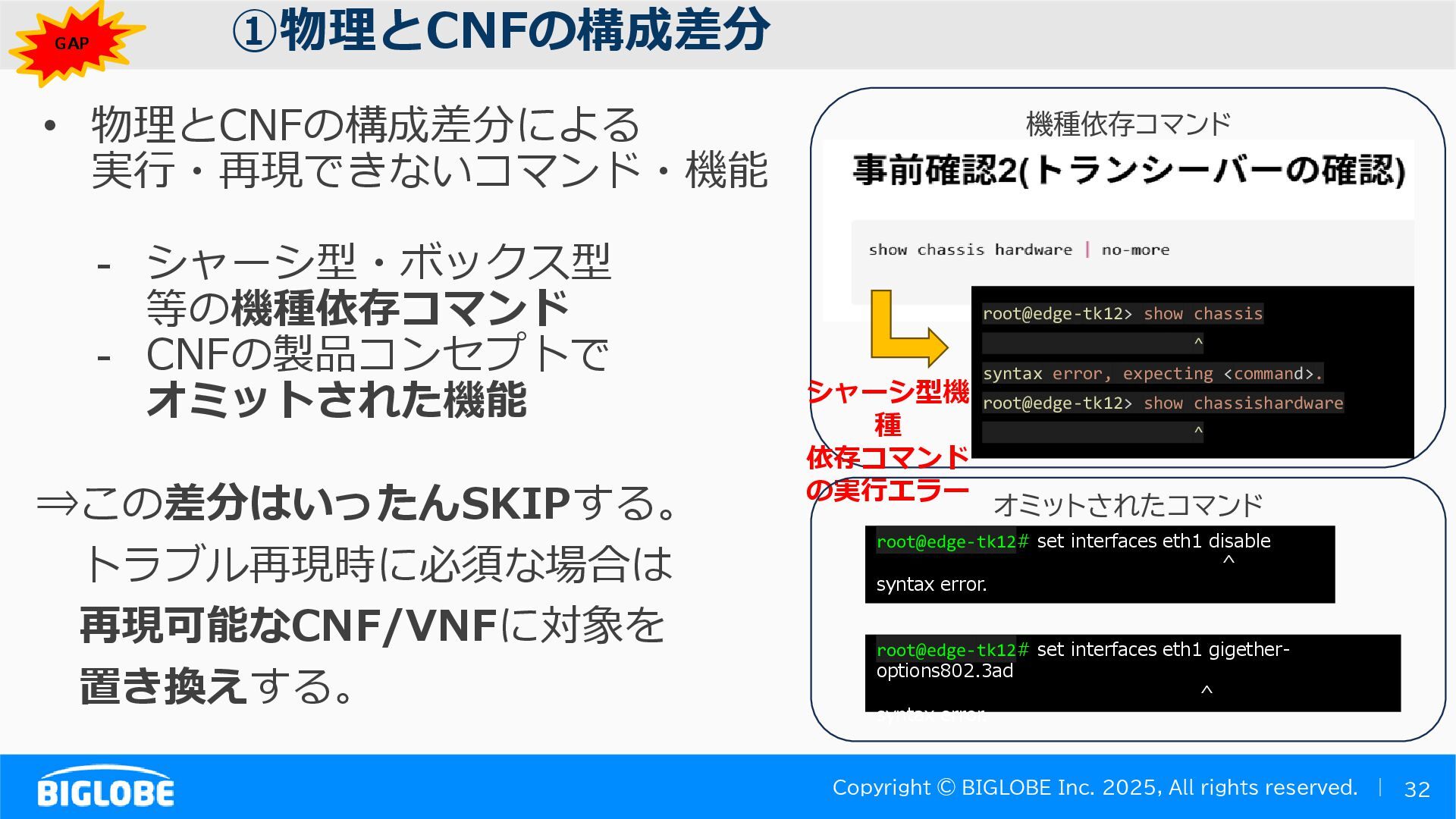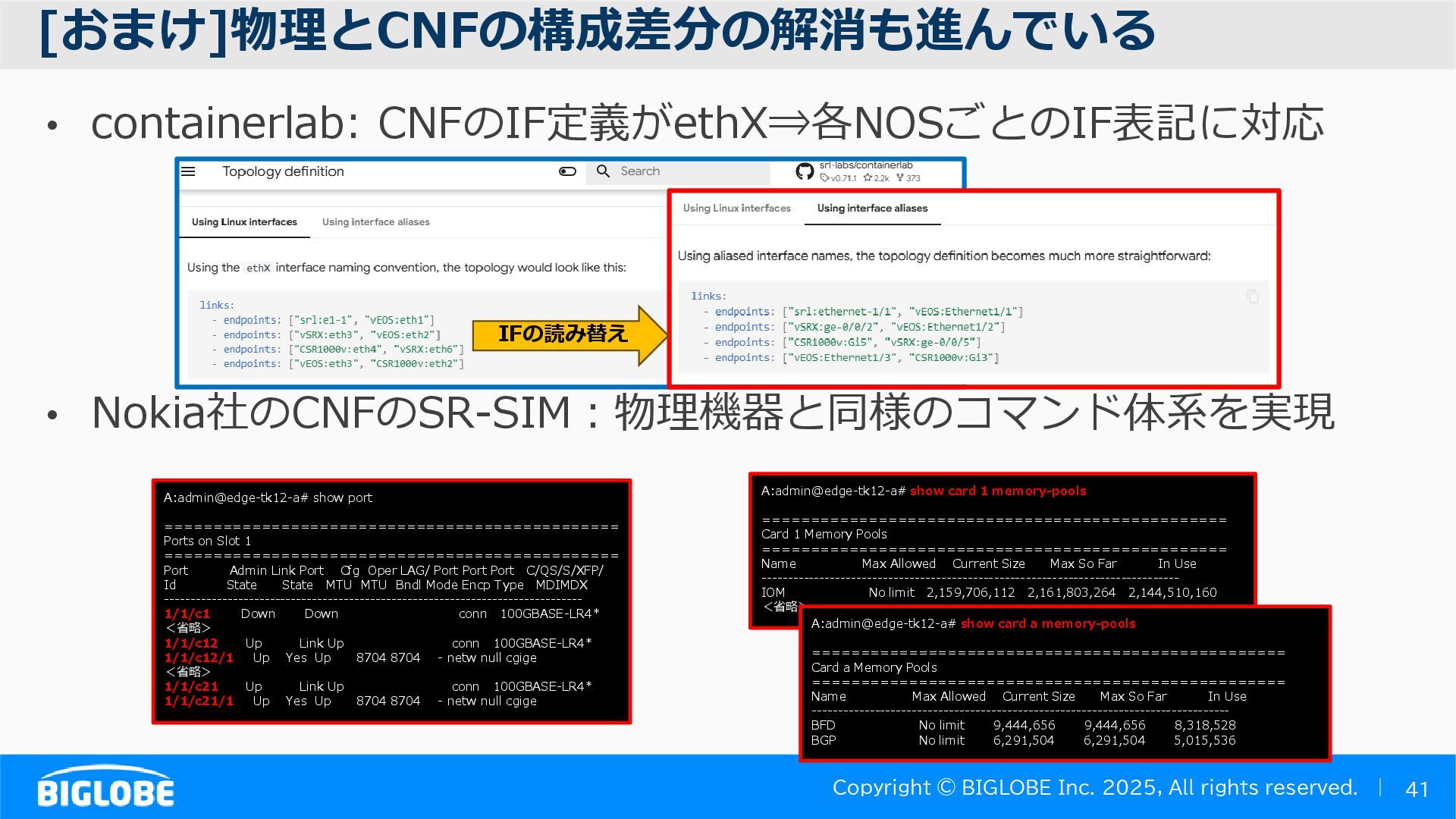 • containerlab: CNFのIF定義 ethX⇒各NOSごとのIF表記に対応 • Nokia社のCNFのSR-SIM:物 と同様のコマンド 系を実 [おまけ]物理とCNFの構成差分の解消も進んでいる IFの読み替え A:admin@edge-tk12-a# show port =============================================== Ports on Slot 1 =============================================== Port Admin Link Port Cfg Oper LAG/ Port Port Port C/QS/S/XFP/ Id State State MTU MTU Bndl Mode Encp Type MDIMDX ------------------------------------------------------------------------------- 1/1/c1 Down Down conn 100GBASE-LR4* <省略> 1/1/c12 Up Link Up conn 100GBASE-LR4* 1/1/c12/1 Up Yes Up 8704 8704 - netw null cgige <省略> 1/1/c21 Up Link Up conn 100GBASE-LR4* 1/1/c21/1 Up Yes Up 8704 8704 - netw null cgige A:admin@edge-tk12-a# show card 1 memory-pools ================================================ Card 1 Memory Pools ================================================ Name Max Allowed Current Size Max So Far In Use ------------------------------------------------------------------------------- IOM No limit 2,159,706,112 2,161,803,264 2,144,510,160 <省略> A:admin@edge-tk12-a# show card a memory-pools ================================================= Card a Memory Pools ================================================= Name Max Allowed Current Size Max So Far In Use ------------------------------------------------------------------------------- BFD No limit 9,444,656 9,444,656 8,318,528 BGP No limit 6,291,504 6,291,504 5,015,536