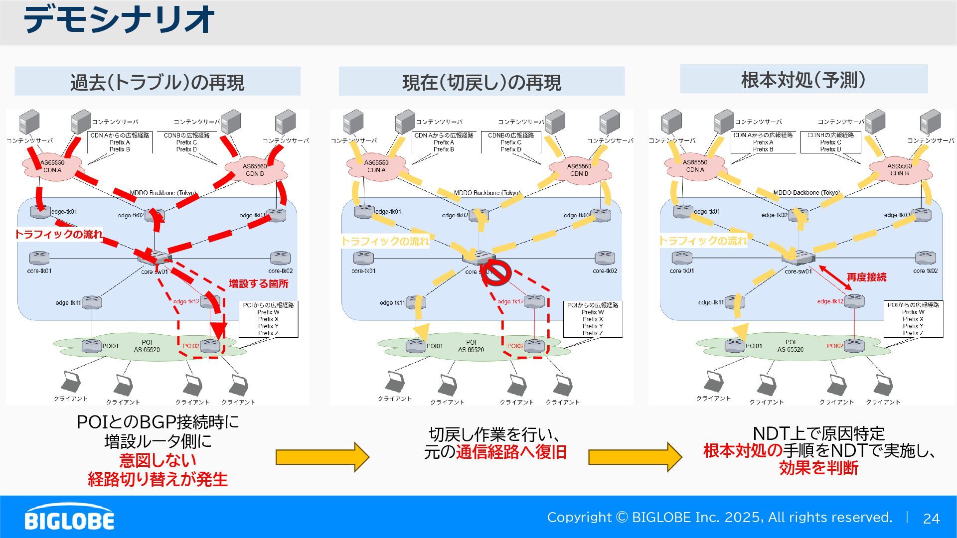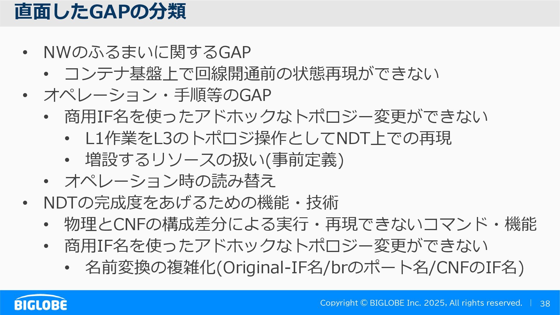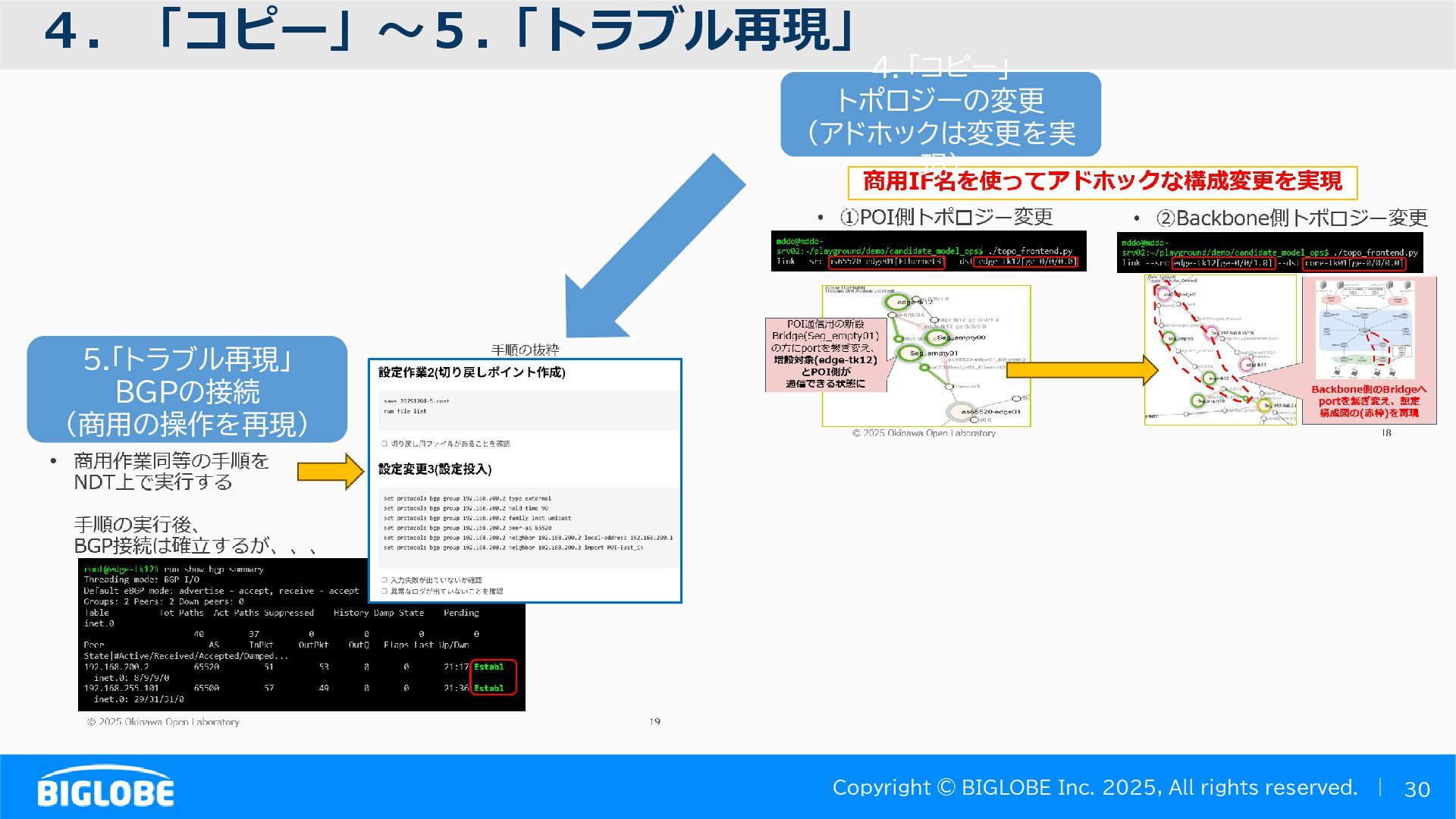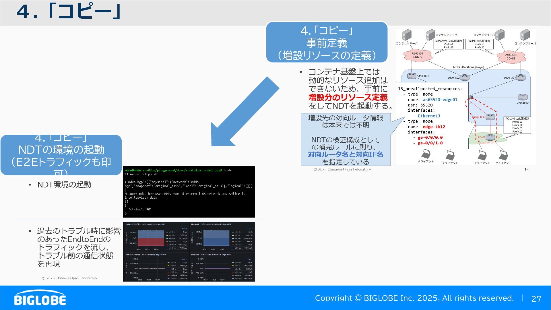 • containerlab: CNFのIF定義 ethX⇒各NOSごとのIF表記に対応 • Nokia社のCNFのSR-SIM:物 と同様のコマンド 系を実 [おまけ]物理とCNFの構成差分の解消も進んでいる IFの読み替え A:admin@edge-tk12-a# show port =============================================== Ports on Slot 1 =============================================== Port Admin Link Port Cfg Oper LAG/ Port Port Port C/QS/S/XFP/ Id State State MTU MTU Bndl Mode Encp Type MDIMDX ------------------------------------------------------------------------------- 1/1/c1 Down Down conn 100GBASE-LR4* <省略> 1/1/c12 Up Link Up conn 100GBASE-LR4* 1/1/c12/1 Up Yes Up 8704 8704 - netw null cgige <省略> 1/1/c21 Up Link Up conn 100GBASE-LR4* 1/1/c21/1 Up Yes Up 8704 8704 - netw null cgige A:admin@edge-tk12-a# show card 1 memory-pools ================================================ Card 1 Memory Pools ================================================ Name Max Allowed Current Size Max So Far In Use ------------------------------------------------------------------------------- IOM No limit 2,159,706,112 2,161,803,264 2,144,510,160 <省略> A:admin@edge-tk12-a# show card a memory-pools ================================================= Card a Memory Pools ================================================= Name Max Allowed Current Size Max So Far In Use ------------------------------------------------------------------------------- BFD No limit 9,444,656 9,444,656 8,318,528 BGP No limit 6,291,504 6,291,504 5,015,536