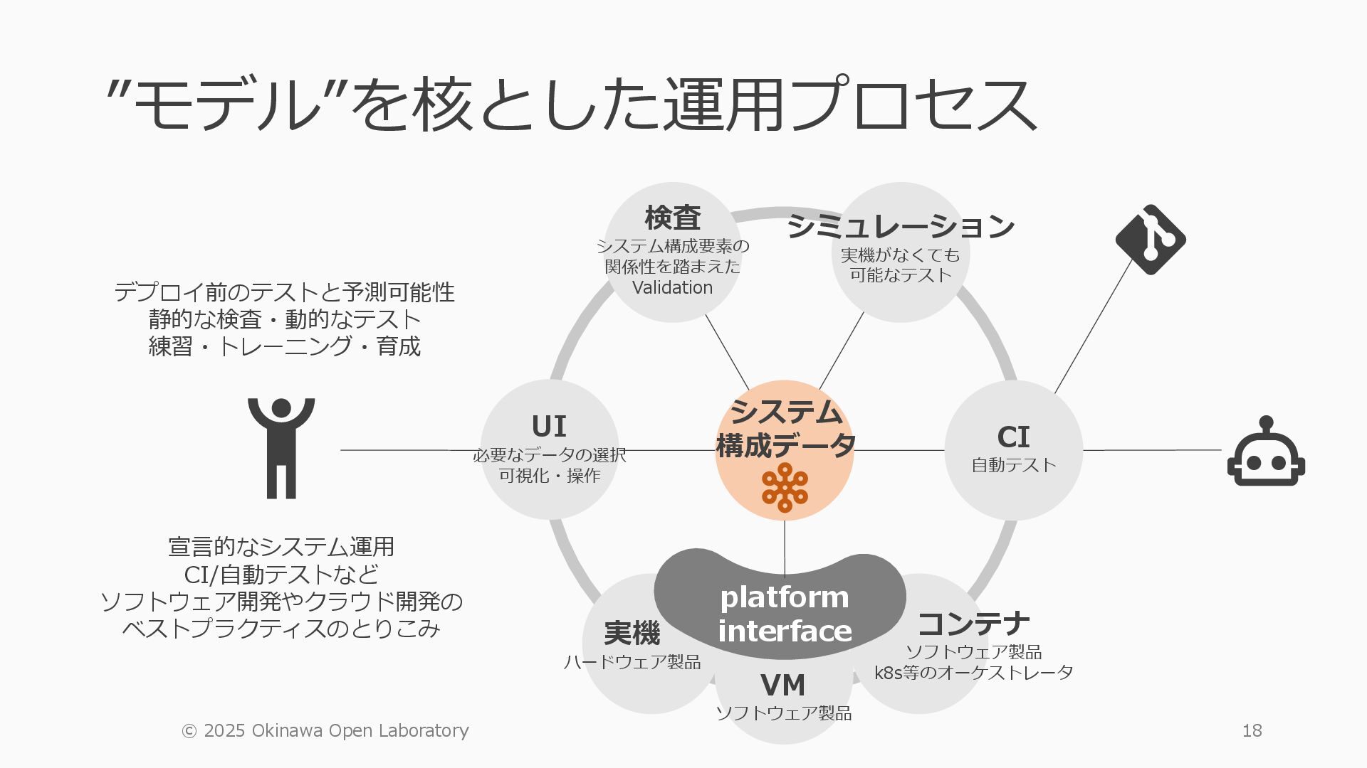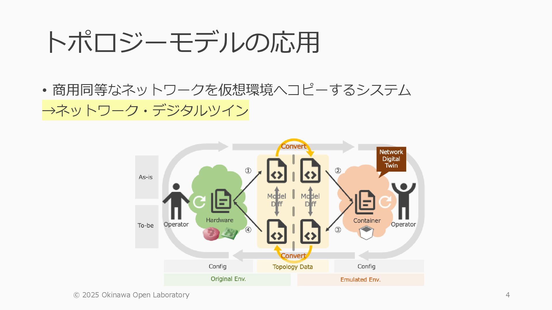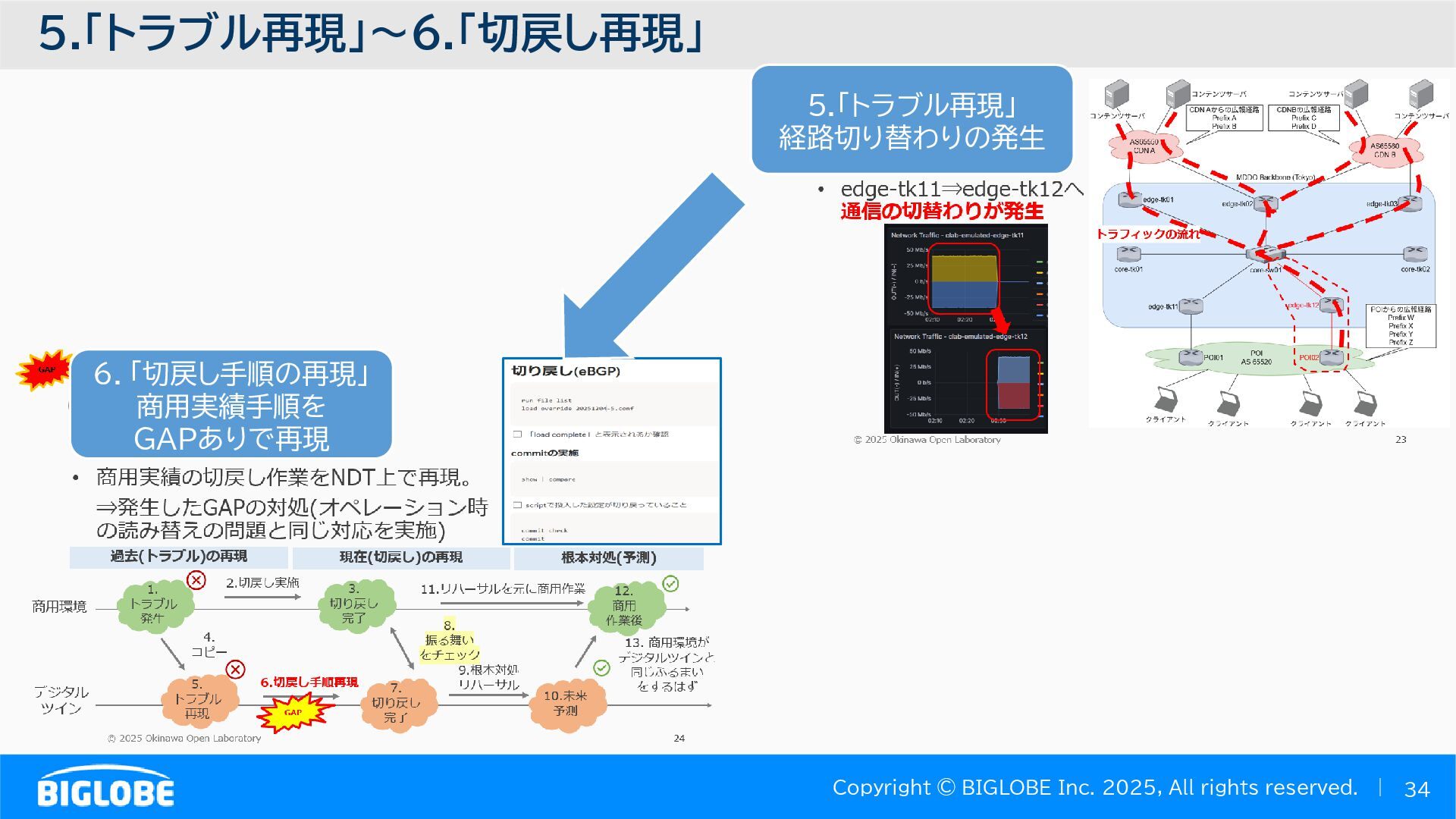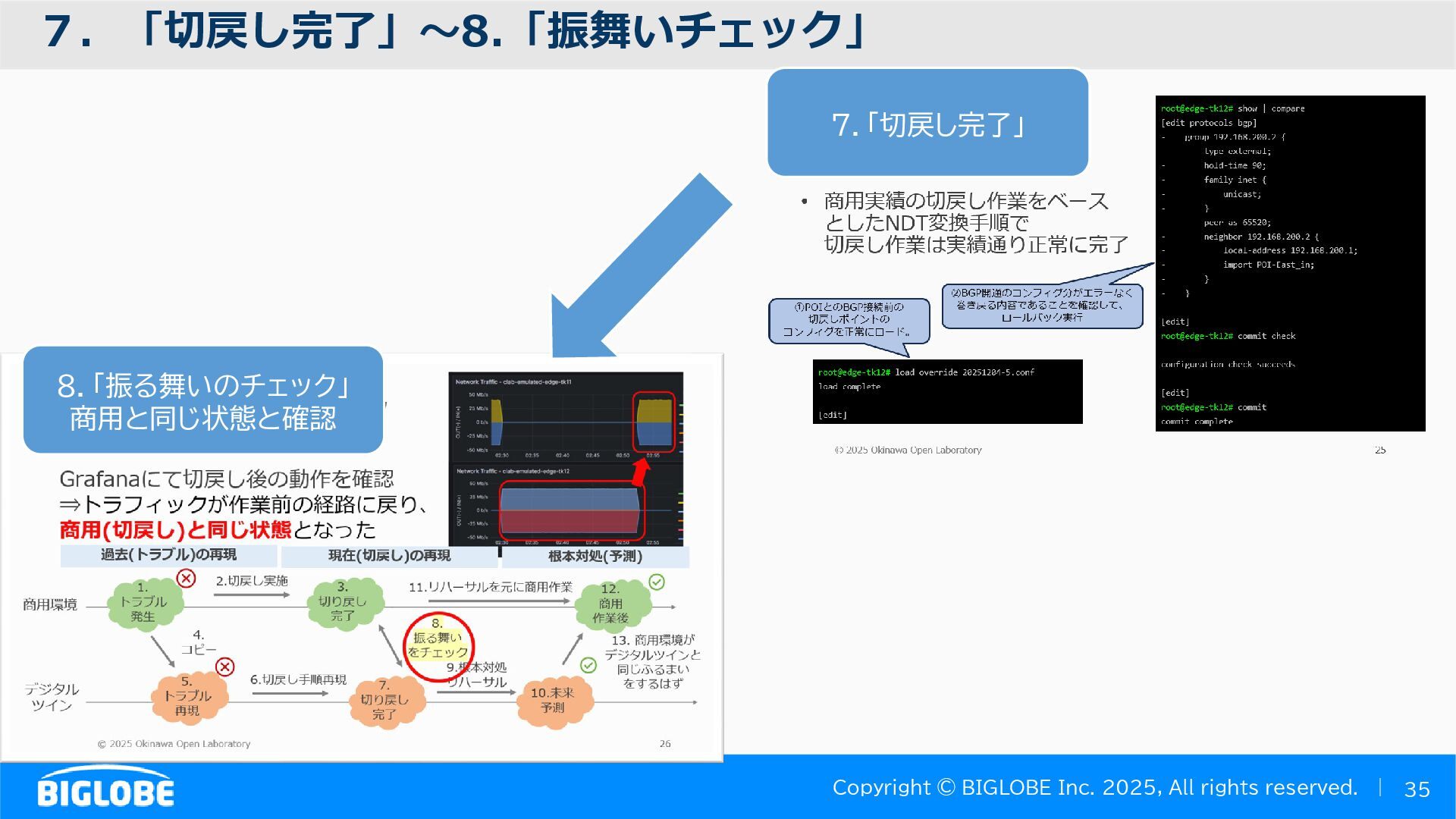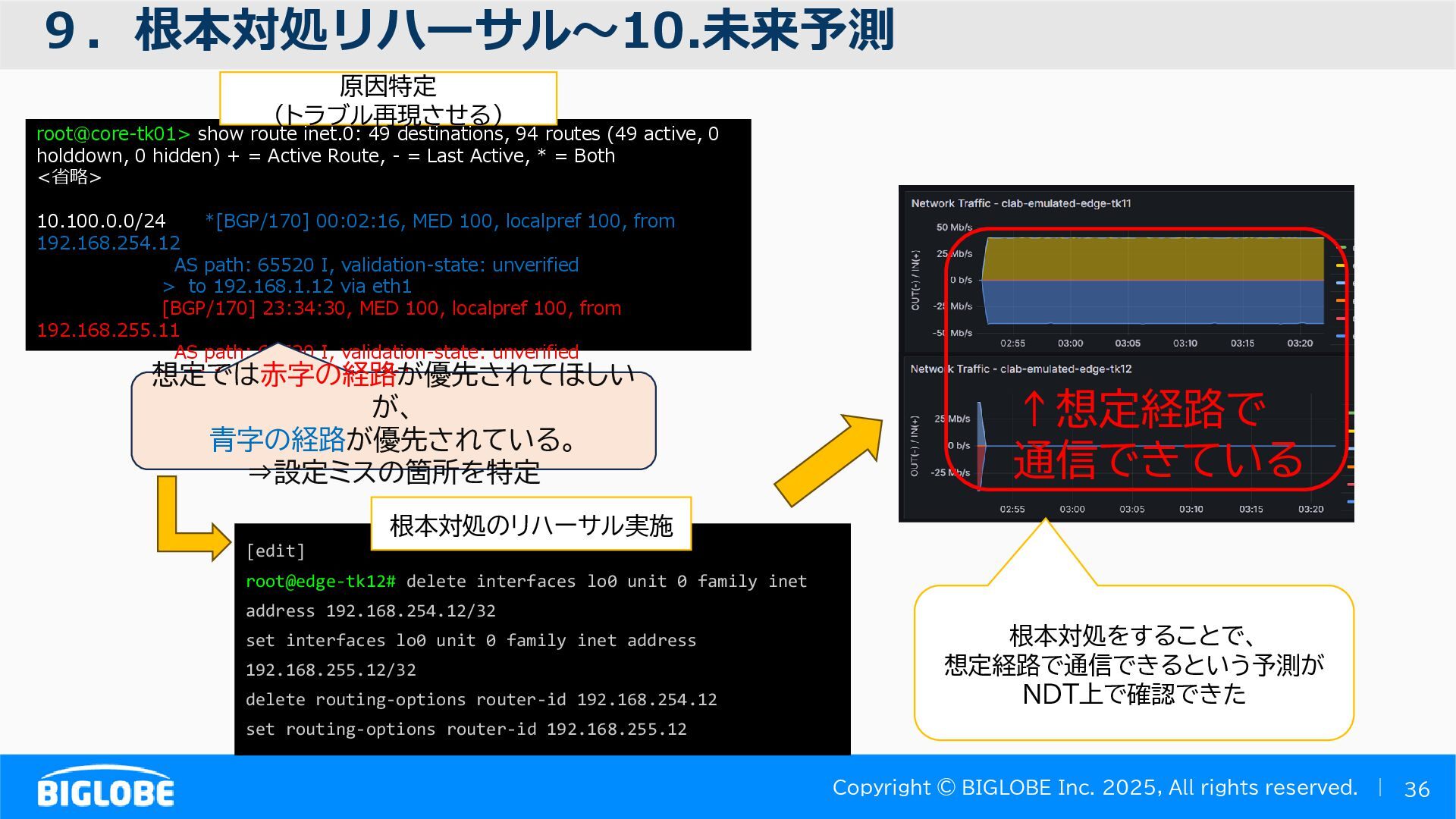 • containerlab: CNFのIF定義 ethX⇒各NOSごとのIF表記に対応 • Nokia社のCNFのSR-SIM:物 と同様のコマンド 系を実 [おまけ]物理とCNFの構成差分の解消も進んでいる IFの読み替え A:admin@edge-tk12-a# show port =============================================== Ports on Slot 1 =============================================== Port Admin Link Port Cfg Oper LAG/ Port Port Port C/QS/S/XFP/ Id State State MTU MTU Bndl Mode Encp Type MDIMDX ------------------------------------------------------------------------------- 1/1/c1 Down Down conn 100GBASE-LR4* <省略> 1/1/c12 Up Link Up conn 100GBASE-LR4* 1/1/c12/1 Up Yes Up 8704 8704 - netw null cgige <省略> 1/1/c21 Up Link Up conn 100GBASE-LR4* 1/1/c21/1 Up Yes Up 8704 8704 - netw null cgige A:admin@edge-tk12-a# show card 1 memory-pools ================================================ Card 1 Memory Pools ================================================ Name Max Allowed Current Size Max So Far In Use ------------------------------------------------------------------------------- IOM No limit 2,159,706,112 2,161,803,264 2,144,510,160 <省略> A:admin@edge-tk12-a# show card a memory-pools ================================================= Card a Memory Pools ================================================= Name Max Allowed Current Size Max So Far In Use ------------------------------------------------------------------------------- BFD No limit 9,444,656 9,444,656 8,318,528 BGP No limit 6,291,504 6,291,504 5,015,536