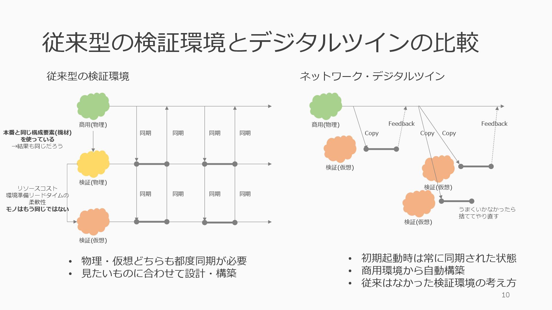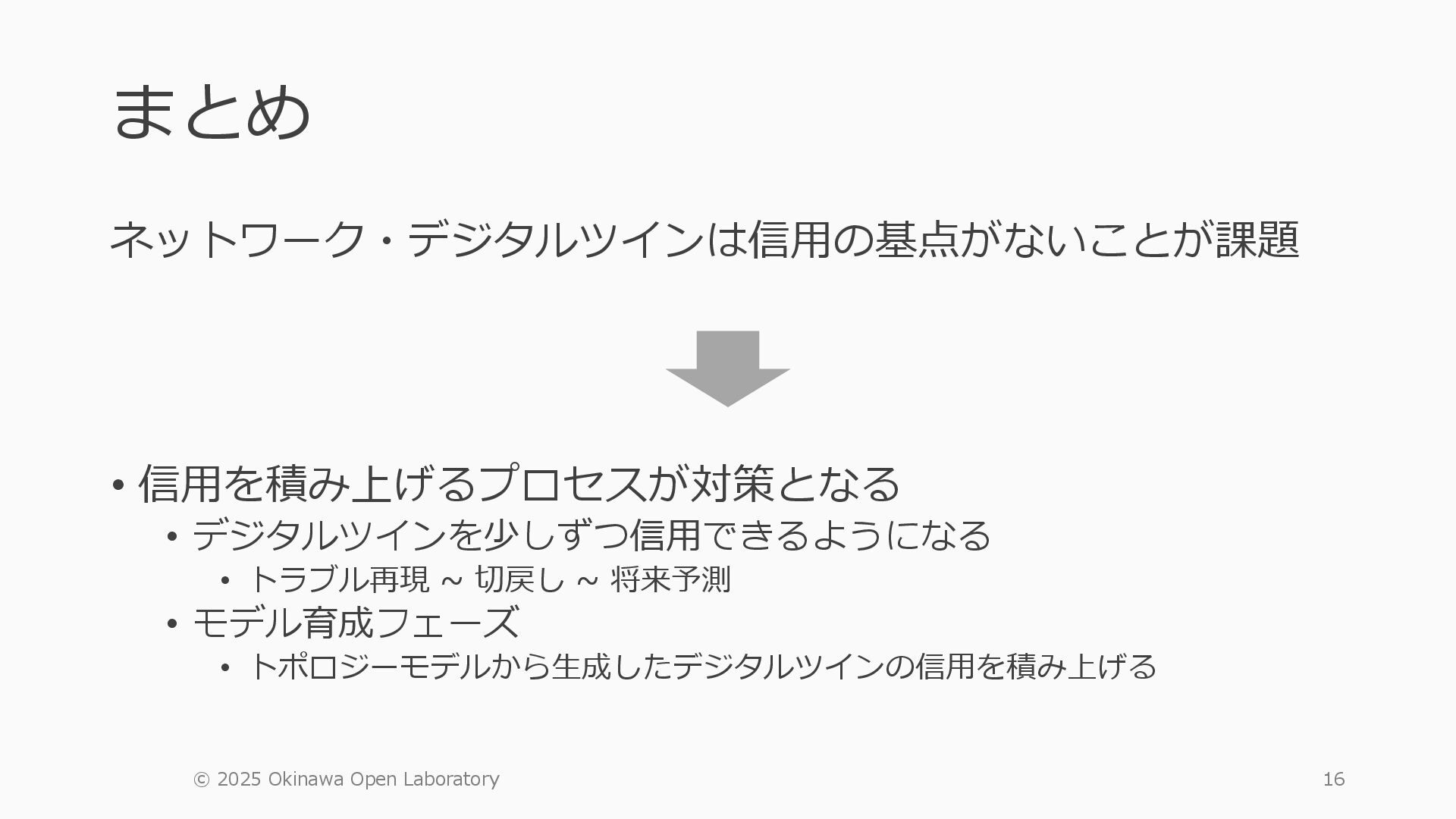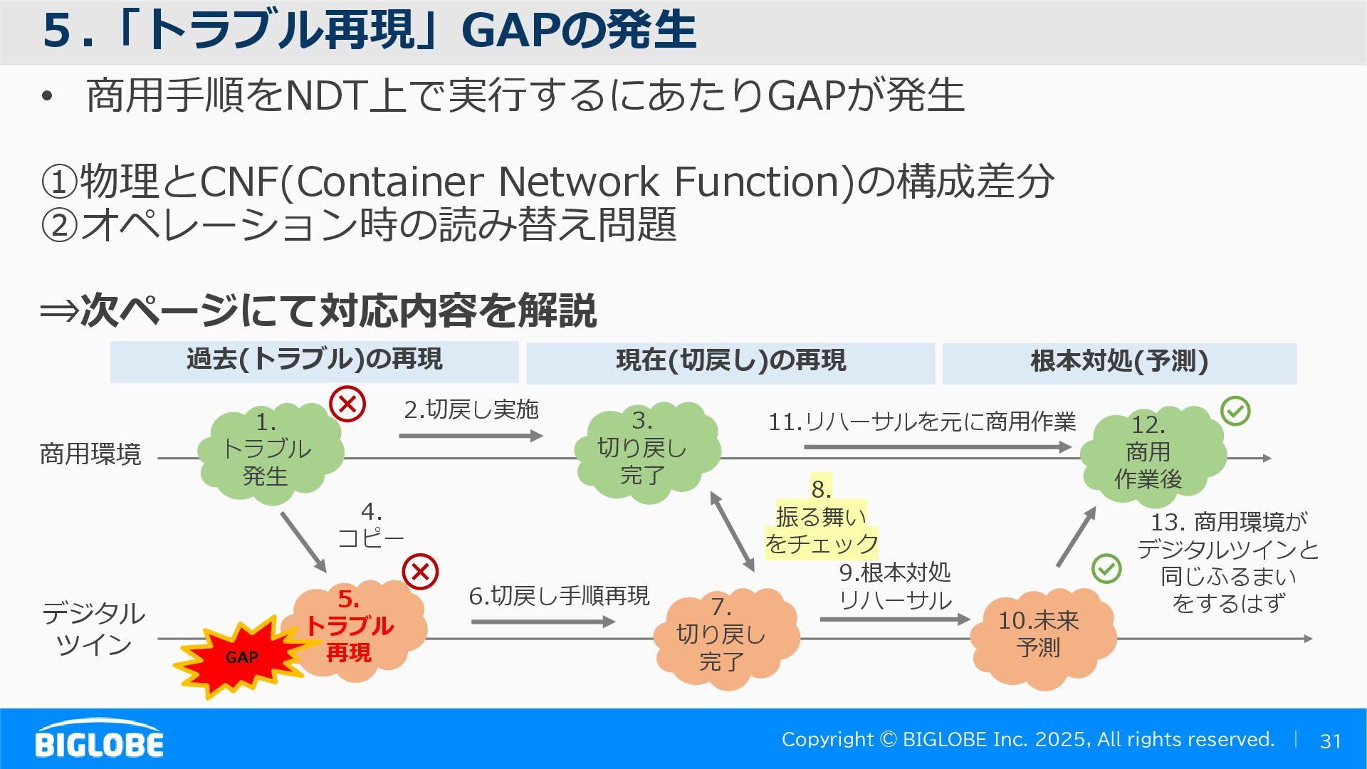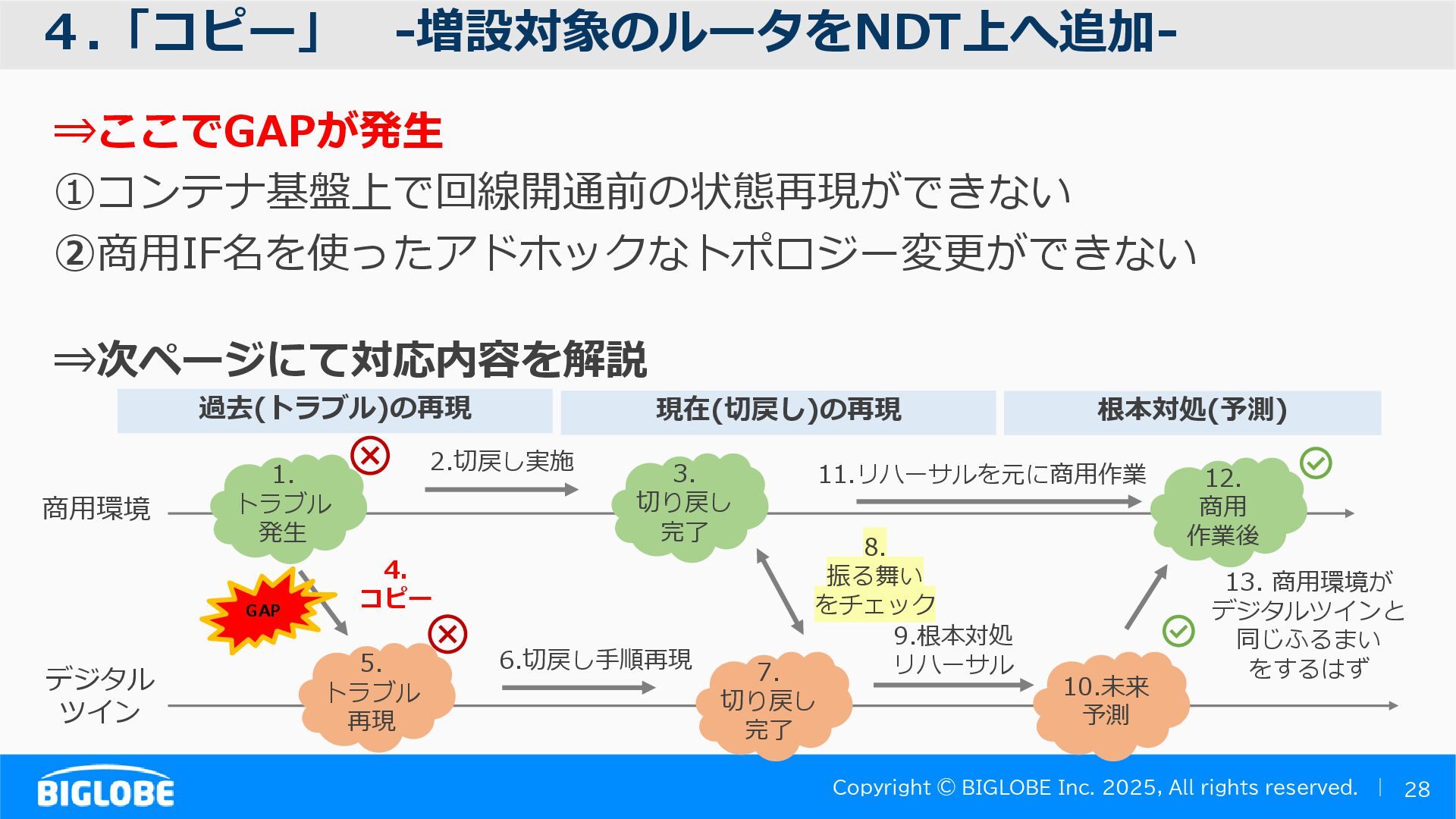 • containerlab: CNFのIF定義 ethX⇒各NOSごとのIF表記に対応 • Nokia社のCNFのSR-SIM:物 と同様のコマンド 系を実 [おまけ]物理とCNFの構成差分の解消も進んでいる IFの読み替え A:admin@edge-tk12-a# show port =============================================== Ports on Slot 1 =============================================== Port Admin Link Port Cfg Oper LAG/ Port Port Port C/QS/S/XFP/ Id State State MTU MTU Bndl Mode Encp Type MDIMDX ------------------------------------------------------------------------------- 1/1/c1 Down Down conn 100GBASE-LR4* <省略> 1/1/c12 Up Link Up conn 100GBASE-LR4* 1/1/c12/1 Up Yes Up 8704 8704 - netw null cgige <省略> 1/1/c21 Up Link Up conn 100GBASE-LR4* 1/1/c21/1 Up Yes Up 8704 8704 - netw null cgige A:admin@edge-tk12-a# show card 1 memory-pools ================================================ Card 1 Memory Pools ================================================ Name Max Allowed Current Size Max So Far In Use ------------------------------------------------------------------------------- IOM No limit 2,159,706,112 2,161,803,264 2,144,510,160 <省略> A:admin@edge-tk12-a# show card a memory-pools ================================================= Card a Memory Pools ================================================= Name Max Allowed Current Size Max So Far In Use ------------------------------------------------------------------------------- BFD No limit 9,444,656 9,444,656 8,318,528 BGP No limit 6,291,504 6,291,504 5,015,536