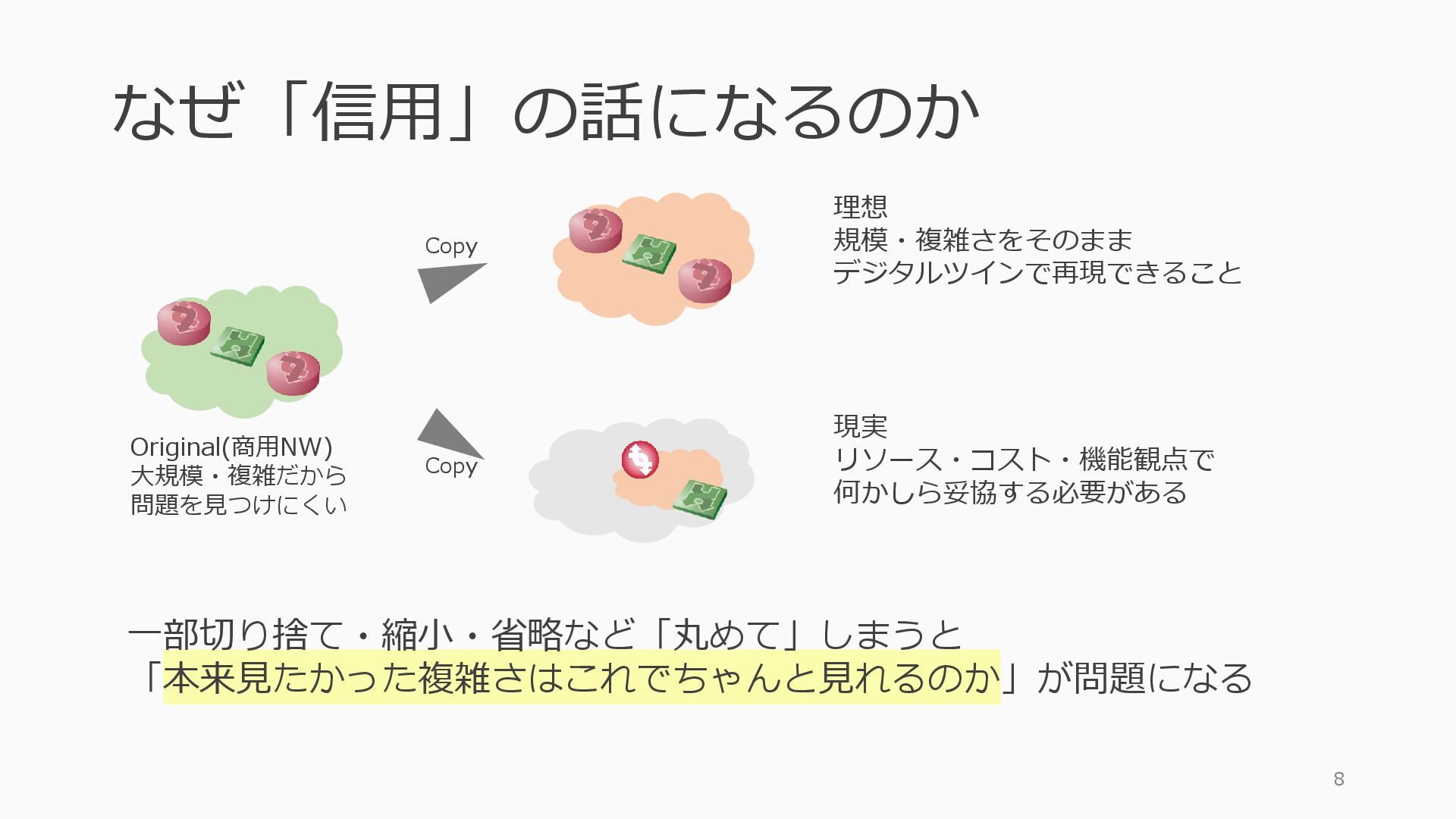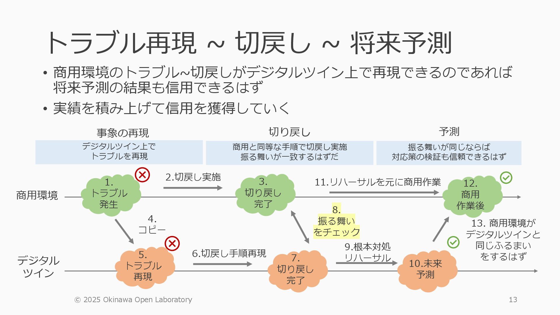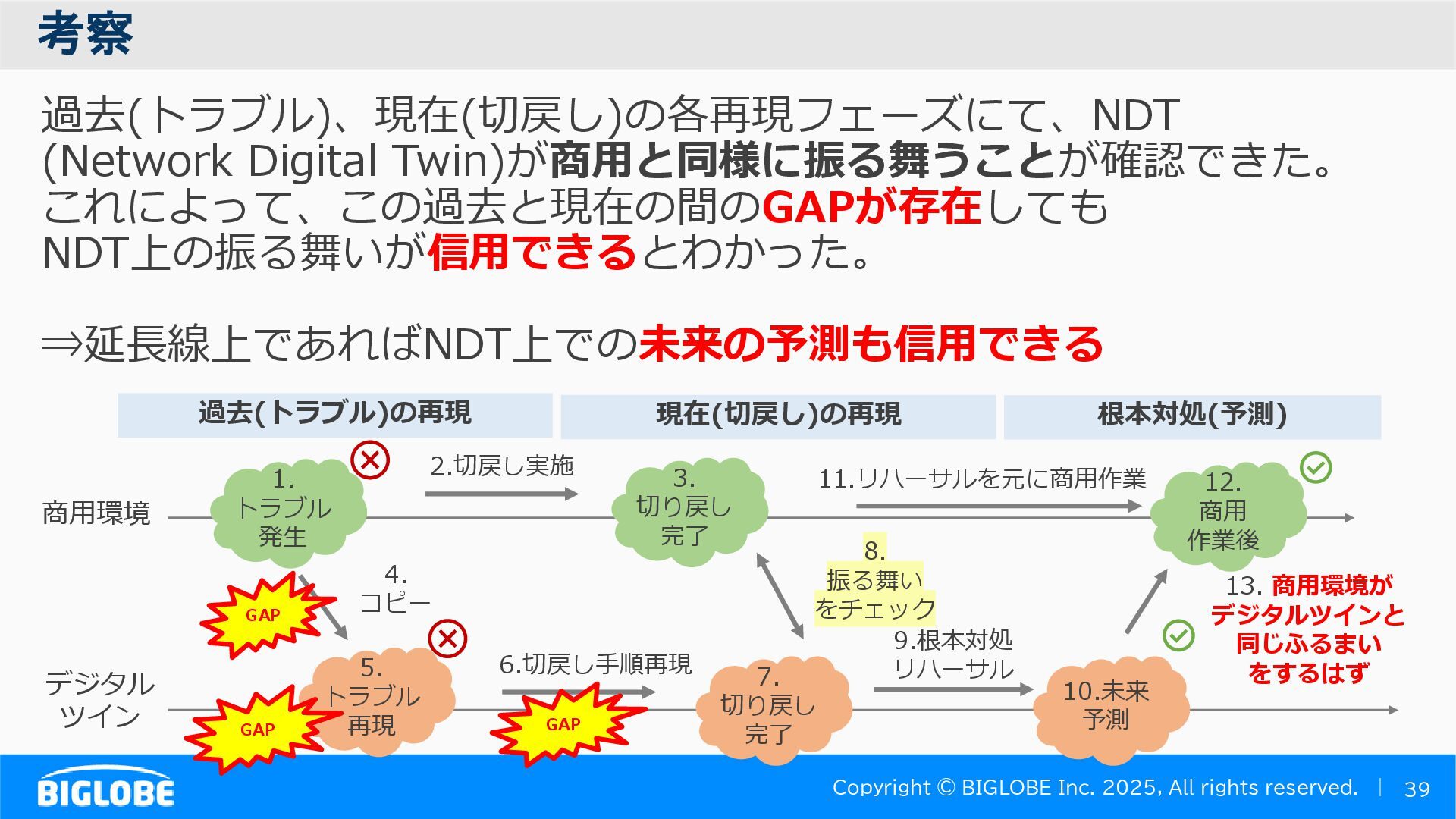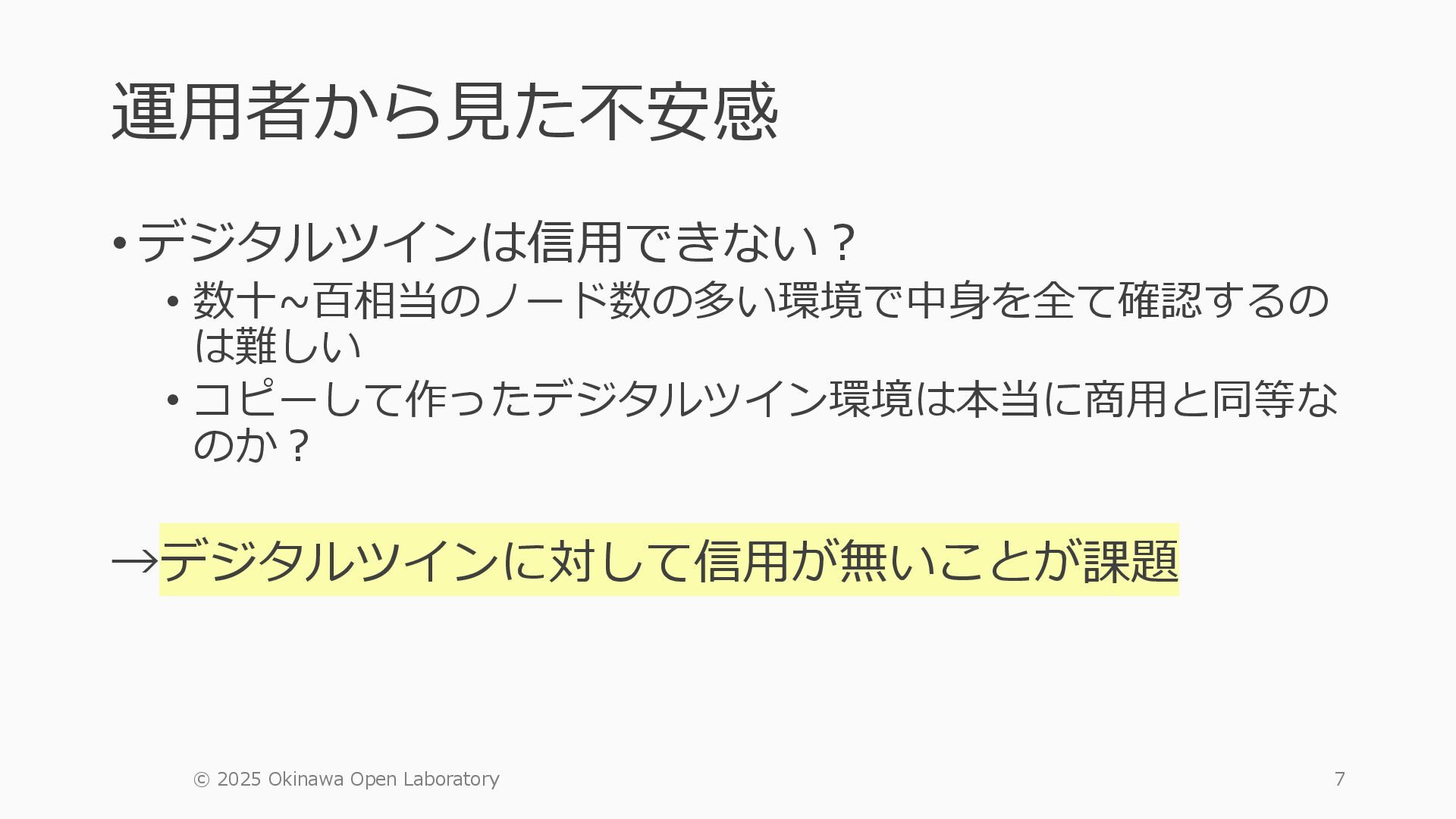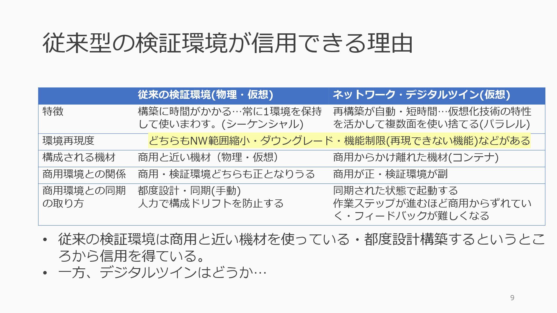 • containerlab: CNFのIF定義 ethX⇒各NOSごとのIF表記に対応 • Nokia社のCNFのSR-SIM:物 と同様のコマンド 系を実 [おまけ]物理とCNFの構成差分の解消も進んでいる IFの読み替え A:admin@edge-tk12-a# show port =============================================== Ports on Slot 1 =============================================== Port Admin Link Port Cfg Oper LAG/ Port Port Port C/QS/S/XFP/ Id State State MTU MTU Bndl Mode Encp Type MDIMDX ------------------------------------------------------------------------------- 1/1/c1 Down Down conn 100GBASE-LR4* <省略> 1/1/c12 Up Link Up conn 100GBASE-LR4* 1/1/c12/1 Up Yes Up 8704 8704 - netw null cgige <省略> 1/1/c21 Up Link Up conn 100GBASE-LR4* 1/1/c21/1 Up Yes Up 8704 8704 - netw null cgige A:admin@edge-tk12-a# show card 1 memory-pools ================================================ Card 1 Memory Pools ================================================ Name Max Allowed Current Size Max So Far In Use ------------------------------------------------------------------------------- IOM No limit 2,159,706,112 2,161,803,264 2,144,510,160 <省略> A:admin@edge-tk12-a# show card a memory-pools ================================================= Card a Memory Pools ================================================= Name Max Allowed Current Size Max So Far In Use ------------------------------------------------------------------------------- BFD No limit 9,444,656 9,444,656 8,318,528 BGP No limit 6,291,504 6,291,504 5,015,536