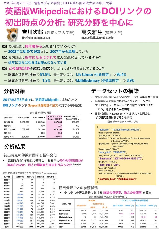 [email protected] [email protected] ߴٱխੜ ஜେֶ RQ1 ࢀরهड़Կࠒ͔ΒՃ͞Ε͍ͯΔͷ͔ ˠ 2002ʹॳΊͯՃ͞Εɺ2007͔Βٸ૿͍ͯ͠Δ RQ2 ࢀরهड़ۙʹͳΔʹͭΕͯΜʹՃ͞Ε͍ͯΔͷ͔ ˠ ۙʹͳΕͳΔ΄ͲΜʹͳ͍ͬͯΔ RQ3 Ͳͷݚڀͷࡶࢽจ͕ɺͲΕ͘Β͍ࢀর͞Ε͍ͯΔͷ͔ ˠ ࡶࢽͷࢀরશମͰ 81.8%ɺ࠷ߴ͍ͷʮLife Science ੜ໋Պֶ ʯͰ 96.4% ˠ จͷࢀরશମͰ 1.2%ɺ࠷ߴ͍ͷʮMultidisciplinary ଟྖҬՊֶ ʯͰ 3.9% ද3: ࢀরهड़ͷՃ݅ͷܦมԽ ද2: ࢀরهड़ͷՃ݅ͷܦมԽ ߲ 2002 1 0.0 1 0 2003 2 0.0 3 2 2004 64 0.0 67 11 2005 313 0.0 380 70 2006 3,779 0.4 4,159 436 2007 55,544 5.6 59,703 1,152 2008 99,317 10.0 159,020 2,128 2009 99,526 10.0 258,546 2,848 2010 87,240 8.7 345,786 3,361 2011 71,526 7.2 417,312 4,373 2012 71,605 7.2 488,917 5,013 2013 72,074 7.2 560,991 5,517 2014 124,313 12.5 685,304 5,780 2015 156,775 15.7 842,079 7,815 2016 133,853 13.4 975,932 9,556 2017 21,676 2.2 997,608 2,207 શମ 997,608 100.0 997,608 36,174 ྦྷੵ݅ ׂ߹ (%) ॳग़݅ ฤूऀ* * ϩάΠϯฤूऀͷΈ 20173݄5·Ͱʹ ӳޠ൛WikipediaʹՃ͞Εͨ DOIϦϯΫͷ͏ͪ Scopusऩࡶࢽͷจʹର͢Δࢀরهड़ ߲݅ ॳग़࣌શମ Crossref DOI Crossref DOI ͔ͭ Scopusऩ͋Γ Crossref DOI ͔ͭ Scopus ऩͳ͠ ԆDOI໊ 1,121,604 1,099,788 997,608 102,180 ׂ߹ (%) ʕ 100.0 90.7 9.3 ҟͳΓDOI໊ 759,112 742,140 670,233 71,907 ׂ߹ (%) ʕ 100.0 90.3 9.7 ҟͳΓϖʔδ 221,157 219,500 198,067 61,158 ද1: ੳରͷ֓ཁ { “doiname”: “10.1126/science.1073257”, “type”: “journal-article”, “journal_title”: “Science” “publisher”: “American Association for the Advancement of Science (AAAS)”, “paper_title”: “Sexual Selection, Temperature, and the Lion’s Mane”, “issued_year”: “2002”, “issn_print”: “0036-8075”, “doi_created_date”: “2002-10-01 19:34:46 UTC”, “timestamp”: “2007-09-20 00:32:02 UTC”, “page_id”: “36896”, “page_title”: “Lion”, “user_id”: “98785”, “user”: “Circeus”, “edit_comment”: “/* Physical characteristics */ references cleanup”, “research_field”: “Multidisciplinary” } ࡶࢽ จ Health Science 13,819 7,152 21,747,085 5,792 81.0 222,774 1.0 Life Science 6,809 4,678 14,771,374 4,510 96.4 300,731 2.0 Multidisciplinary 115 63 1,089,733 44 69.8 42,484 3.9 Physical Science 12,263 7,277 22,432,450 6,197 85.2 176,813 0.8 Social Science 10,905 7,417 10,661,135 5,605 75.6 105,869 1.0 શମ 36,832 21,612 57,429,821 17,683 81.8 670,233 1.2 ໊߲ શऩࡶࢽ Scopus %0*ϦϯΫΛ௨ͨ͡ࢀরهड़ %0*ࢀরՄೳͳ ҟͳΓࡶࢽ ࢀর ҟͳΓจ ࢀর • ॳग़࣌Λ୯ҐͰूܭ͠ɺ͋ΔʹԿ݅ͷࢀরهड़͕ Ճ͞Ε͔ͨɺԿਓͷฤूऀ͕ՃΛߦͳ͔ͬͨΛੳ ݚڀ͝ͱͷࢀরঢ়گ • ͦΕͧΕͷݚڀʹ͓͚Δ ࡶࢽͷࢀরɺจͷࢀর Λࢉग़ ਤ1: σʔληοτͷαϯϓϧ σʔληοτͷߏங • ࢀরهड़ΛؚΉ8JLJQFEJBͷϖʔδͷฤूཤྺΛऔಘ • ֤ฤू࣌Ͱࢀর͞Ε͍ͯΔϋΠύʔϦϯΫΛ ͯ͢औಘ͠ɺ͋Δϖʔδʹҙͷ%0*ϦϯΫ͕ ʮ͍ͭʯՃ͞Ε͔ͨΛಛఆ • *44/Λ༻͍ͯScopusλΠτϧϦετͱর߹͠ɺ Ͳͷݚڀʹଐ͢Δ͔Λఆ ੳ݁Ռ ॳग़࣌ͷ݅ʹؔ͢ΔܦมԽ ੳର