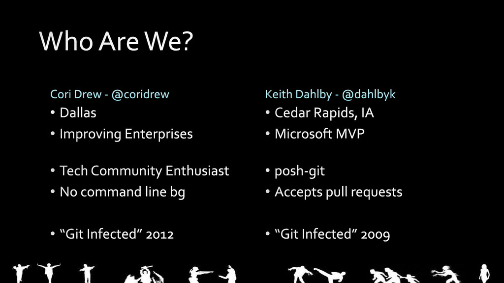 Using a variety of tools, both command-line and GUI, they will demonstrate a number of common scenarios. They will also discuss their experiences with git-tfs and git-svn. Before the session is over, you'll have a good grounding on how to get started with git today.
