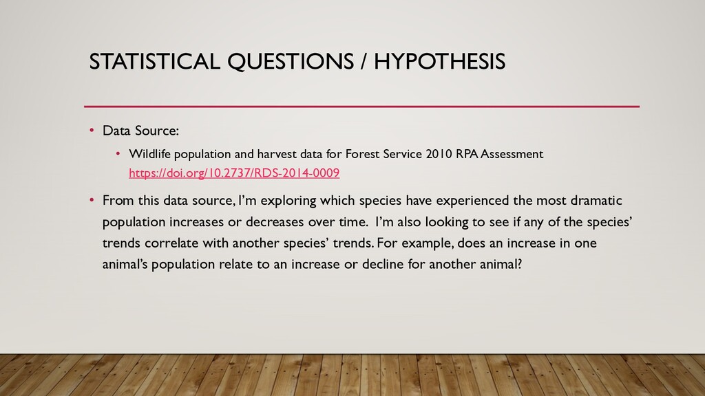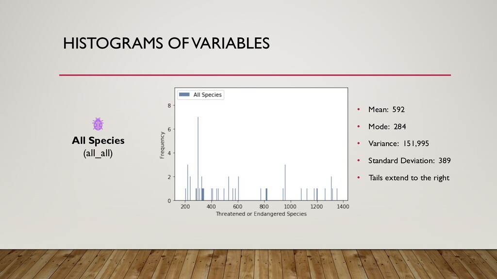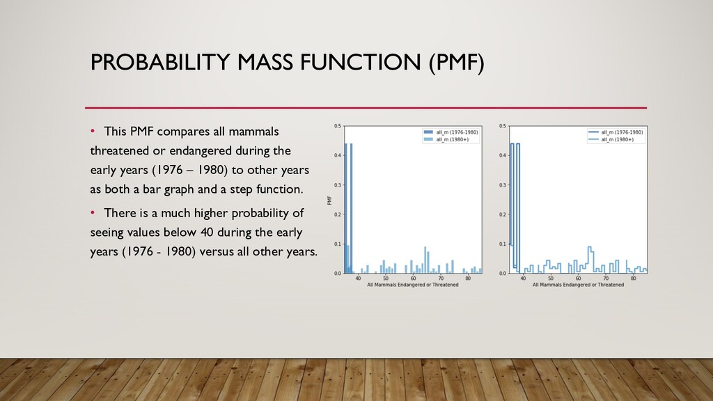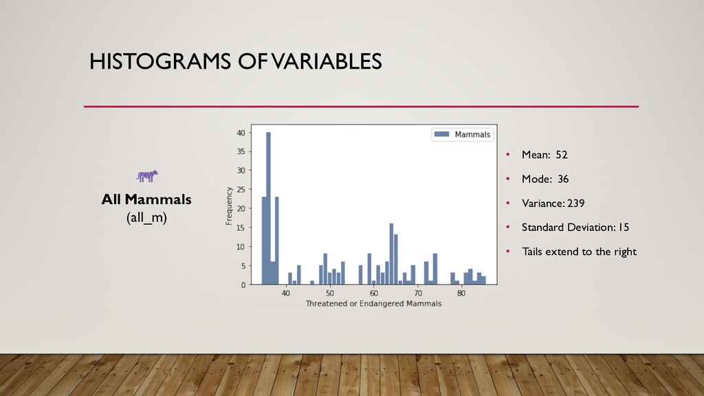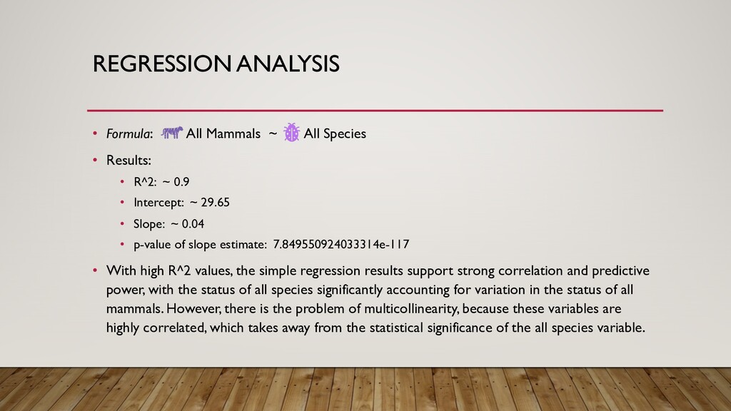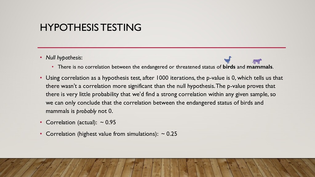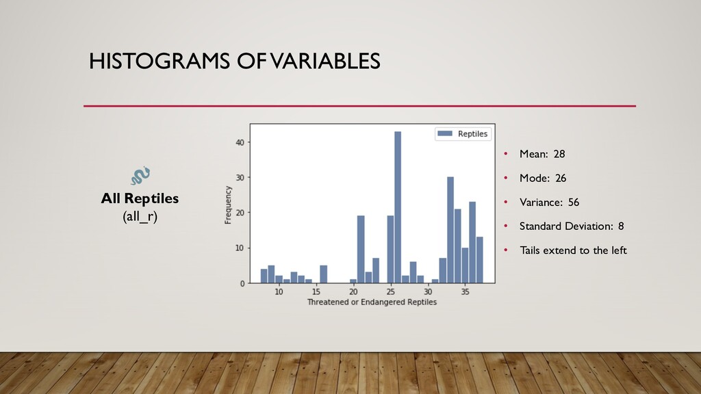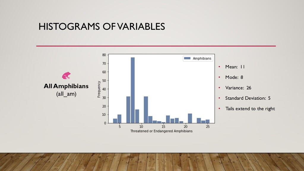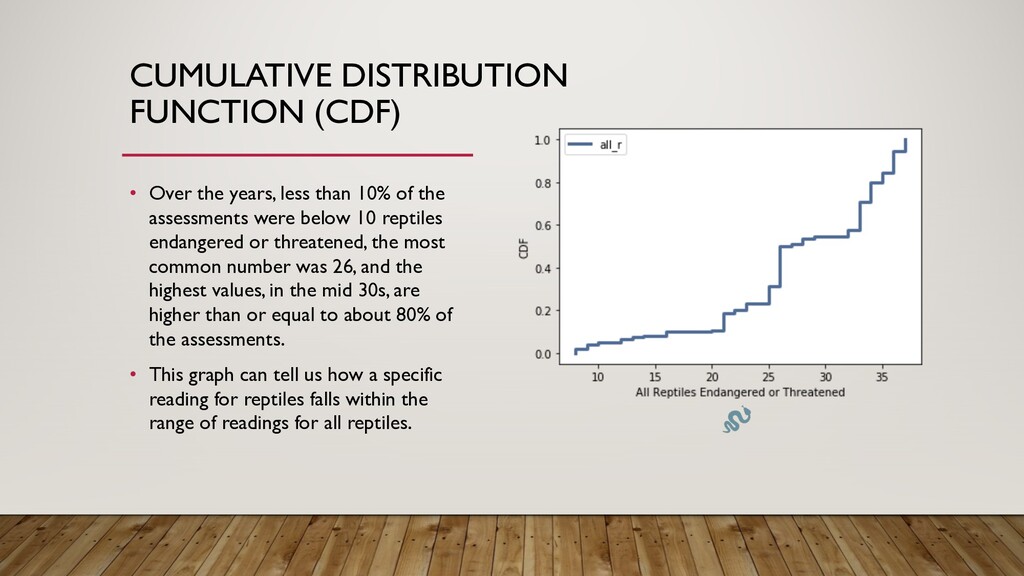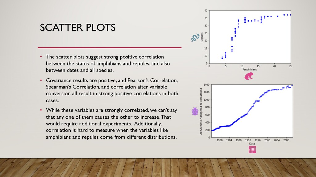 between the status of amphibians and reptiles, and also between dates and all species. • Covariance results are positive, and Pearson’s Correlation, Spearman’s Correlation, and correlation after variable conversion all result in strong positive correlations in both cases. • While these variables are strongly correlated, we can’t say that any one of them causes the other to increase. That would require additional experiments. Additionally, correlation is hard to measure when the variables like amphibians and reptiles come from different distributions.
