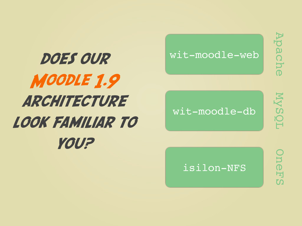 Waterford Institute of Technology, with the help of HEAnet, had a similar adventure when constructing the server infrastructure to host it's new Moodle 2 site during 2012. This short presentation will recount the intrepid journey which took us from a 'one server per application' model hosting the institutes Moodle 1.9 site to a fully virtualised, fault tolerant and high availability cluster hosting Moodle 2 - with the occasional Indiana Jones reference thrown in for good measure!