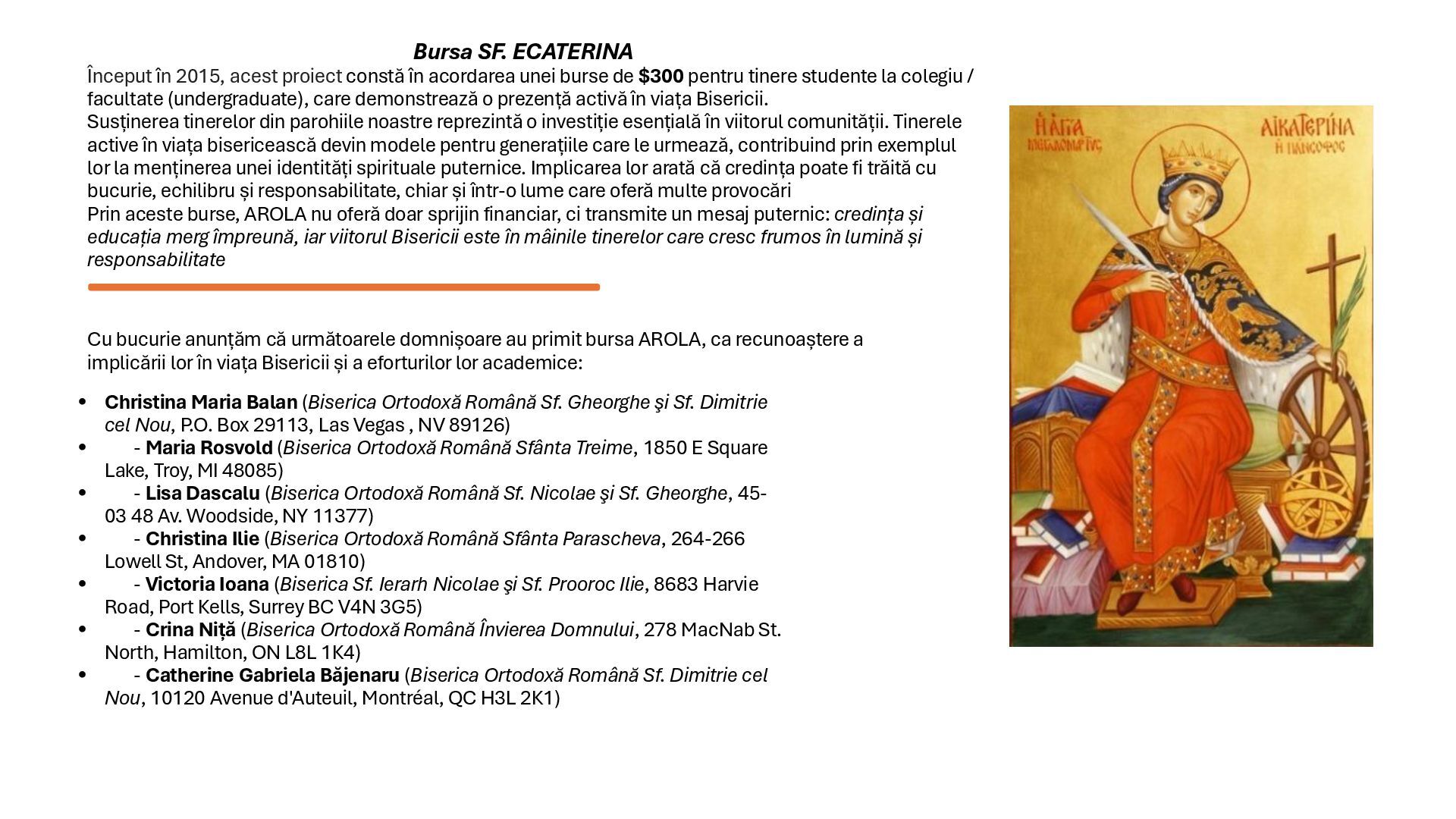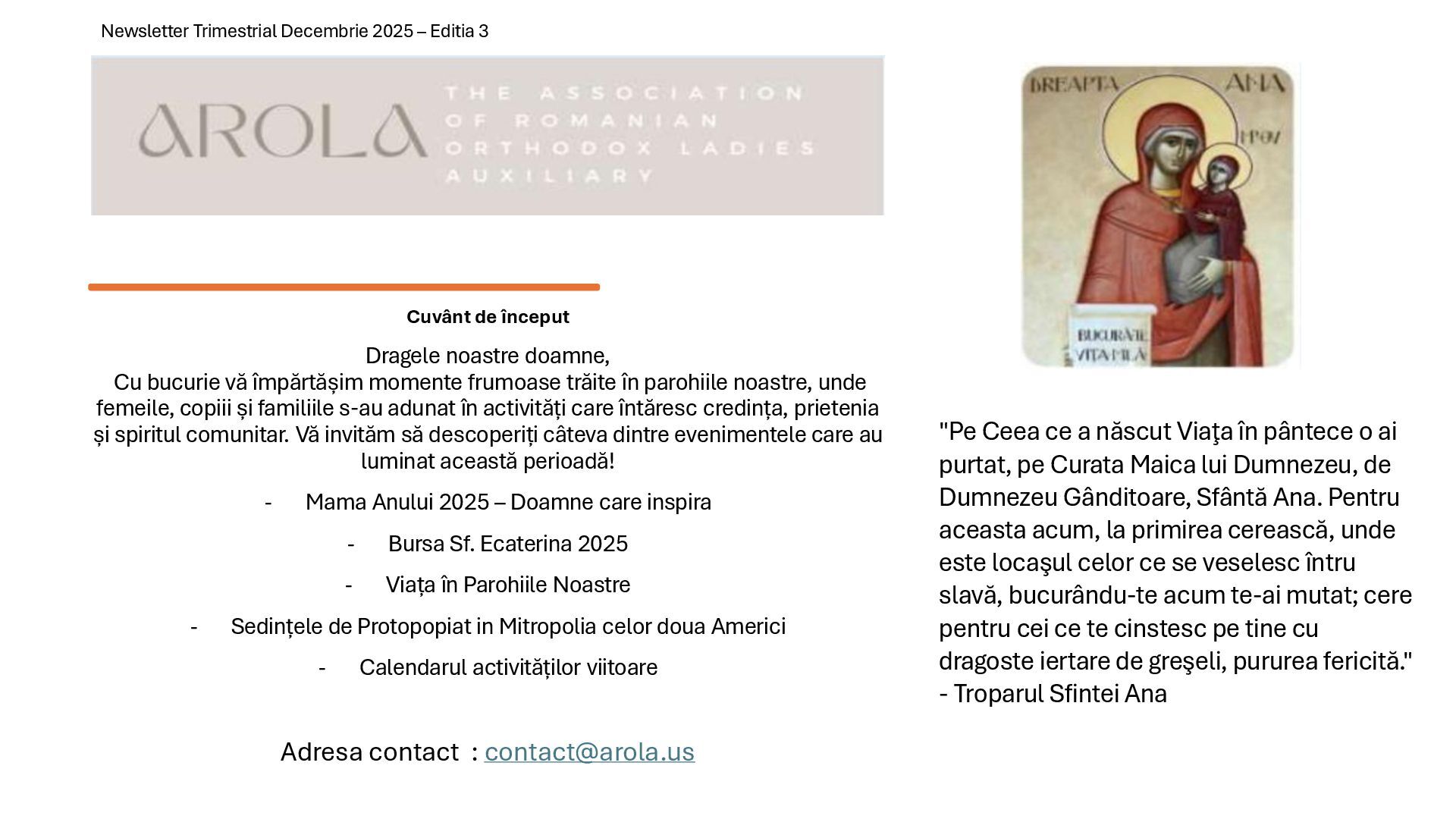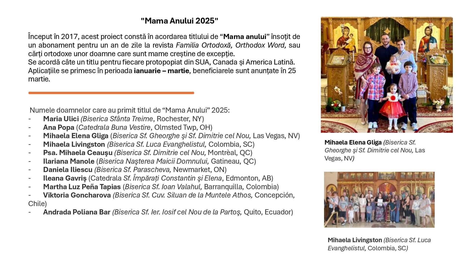 “Mama anului” însoțit de un abonament pentru un an de zile la revista Familia Ortodoxă, Orthodox Word, sau cărți ortodoxe unor doamne care sunt mame creștine de excepție. Se acordă câte un titlu pentru fiecare protopopiat din SUA, Canada și America Latină. Aplicațiile se primesc în perioada ianuarie – martie, beneficiarele sunt anunțate în 25 martie. Numele doamnelor care au primit titlul de “Mama Anului” 2025: - Maria Ulici (Biserica Sfânta Treime, Rochester, NY) - Ana Popa (Catedrala Buna Vestire, Olmsted Twp, OH) - Mihaela Elena Gliga (Biserica Sf. Gheorghe şi Sf. Dimitrie cel Nou, Las Vegas, NV) - Mihaela Livingston (Biserica Sf. Luca Evanghelistul, Colombia, SC) - Psa. Mihaela Ceauşu (Biserica Sf. Dimitrie cel Nou, Montrèal, QC) - Ilariana Manole (Biserica Naşterea Maicii Domnului, Gatineau, QC) - Daniela Iliescu (Biserica Sf. Parascheva, Newmarket, ON) - Ileana Gavriş (Catedrala Sf. Împărați Constantin şi Elena, Edmonton, AB) - Martha Luz Peña Tapias (Biserica Sf. Ioan Valahul, Barranquilla, Colombia) - Viktoria Goncharova (Biserica Sf. Cuv. Siluan de la Muntele Athos, Concepción, Chile) - Andrada Poliana Bar (Biserica Sf. Ier. Iosif cel Nou de la Partoş, Quito, Ecuador) Mihaela Elena Gliga (Biserica Sf. Gheorghe şi Sf. Dimitrie cel Nou, Las Vegas, NV) Mihaela Livingston (Biserica Sf. Luca Evanghelistul, Colombia, SC) "Mama Anului 2025"
