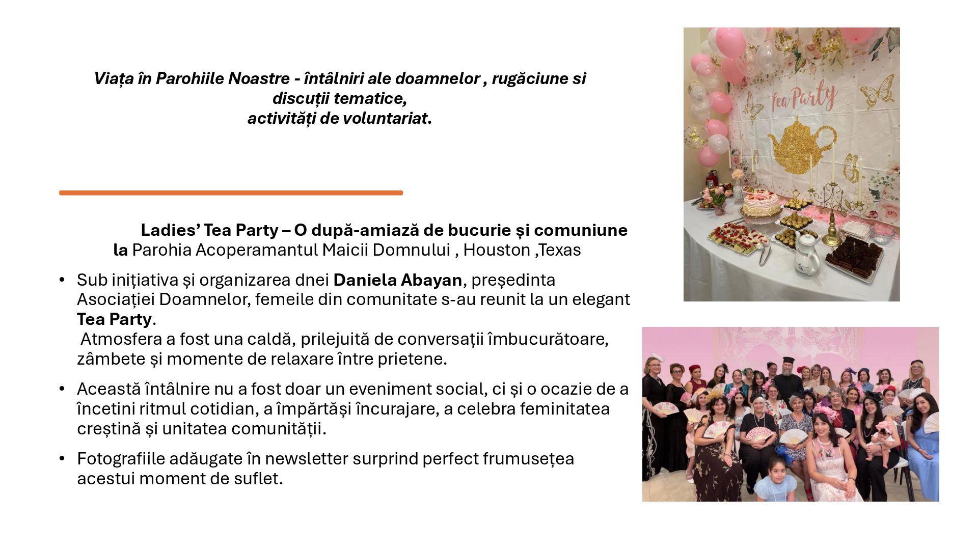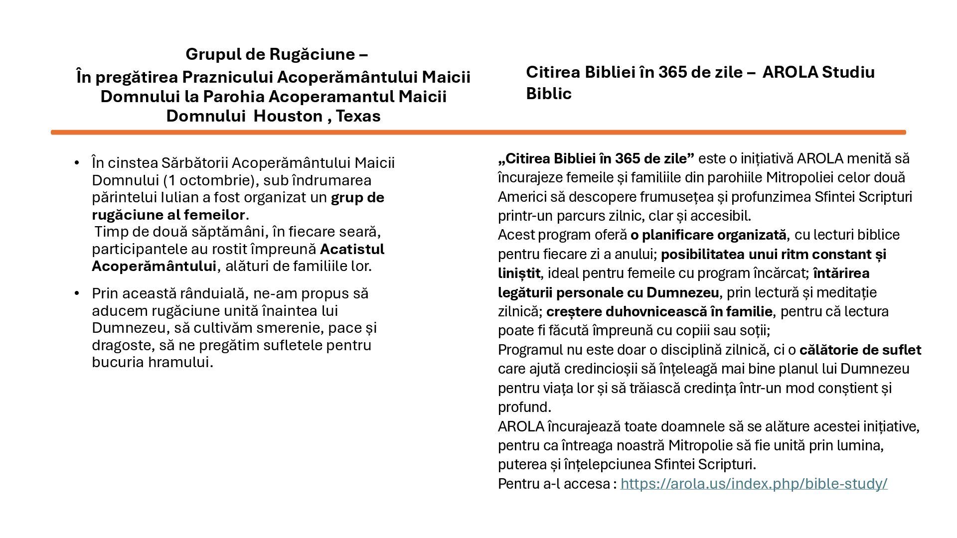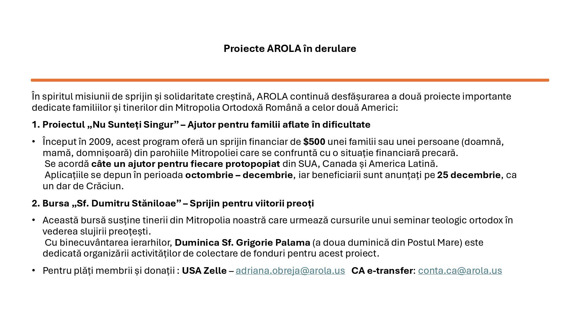 “Mama anului” însoțit de un abonament pentru un an de zile la revista Familia Ortodoxă, Orthodox Word, sau cărți ortodoxe unor doamne care sunt mame creștine de excepție. Se acordă câte un titlu pentru fiecare protopopiat din SUA, Canada și America Latină. Aplicațiile se primesc în perioada ianuarie – martie, beneficiarele sunt anunțate în 25 martie. Numele doamnelor care au primit titlul de “Mama Anului” 2025: - Maria Ulici (Biserica Sfânta Treime, Rochester, NY) - Ana Popa (Catedrala Buna Vestire, Olmsted Twp, OH) - Mihaela Elena Gliga (Biserica Sf. Gheorghe şi Sf. Dimitrie cel Nou, Las Vegas, NV) - Mihaela Livingston (Biserica Sf. Luca Evanghelistul, Colombia, SC) - Psa. Mihaela Ceauşu (Biserica Sf. Dimitrie cel Nou, Montrèal, QC) - Ilariana Manole (Biserica Naşterea Maicii Domnului, Gatineau, QC) - Daniela Iliescu (Biserica Sf. Parascheva, Newmarket, ON) - Ileana Gavriş (Catedrala Sf. Împărați Constantin şi Elena, Edmonton, AB) - Martha Luz Peña Tapias (Biserica Sf. Ioan Valahul, Barranquilla, Colombia) - Viktoria Goncharova (Biserica Sf. Cuv. Siluan de la Muntele Athos, Concepción, Chile) - Andrada Poliana Bar (Biserica Sf. Ier. Iosif cel Nou de la Partoş, Quito, Ecuador) Mihaela Elena Gliga (Biserica Sf. Gheorghe şi Sf. Dimitrie cel Nou, Las Vegas, NV) Mihaela Livingston (Biserica Sf. Luca Evanghelistul, Colombia, SC) "Mama Anului 2025"