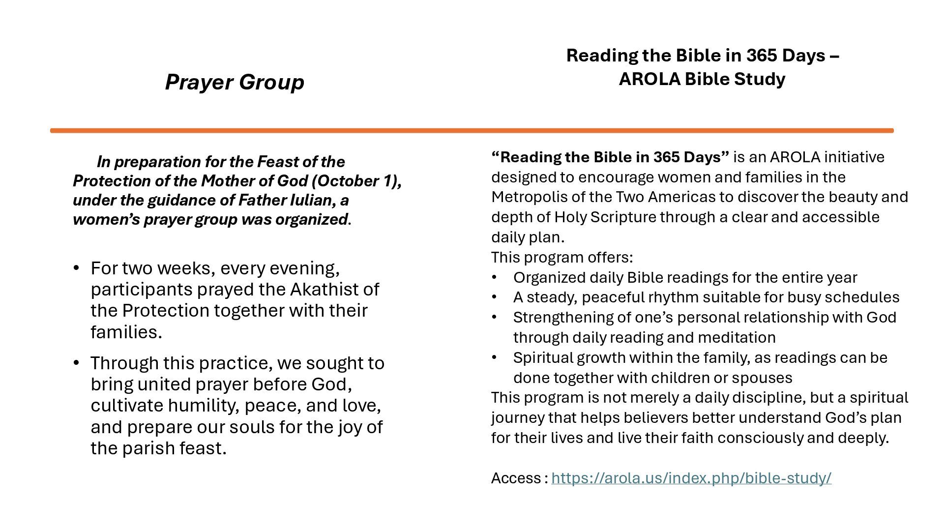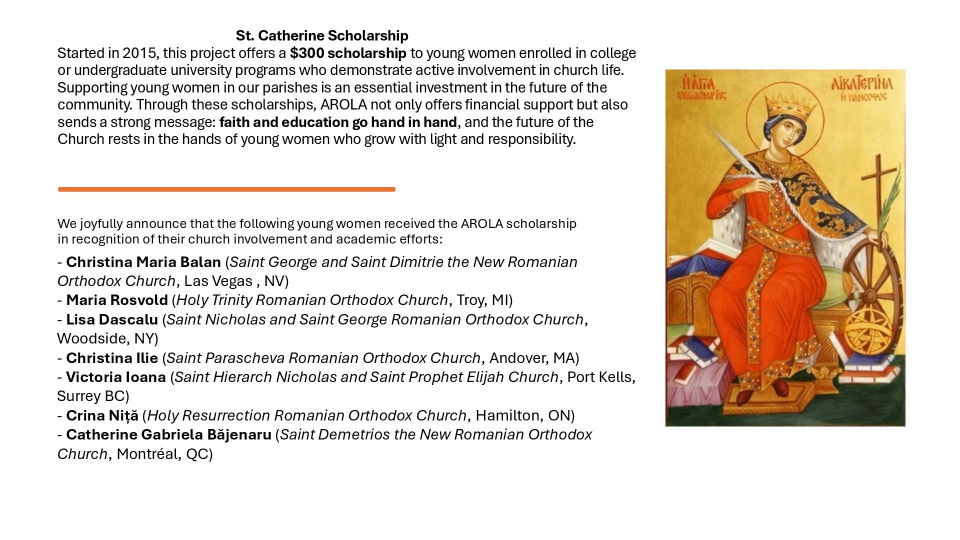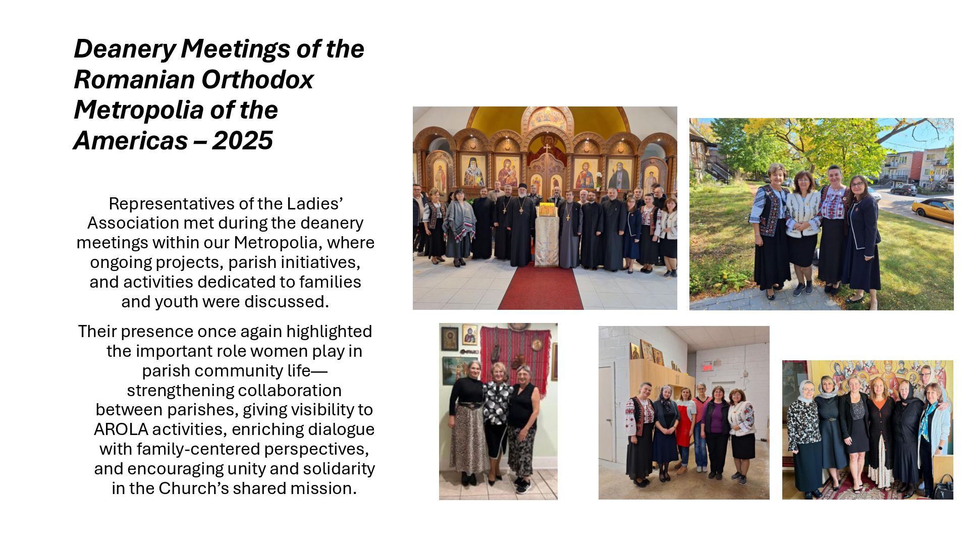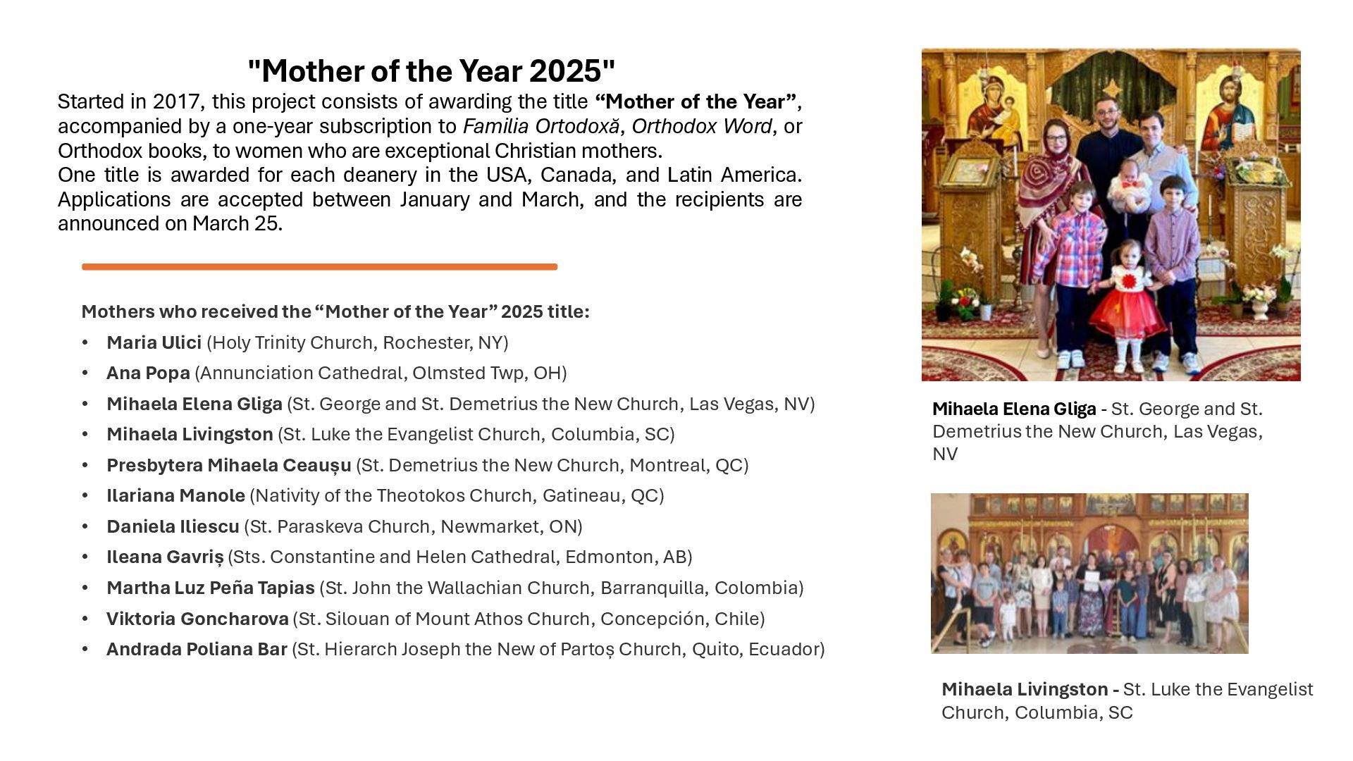 consists of awarding the title “Mother of the Year”, accompanied by a one-year subscription to Familia Ortodoxă, Orthodox Word, or Orthodox books, to women who are exceptional Christian mothers. One title is awarded for each deanery in the USA, Canada, and Latin America. Applications are accepted between January and March, and the recipients are announced on March 25. Mothers who received the“Mother of the Year” 2025 title: • Maria Ulici (Holy Trinity Church, Rochester, NY) • Ana Popa (Annunciation Cathedral, Olmsted Twp, OH) • Mihaela Elena Gliga (St. George and St. Demetrius the New Church, Las Vegas, NV) • Mihaela Livingston (St. Luke the Evangelist Church, Columbia, SC) • Presbytera Mihaela Ceaușu (St. Demetrius the New Church, Montreal, QC) • Ilariana Manole (Nativity of the Theotokos Church, Gatineau, QC) • Daniela Iliescu (St. Paraskeva Church, Newmarket, ON) • Ileana Gavriș (Sts. Constantine and Helen Cathedral, Edmonton, AB) • Martha Luz Peña Tapias (St. John the Wallachian Church, Barranquilla, Colombia) • Viktoria Goncharova (St. Silouan of Mount Athos Church, Concepción, Chile) • Andrada Poliana Bar (St. Hierarch Joseph the New of Partoș Church, Quito, Ecuador) Mihaela Elena Gliga - St. George and St. Demetrius the New Church, Las Vegas, NV Mihaela Livingston - St. Luke the Evangelist Church, Columbia, SC