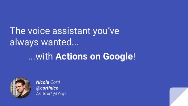 Sure! Here is my calculator What are you in the mood for? Speech-to-text Ok Google, Talk to my personal chef Sure! Here is my personal chef What are you in the mood for? It’s cold outside, so... Which kind of proteine you want to use? Text-to-Speech NLP Knoledge graph MLearning User profile Speech-to-text Text-to-speech Invoke My Personal Chef action Parse query and generate response HTTP Call DB Query