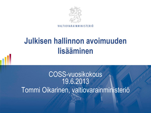 ja standardeja § Avoimeen lähdekoodiin perustuvien ratkaisujen käyttöönottoa edistetään julkisen hallinnon kokonaisarkkitehtuurin puitteissa ja kustannushyötyanalyysin pohjalta (Lähde: Pääministeri Jyrki Kataisen hallitusohjelma 22.6.2011) Hallitusohjelman tavoitteet Yhteentoimivuus Avoimuus Palveluiden ja palveluprosessien kustannus-tehokas kehittäminen Parannetaan julkisten palveluiden vaikuttavuutta, tuloksellisuutta ja tuottavuutta