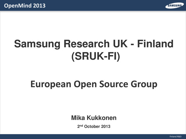 Location Size Culture ”Economic factors” • ”Sister” site in Silicon Valley, California, USA • Samsung R&D HQ in Suwon, South Korea • SRUK-FI officially opened 13th June 2013, located in Otaniemi, Espoo (north of Innopoli) • Current headcount around 20 and growing • Focus areas in SRUK-FI: Open Source Group (OSG) Tizen (https://www.tizen.org) Internal R&D support Talouselämä 17.8.2013 Samsung R&D HQ in Suwon