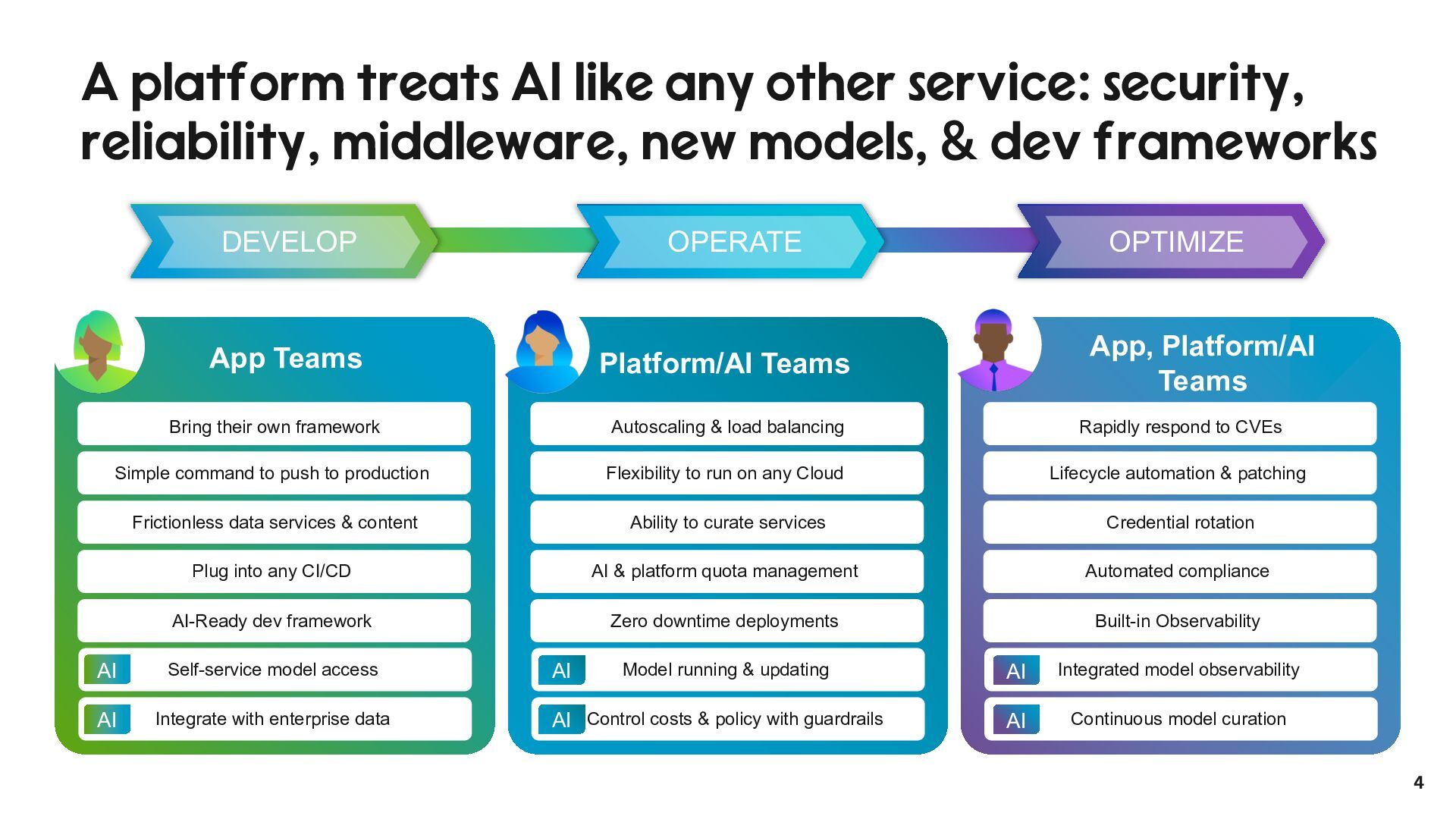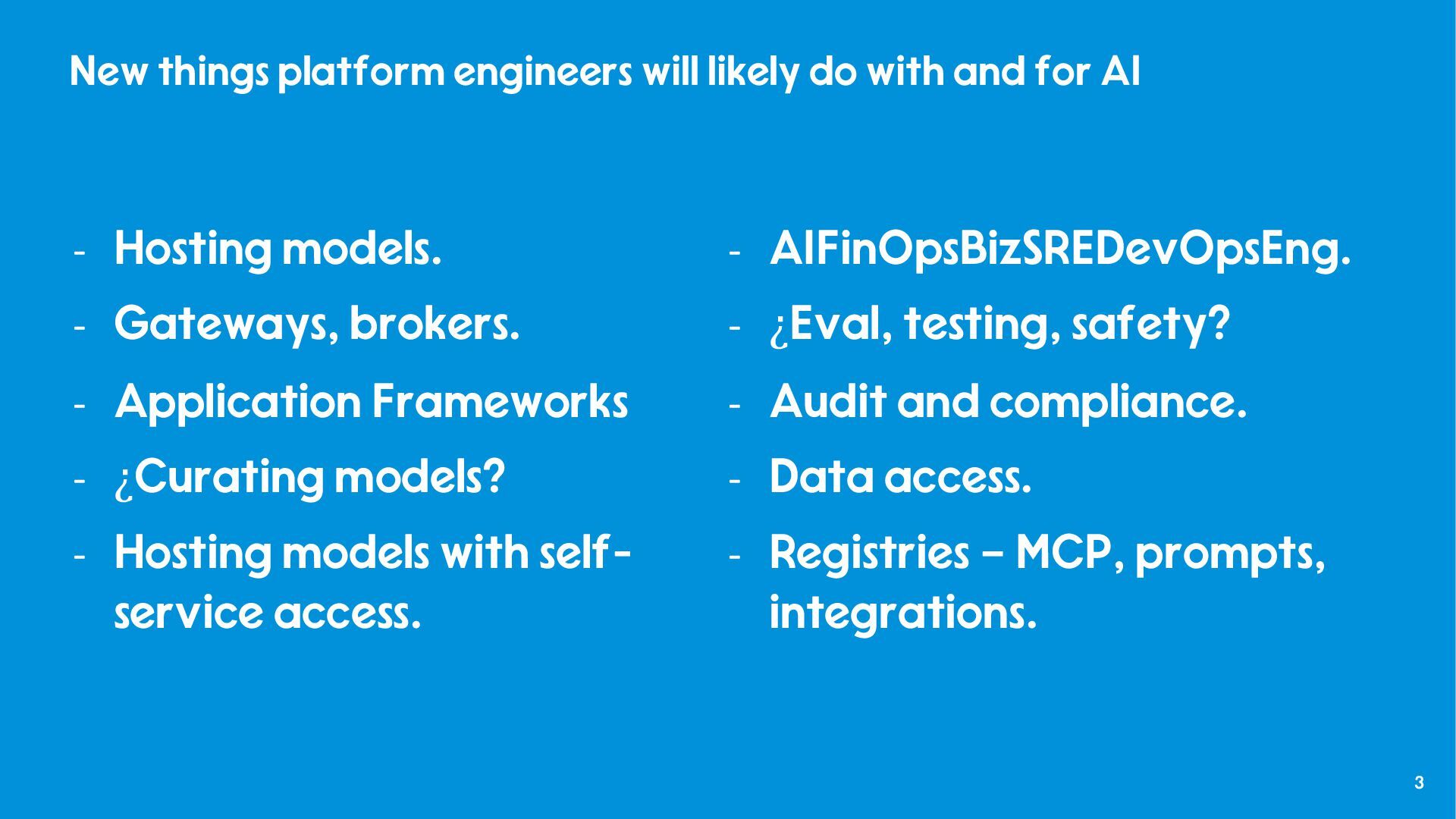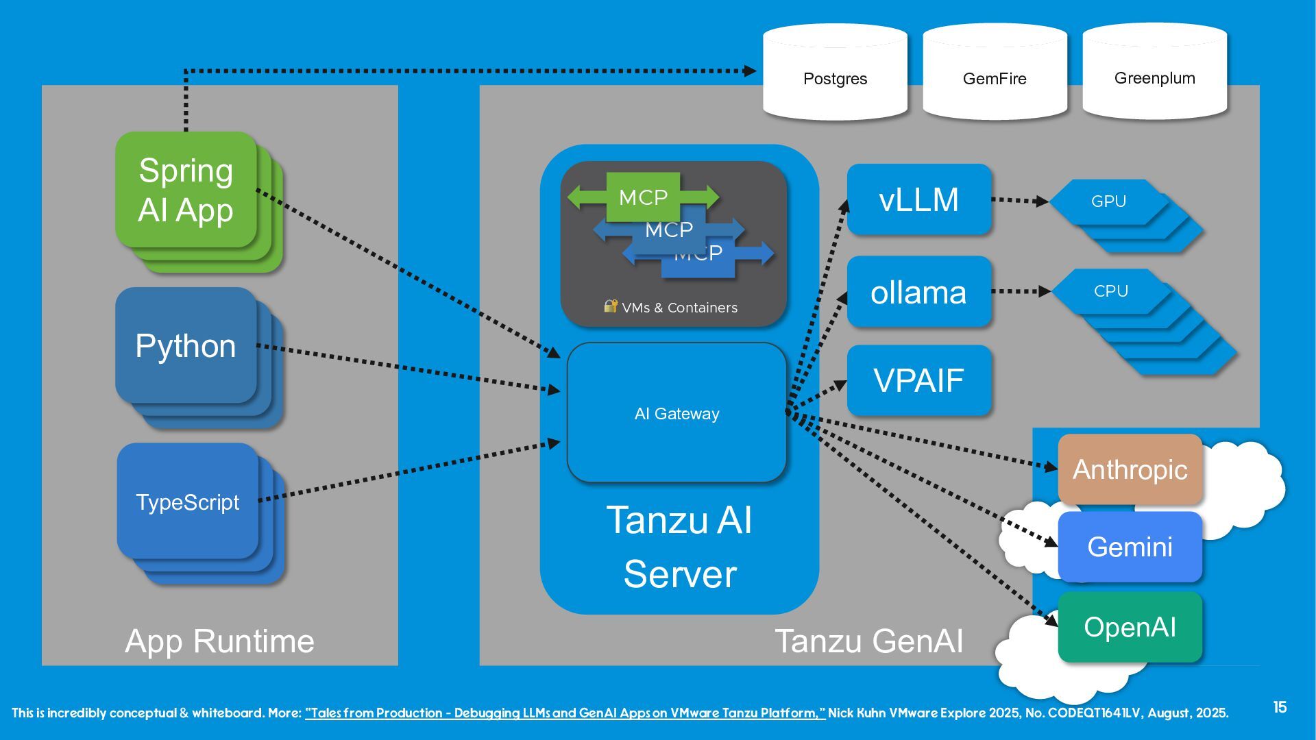 and internal use. - “Tales from Production - Debugging LLMs and GenAI Apps on VMware Tanzu Platform,” Nick Kuhn VMware Explore 2025, No. CODEQT1641LV, August, 2025. - “How platform teams can help scale generative AI application delivery,” Manjunath Bhat, Gartner, June 23rd, 2025. - “Why AI needs a platform team,” Patrick Debois, PlatformCon 2025, June 23rd, 2025. - “AI Platform Engineering,” Patrick Debois, Dec 31, 2024. - “From Experiment to Enterprise: How Block Operationalized MCP at Scale,” Angie Jones, Block, MCP Developers Summit, May, 2025. - “The evolving role of Platform teams in the AI era,” Abi Noda and Laura Tacho, DX, August 28th, 2025. - “The Emperor’s New GPT Why Your ‘Custom AI’ Is a Demo, Not a Product,” Keith Townsend, August 18th, 2025.
