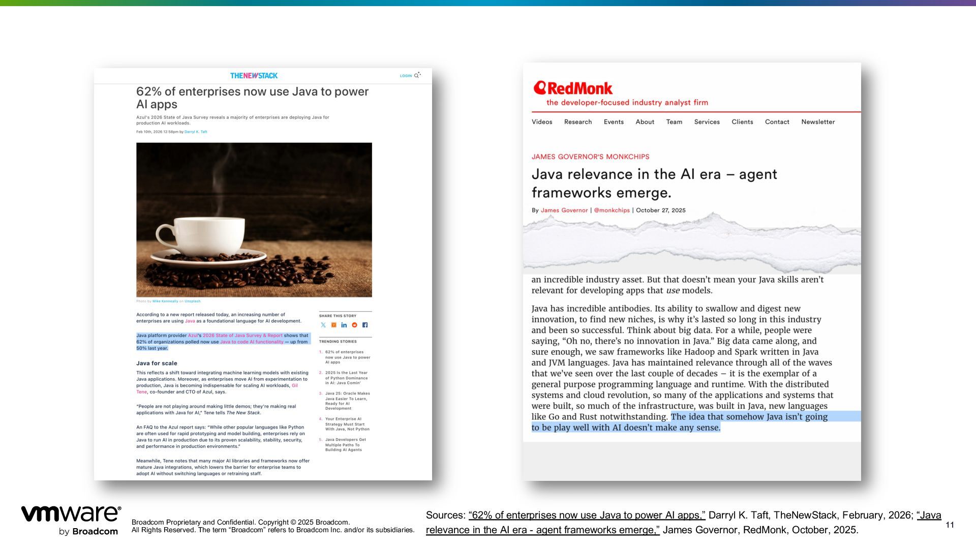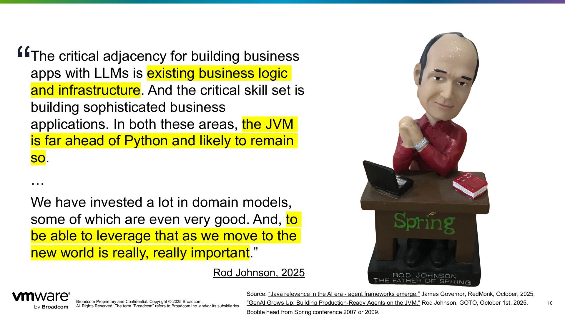 Reserved. The term “Broadcom” refers to Broadcom Inc. and/or its subsidiaries. 10 10 The critical adjacency for building business apps with LLMs is existing business logic and infrastructure. And the critical skill set is building sophisticated business applications. In both these areas, the JVM is far ahead of Python and likely to remain so. … We have invested a lot in domain models, some of which are even very good. And, to be able to leverage that as we move to the new world is really, really important.” Rod Johnson, 2025 “ Source: “Java relevance in the AI era - agent frameworks emerge,” James Governor, RedMonk, October, 2025; "GenAI Grows Up: Building Production-Ready Agents on the JVM," Rod Johnson, GOTO, October 1st, 2025. Booble head from Spring conference 2007 or 2009.