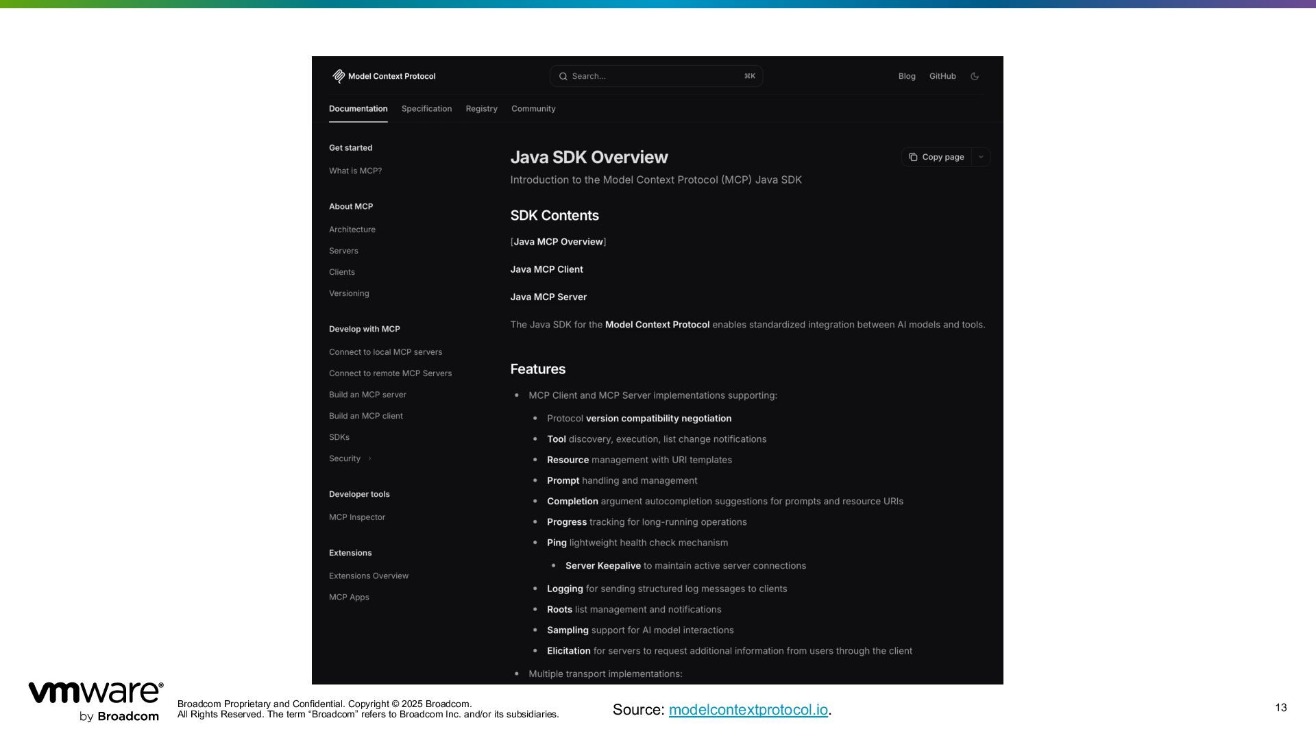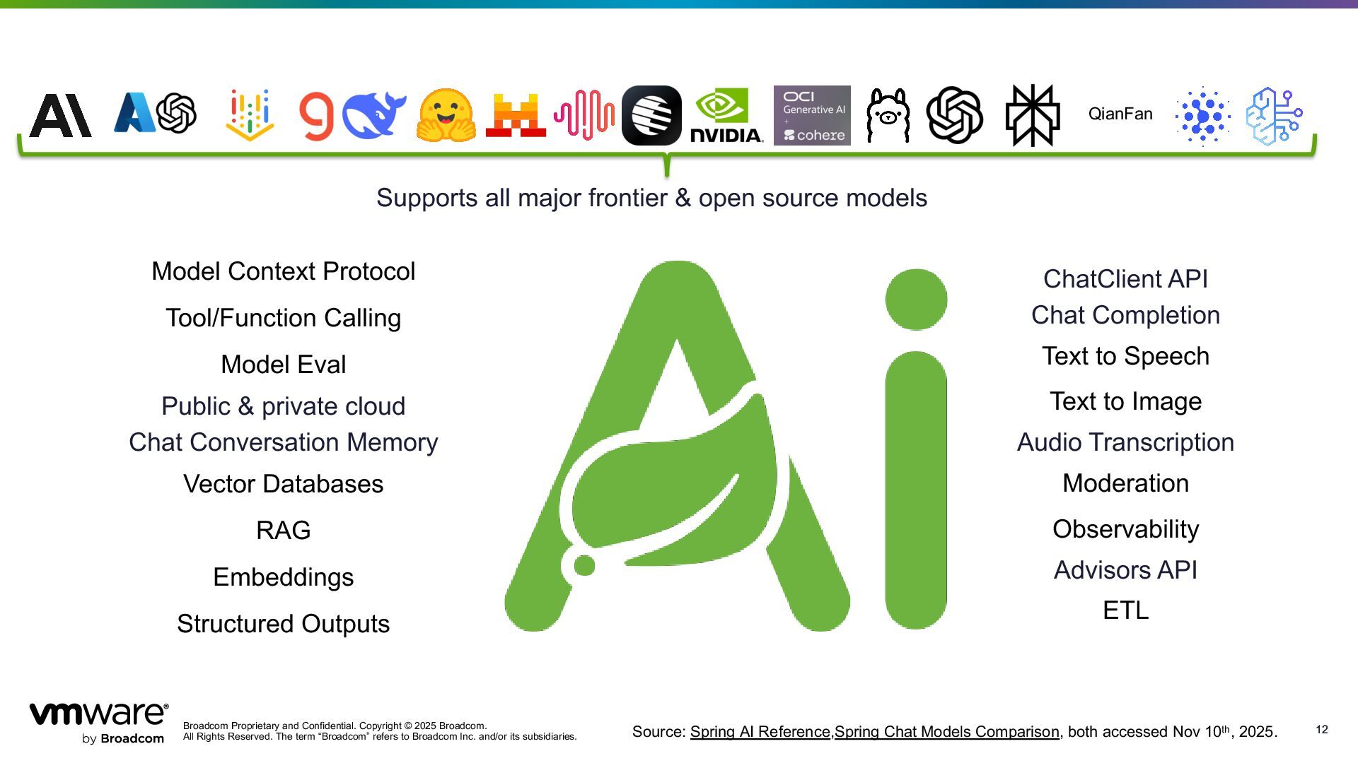 Reserved. The term “Broadcom” refers to Broadcom Inc. and/or its subsidiaries. 12 12 Chat Completion Text to Image Audio Transcription Text to Speech Moderation Observability ETL ChatClient API Advisors API Supports all major frontier & open source models Embeddings Structured Outputs Vector Databases Tool/Function Calling Model Context Protocol Model Eval Chat Conversation Memory RAG Public & private cloud QianFan Source: Spring AI Reference,Spring Chat Models Comparison, both accessed Nov 10th, 2025.