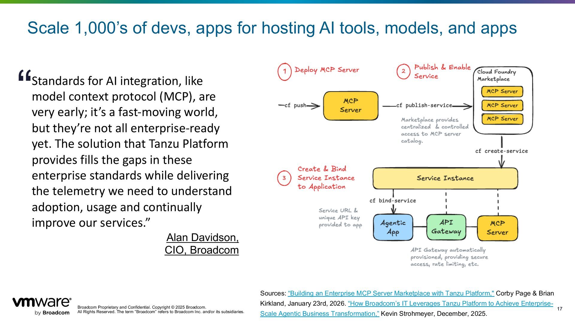 Reserved. The term “Broadcom” refers to Broadcom Inc. and/or its subsidiaries. 17 17 Sources: “Building an Enterprise MCP Server Marketplace with Tanzu Platform," Corby Page & Brian Kirkland, January 23rd, 2026. “How Broadcom’s IT Leverages Tanzu Platform to Achieve Enterprise- Scale Agentic Business Transformation,” Kevin Strohmeyer, December, 2025. Scale 1,000’s of devs, apps for hosting AI tools, models, and apps Standards for AI integration, like model context protocol (MCP), are very early; it’s a fast-moving world, but they’re not all enterprise-ready yet. The solution that Tanzu Platform provides fills the gaps in these enterprise standards while delivering the telemetry we need to understand adoption, usage and continually improve our services.” Alan Davidson, CIO, Broadcom “