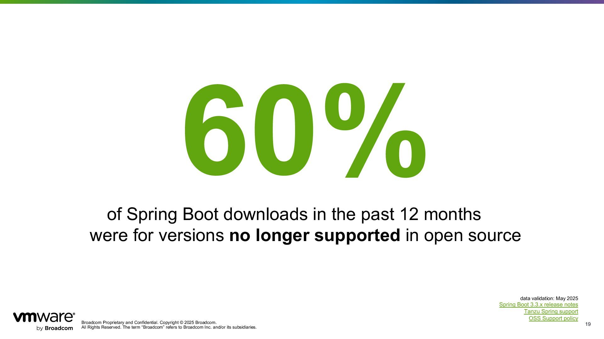 Reserved. The term “Broadcom” refers to Broadcom Inc. and/or its subsidiaries. 19 of Spring Boot downloads in the past 12 months were for versions no longer supported in open source 60% data validation: May 2025 Spring Boot 3.3.x release notes Tanzu Spring support OSS Support policy