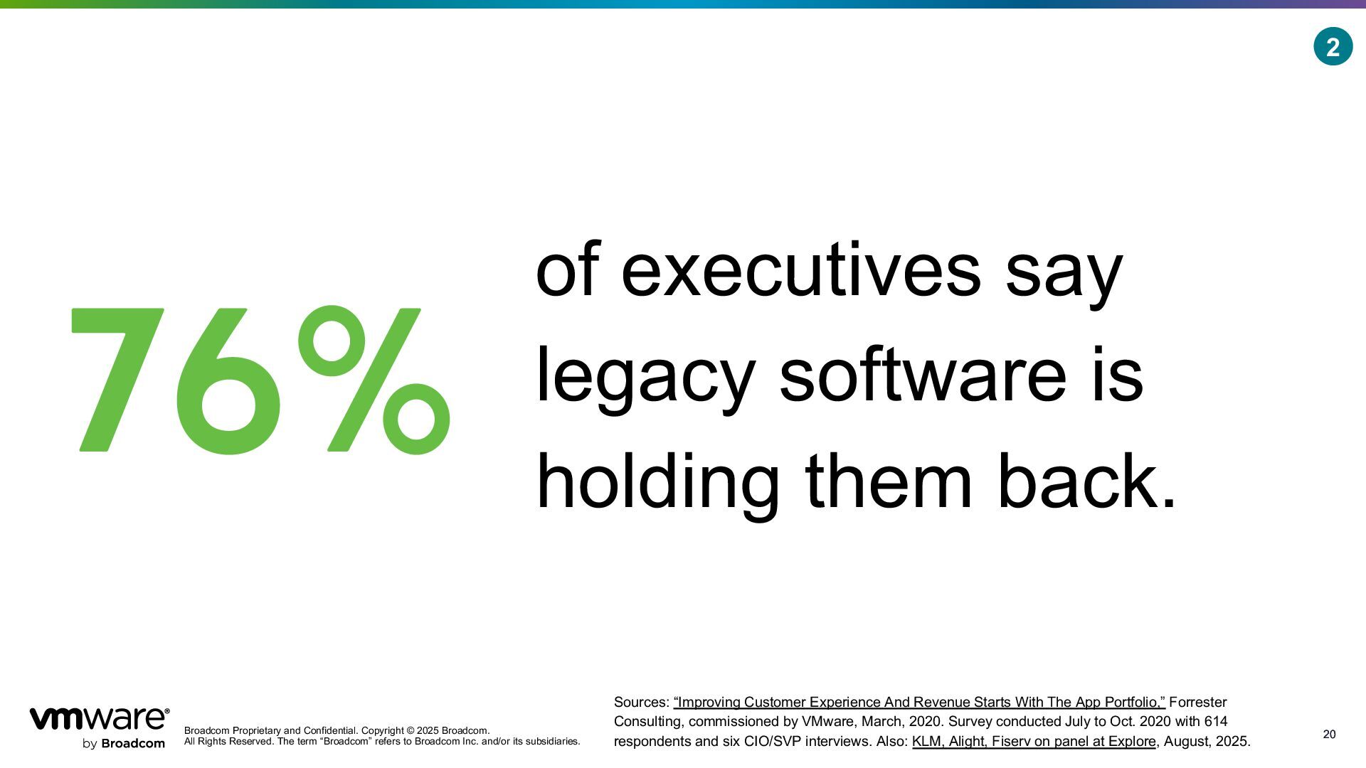 Reserved. The term “Broadcom” refers to Broadcom Inc. and/or its subsidiaries. 20 20 of executives say legacy software is holding them back. 76% Sources: “Improving Customer Experience And Revenue Starts With The App Portfolio,” Forrester Consulting, commissioned by VMware, March, 2020. Survey conducted July to Oct. 2020 with 614 respondents and six CIO/SVP interviews. Also: KLM, Alight, Fiserv on panel at Explore, August, 2025. 2