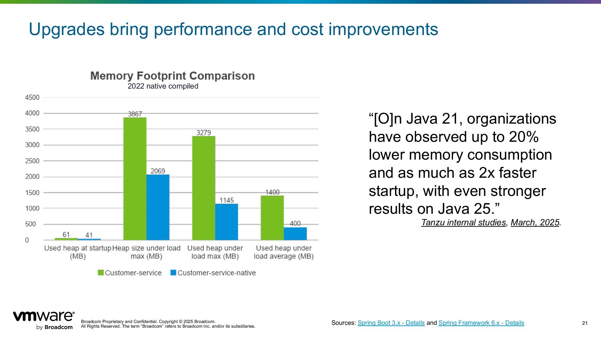 Reserved. The term “Broadcom” refers to Broadcom Inc. and/or its subsidiaries. 21 21 Upgrades bring performance and cost improvements Sources: Spring Boot 3.x - Details and Spring Framework 6.x - Details 2022 native compiled “[O]n Java 21, organizations have observed up to 20% lower memory consumption and as much as 2x faster startup, with even stronger results on Java 25.” Tanzu internal studies, March, 2025.