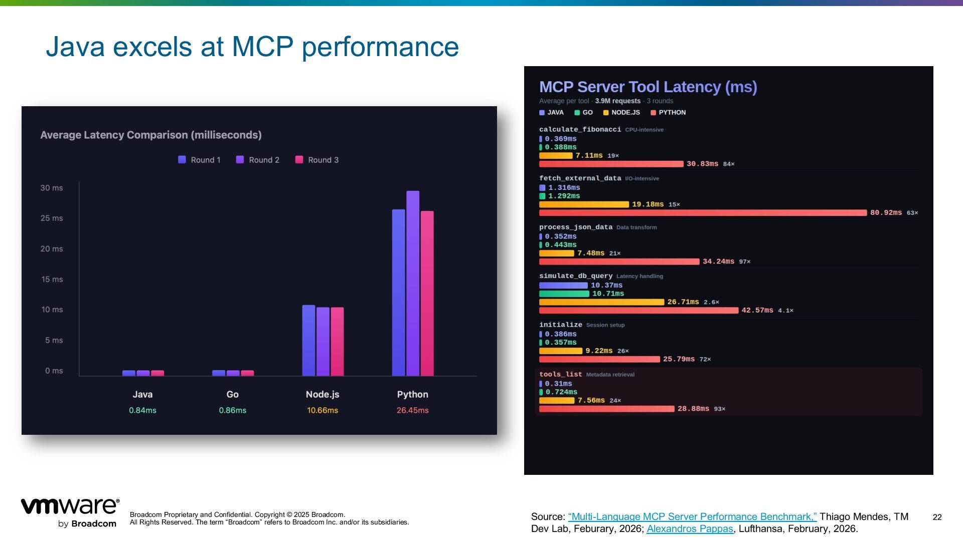 Reserved. The term “Broadcom” refers to Broadcom Inc. and/or its subsidiaries. 22 22 Java excels at MCP performance Source: “Multi-Language MCP Server Performance Benchmark,” Thiago Mendes, TM Dev Lab, Feburary, 2026; Alexandros Pappas, Lufthansa, February, 2026.