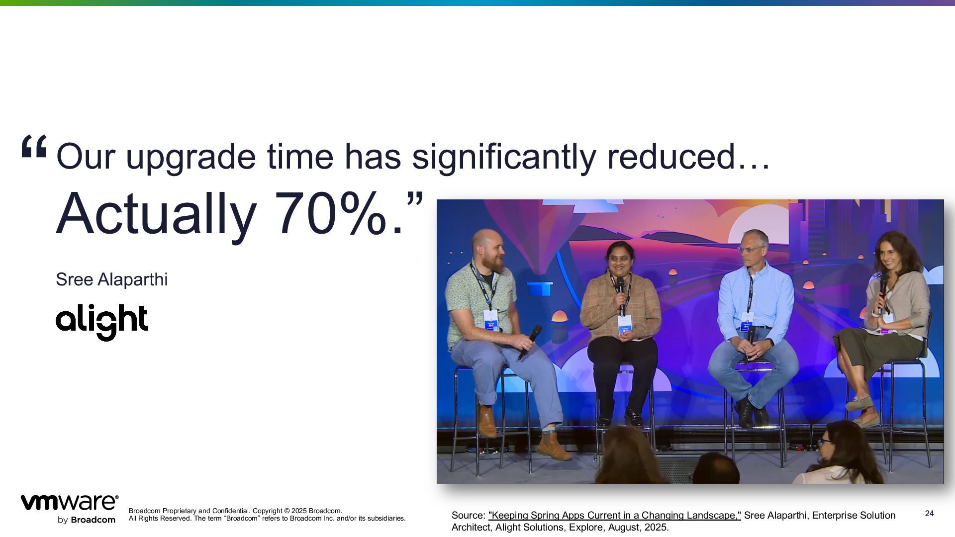 Reserved. The term “Broadcom” refers to Broadcom Inc. and/or its subsidiaries. 24 24 Our upgrade time has significantly reduced… Actually 70%.” Sree Alaparthi “ Source: "Keeping Spring Apps Current in a Changing Landscape," Sree Alaparthi, Enterprise Solution Architect, Alight Solutions, Explore, August, 2025.