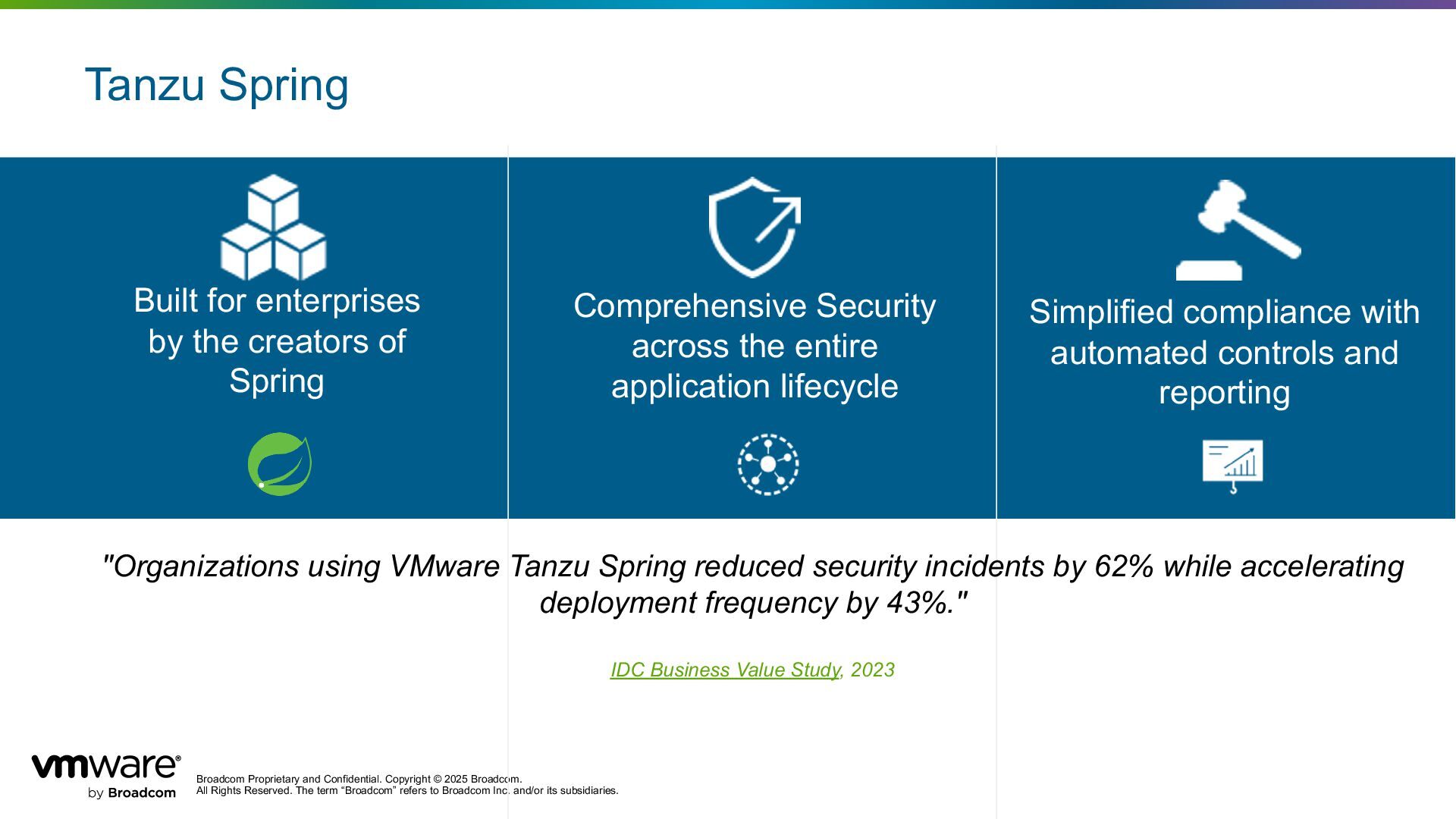 Reserved. The term “Broadcom” refers to Broadcom Inc. and/or its subsidiaries. Tanzu Spring Built for enterprises by the creators of Spring Comprehensive Security across the entire application lifecycle Simplified compliance with automated controls and reporting "Organizations using VMware Tanzu Spring reduced security incidents by 62% while accelerating deployment frequency by 43%." IDC Business Value Study, 2023