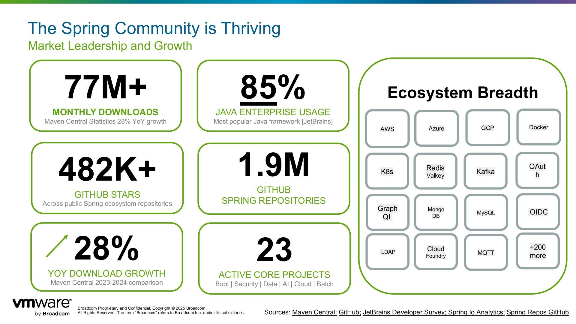 Reserved. The term “Broadcom” refers to Broadcom Inc. and/or its subsidiaries. The Spring Community is Thriving Market Leadership and Growth 77M+ MONTHLY DOWNLOADS Maven Central Statistics 28% YoY growth 28% YOY DOWNLOAD GROWTH Maven Central 2023-2024 comparison 482K+ GITHUB STARS Across public Spring ecosystem repositories 85% JAVA ENTERPRISE USAGE Most popular Java framework [JetBrains] Ecosystem Breadth 1.9M GITHUB SPRING REPOSITORIES AWS Azure GCP Docker K8s Redis Valkey Kafka OAut h LDAP Cloud Foundry MQTT +200 more Graph QL Mongo DB MySQL OIDC 23 ACTIVE CORE PROJECTS Boot | Security | Data | AI | Cloud | Batch Sources: Maven Central; GitHub; JetBrains Developer Survey; Spring Io Analytics; Spring Repos GitHub