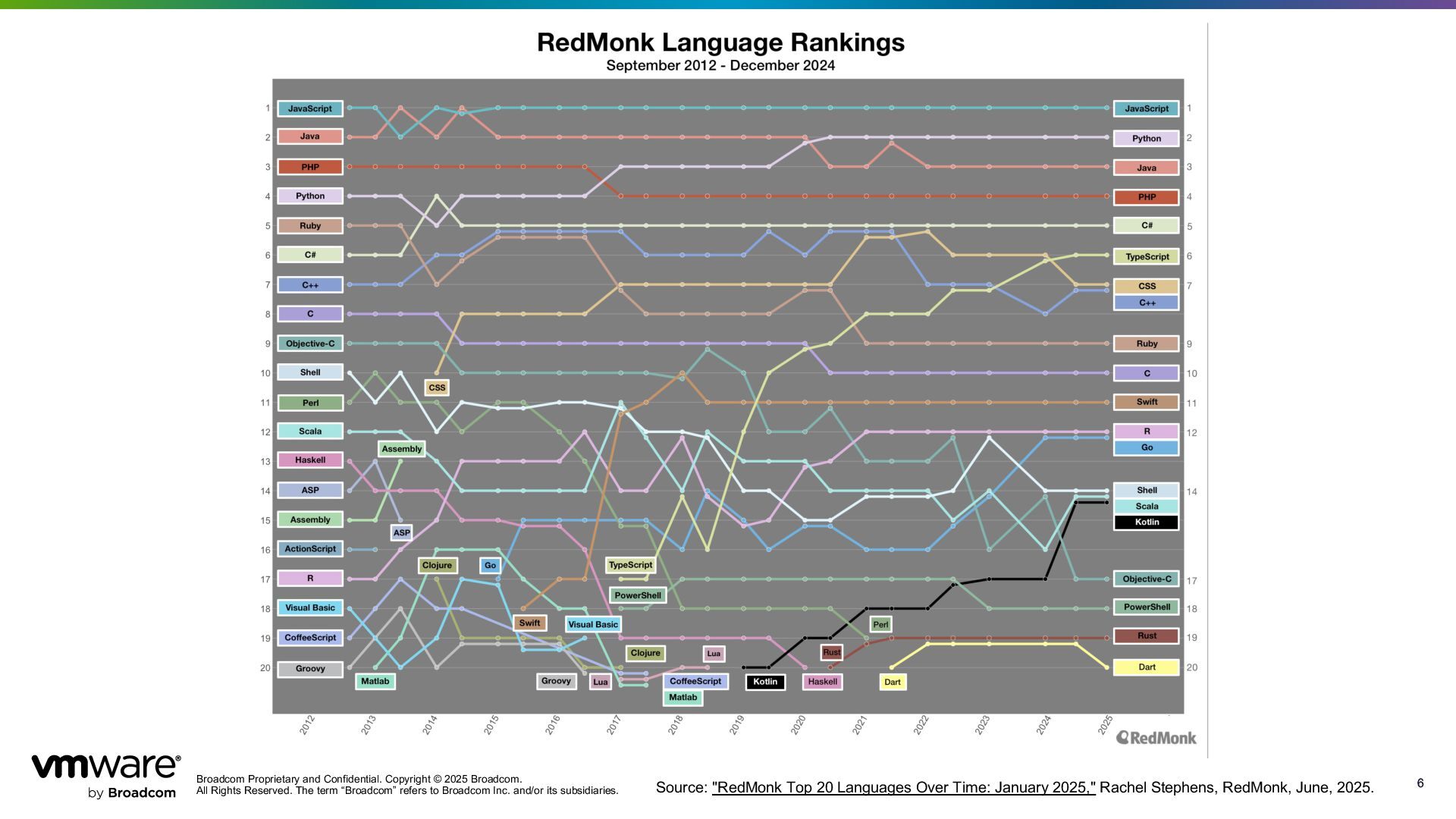 Reserved. The term “Broadcom” refers to Broadcom Inc. and/or its subsidiaries. 6 6 Source: "RedMonk Top 20 Languages Over Time: January 2025," Rachel Stephens, RedMonk, June, 2025.