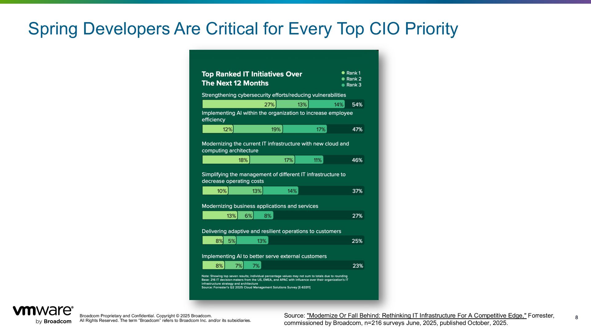 Reserved. The term “Broadcom” refers to Broadcom Inc. and/or its subsidiaries. 8 8 Spring Developers Are Critical for Every Top CIO Priority Source: "Modernize Or Fall Behind: Rethinking IT Infrastructure For A Competitive Edge," Forrester, commissioned by Broadcom, n=216 surveys June, 2025, published October, 2025.