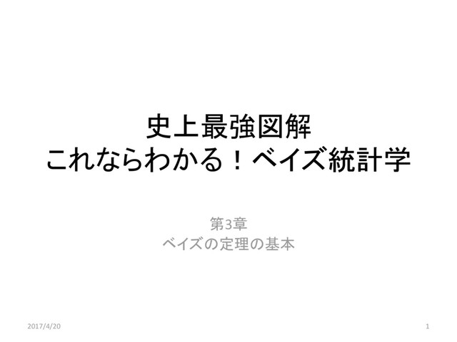 ベイズの基本公式 = (│)() ベイズの基本公式が役立つ状況とは [例題3] • 前提(※例) • ある年の4/2が雨だったが、4/1の天気が分からない。 • 何らかの理由で、4/1が曇りだったかを知りたい。 • 統計データから、分かっていること • 4/1の天気の確率 • 4/1が曇りの時に、4/2が雨の確率 • ベイズの基本公式に当てはめる • D:4/2が雨である • H:4/1の天気(1 :曇り、2 :雨) 1 = (│1 )(1 ) = 0.5 ∗ 0.6 0.4 = 3 4 2. ベイズの基本公式 4 p74 D 1 2 ② ベイズの基本公式 H:Hypothesis(原因・仮定) D:Data(結果・データ)
