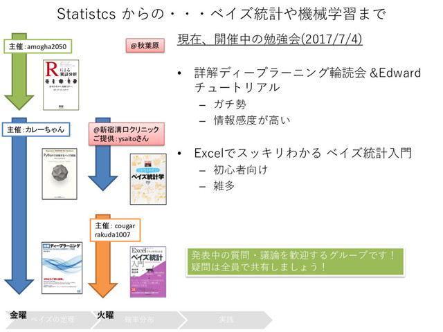 – 公式の暗記やプログラム・ソフトウェアの利用方法のみに留まらず、意味・理 由を人に説明できることを目指します – 旬の話題や、多様な学問領域・業種・職種からの視点を歓迎します • 発表・LT、歓迎します(公序良俗の範囲で!) – 例1)3ページだけ発表をやってみたい – 例2)プレゼンの練習に、仕事でやっていることをLTで話してみたい – 例3)統計・マーケティング・Python・R・機械学習・IoT…など、 マーケティングやデータサイエンスに関する本・イベントの感想や紹介 では、一緒に勉強しましょう!