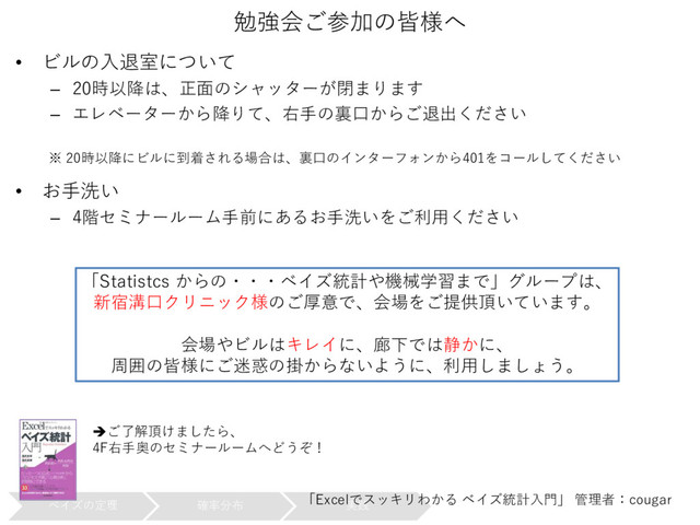 • お手洗い – 4階セミナールーム手前にあるお手洗いをご利用ください 「Statistcs からの・・・ベイズ統計や機械学習まで」グループは、 新宿溝口クリニック様のご厚意で、会場をご提供頂いています。 会場やビルはキレイに、廊下では静かに、 周囲の皆様にご迷惑の掛からないように、利用しましょう。 「Excelでスッキリわかる ベイズ統計入門」 管理者:cougar ※ 20時以降にビルに到着される場合は、裏口のインターフォンから401をコールしてください ご了解頂けましたら、 4F右手奥のセミナールームへどうぞ!