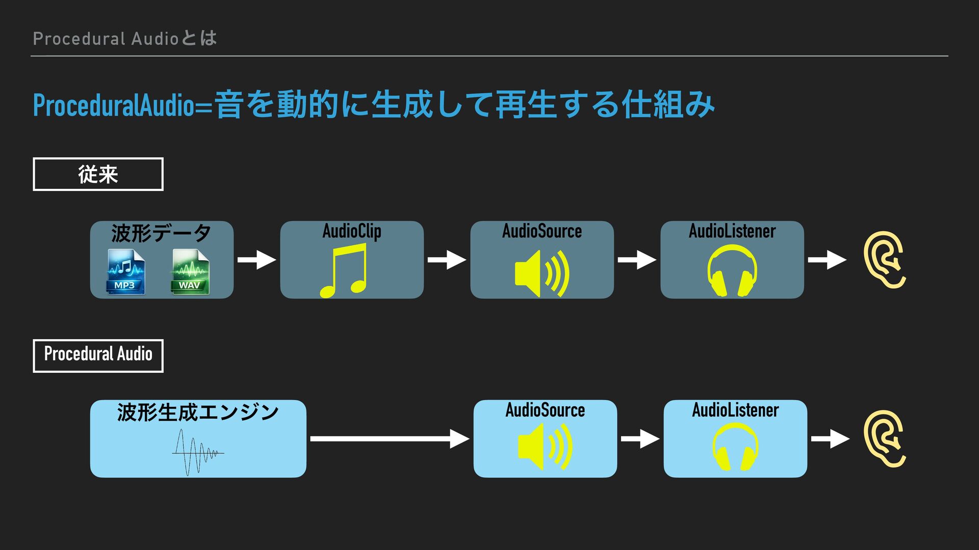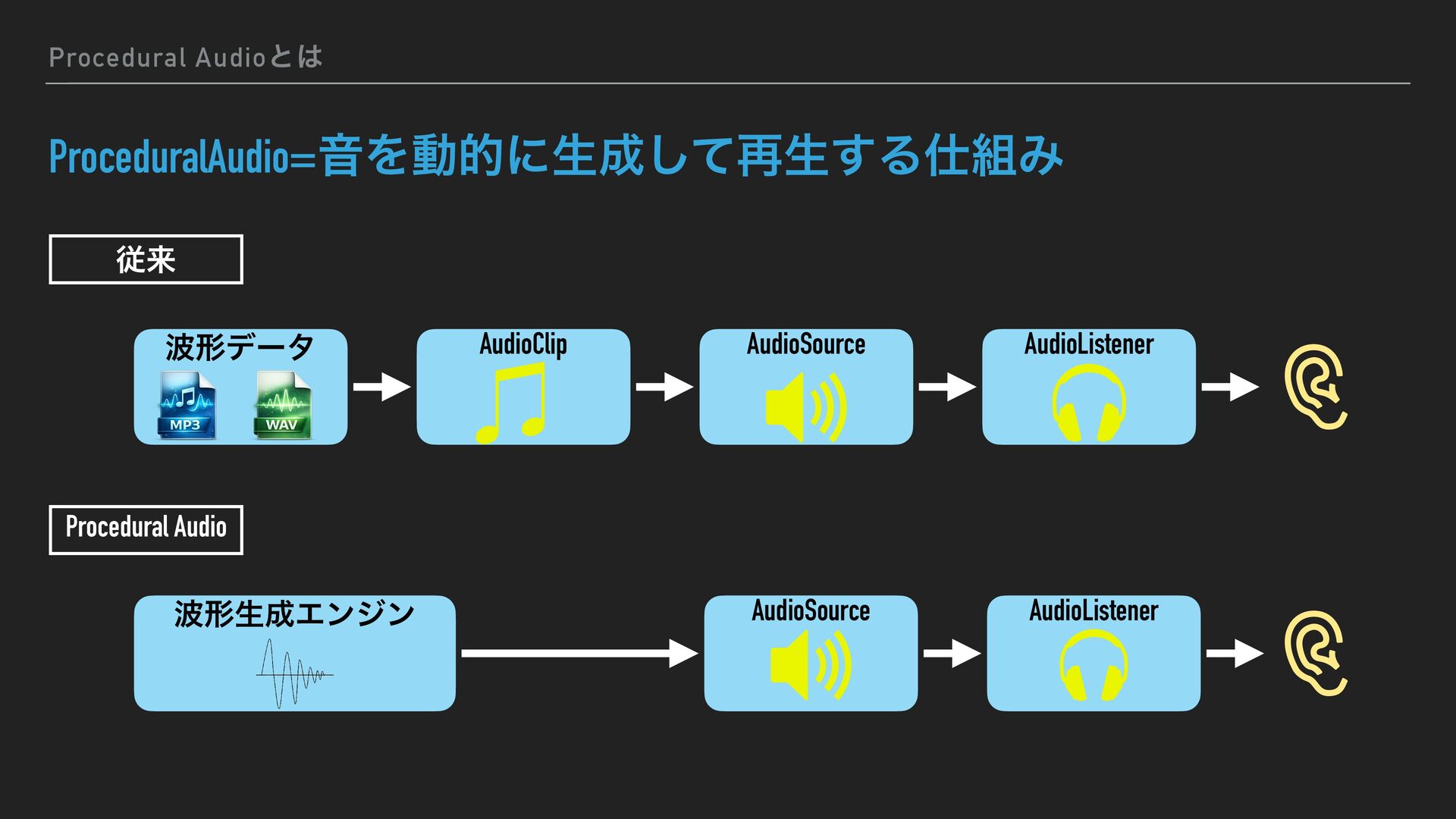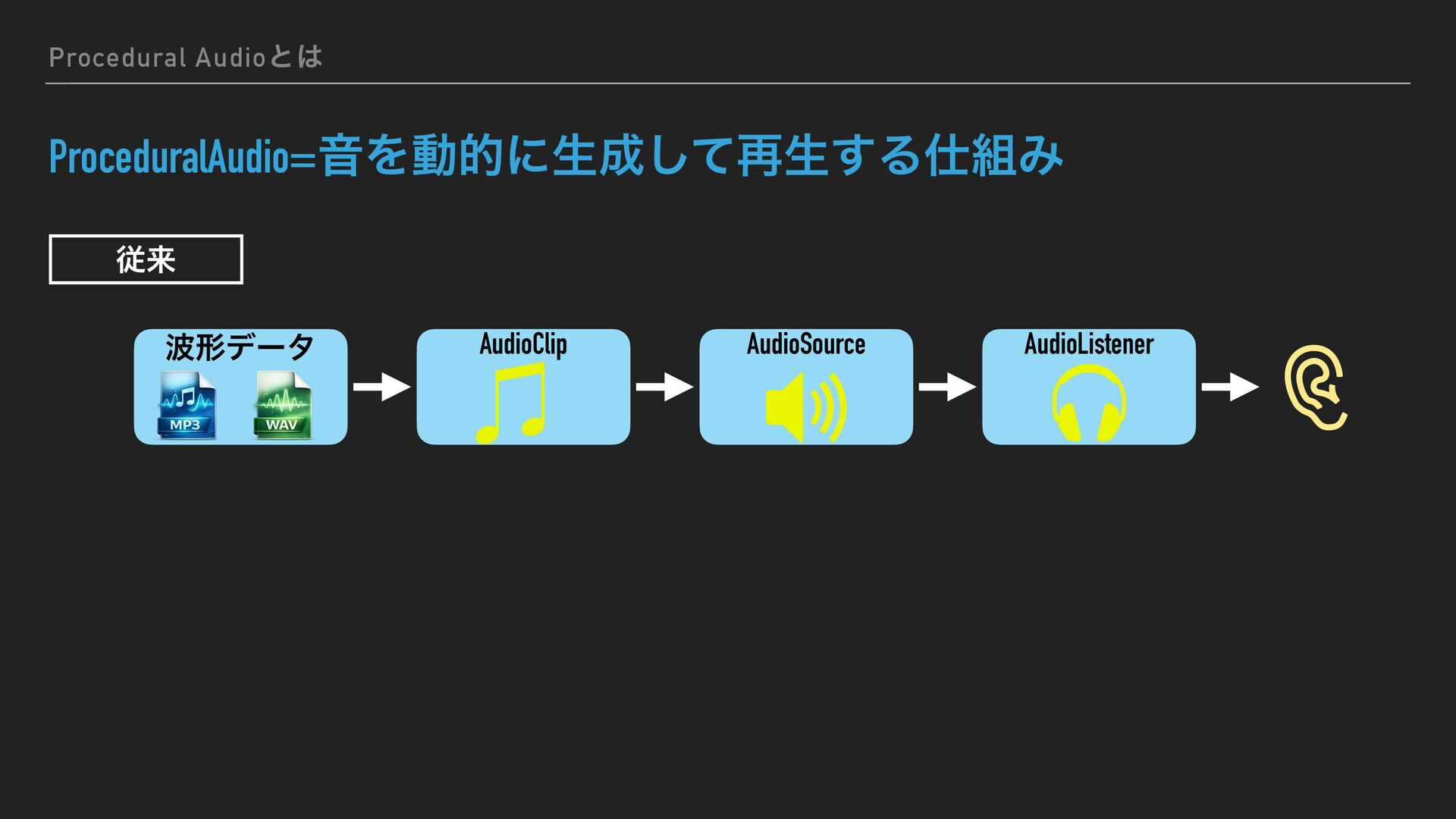Procedural Audioͱ ProceduralAudio=ԻΛಈతʹੜͯ͠࠶ੜ͢ΔΈ ैདྷ Procedural Audio ܗσʔλ AudioClip AudioSource AudioListener