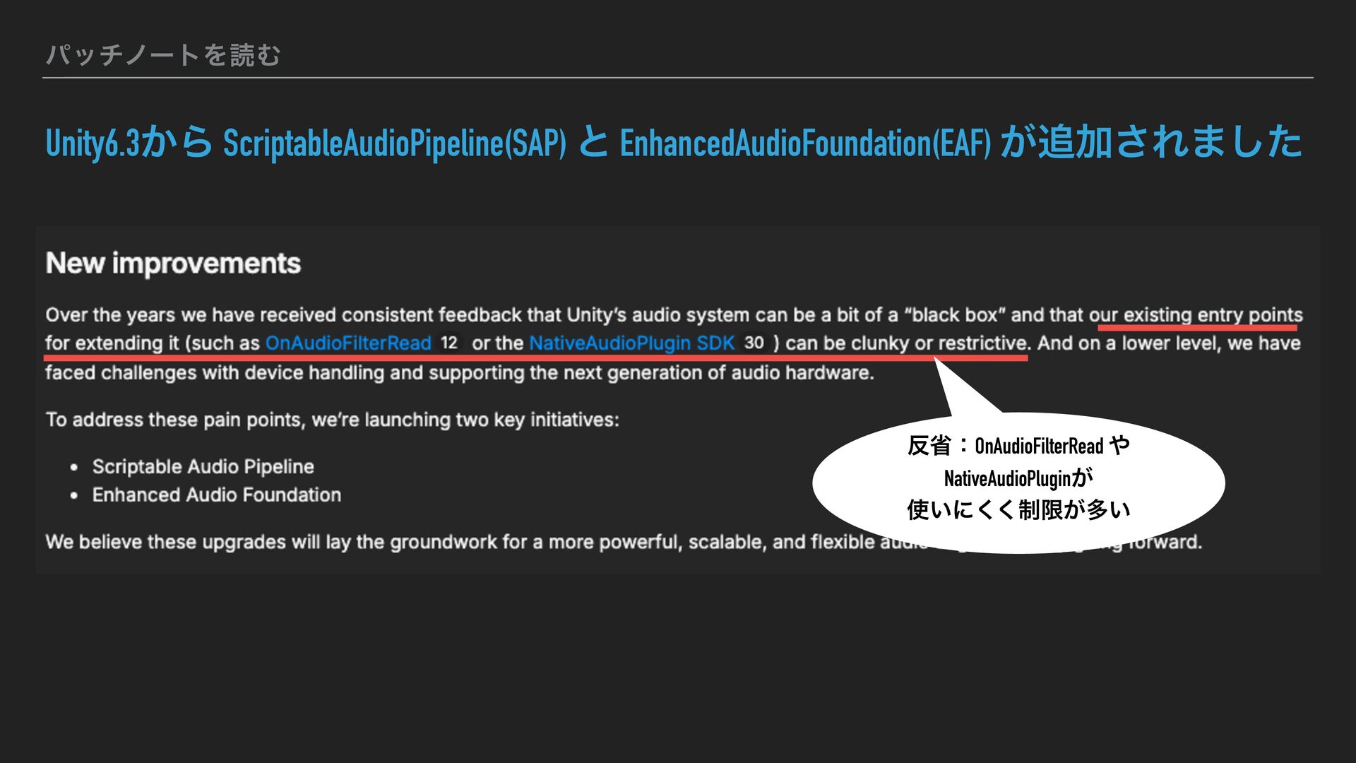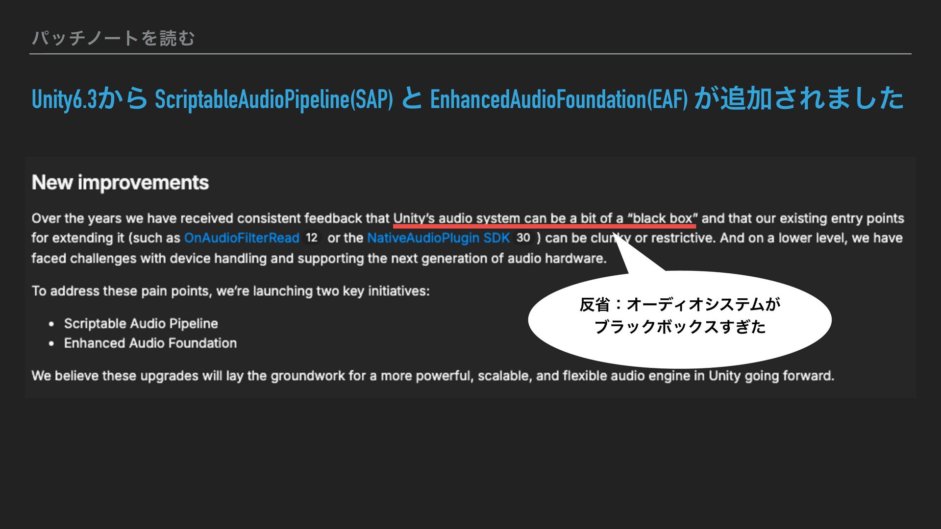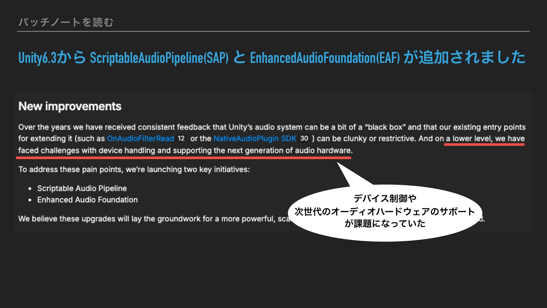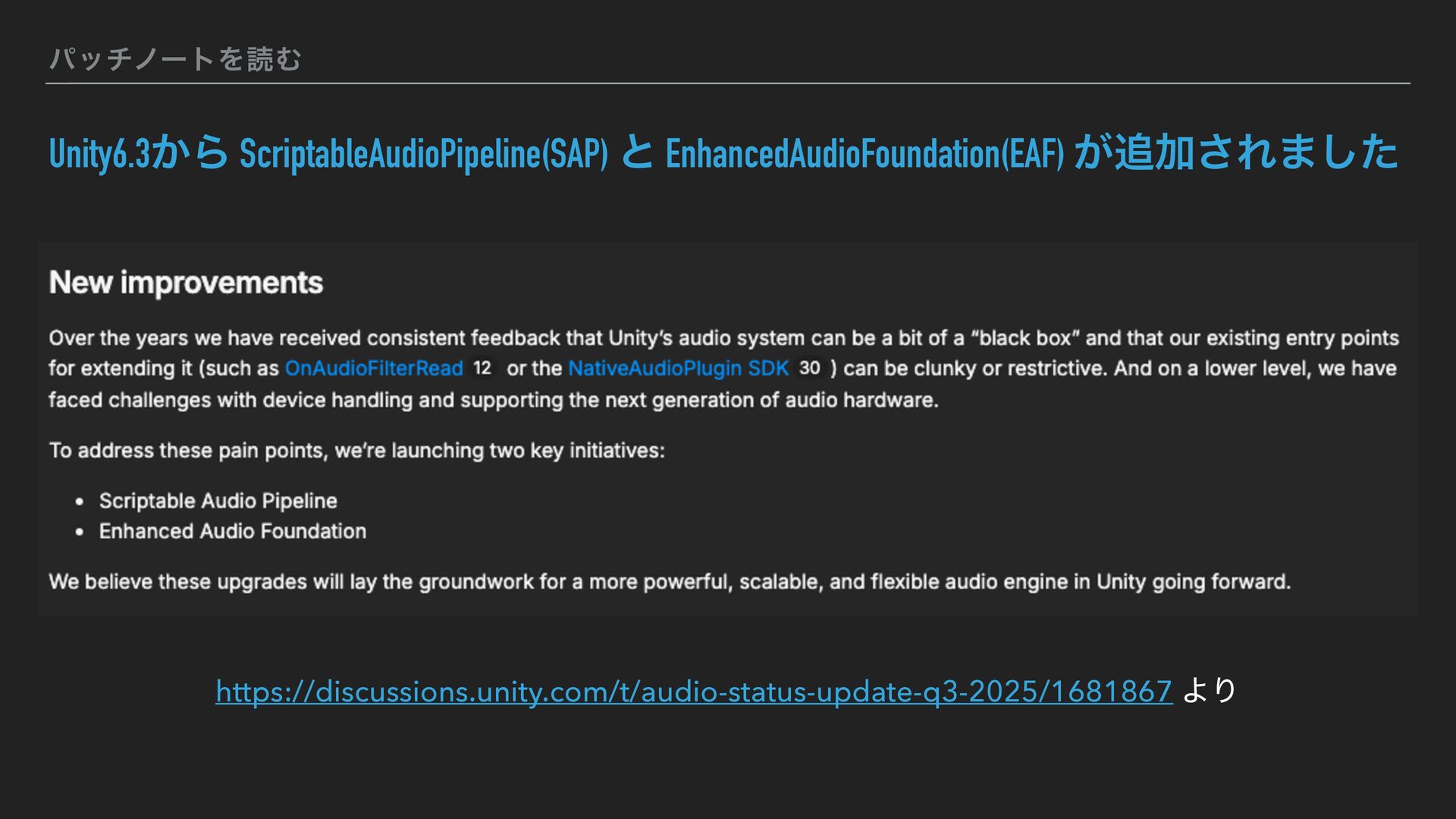ύονϊʔτΛಡΉ Unity6.3͔Β ScriptableAudioPipeline(SAP) ͱ EnhancedAudioFoundation(EAF) ͕Ճ͞Ε·ͨ͠ σόΠε੍ޚ ࣍ੈͷΦʔσΟΦϋʔυΣΞͷαϙʔτ ͕՝ʹͳ͍ͬͯͨ