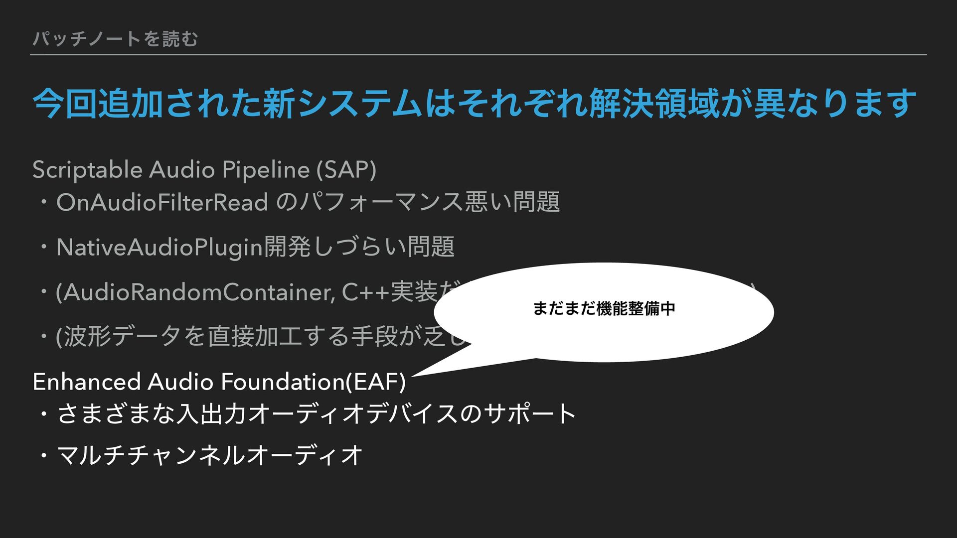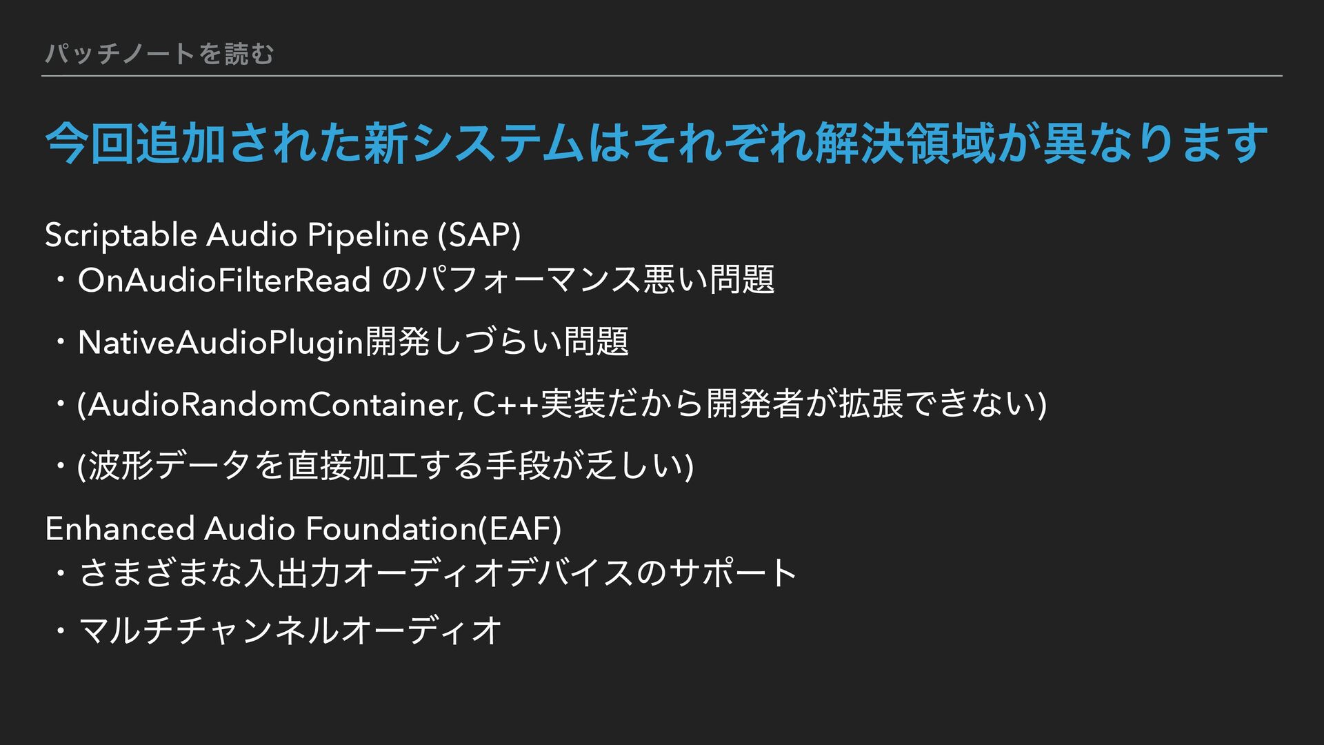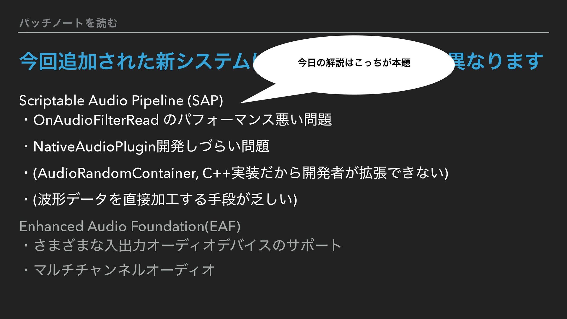 ύονϊʔτΛಡΉ ࠓճՃ͞Εͨ৽γεςϜͦΕͧΕղܾྖҬ͕ҟͳΓ·͢ Scriptable Audio Pipeline (SAP) ɾOnAudioFilterRead ͷύϑΥʔϚϯεѱ͍ ɾNativeAudioPlugin։ൃͮ͠Β͍ ɾ(AudioRandomContainer,