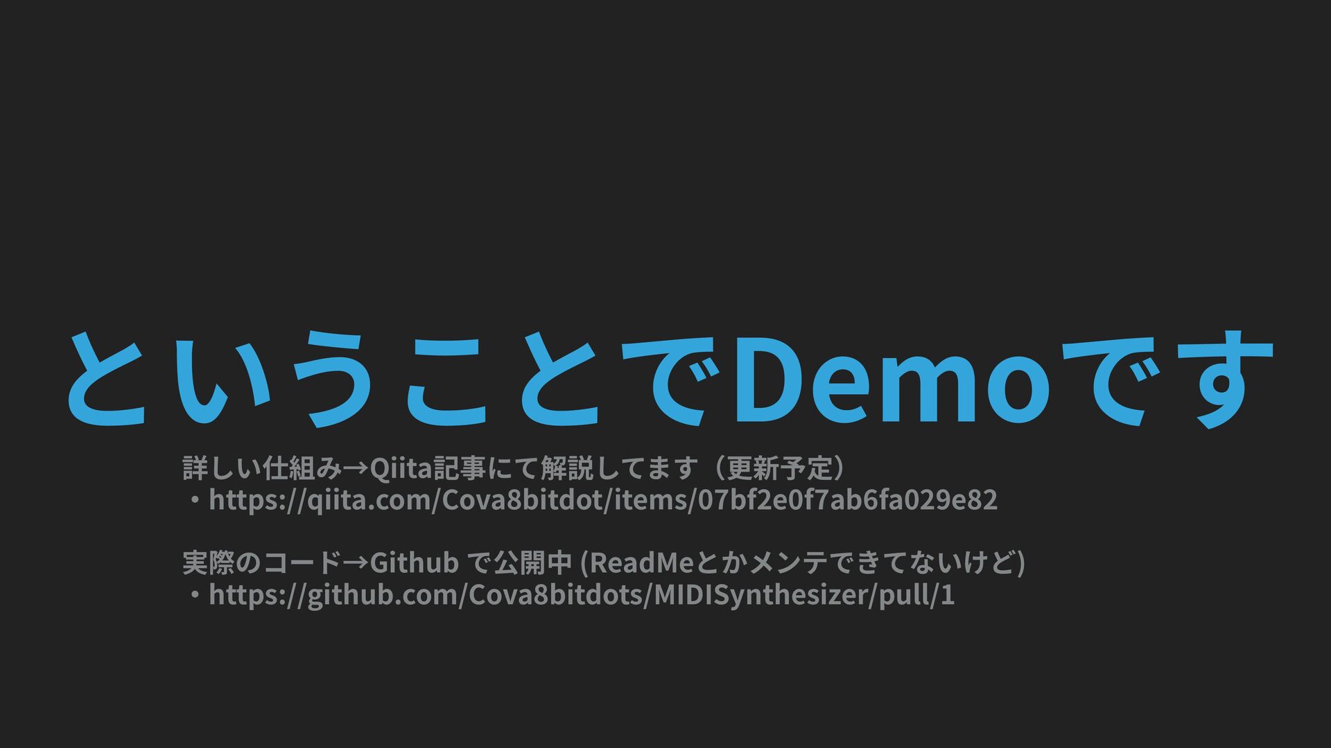 ということでDemoです 詳しい仕組み→Qiita記事にて解説してます(更新予定) ・https://qiita.com/Cova8bitdot/items/07bf2e0f7ab6fa029e82 実際のコード→Github で公開中 (ReadMeとかメンテできてないけど) ・https://github.com/Cova8bitdots/MIDISynthesizer/pull/1