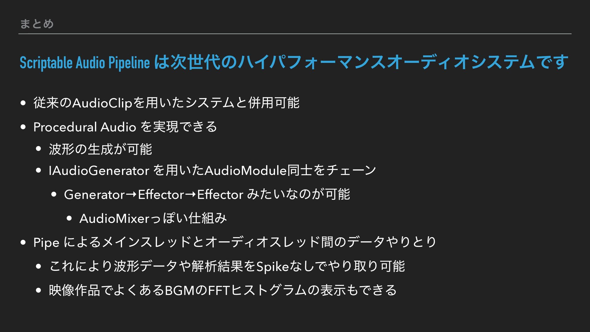 ·ͱΊ Scriptable Audio Pipeline ࣍ੈͷϋΠύϑΥʔϚϯεΦʔσΟΦγεςϜͰ͢ • ैདྷͷAudioClipΛ༻͍ͨγεςϜͱซ༻Մೳ • Procedural Audio