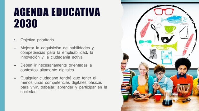 de habilidades y competencias para la empleabilidad, la innovación y la ciudadanía activa. – Deben ir necesariamente orientadas a contextos altamente digitales – Cualquier ciudadano tendrá que tener al menos unas competencias digitales básicas para vivir, trabajar, aprender y participar en la sociedad.