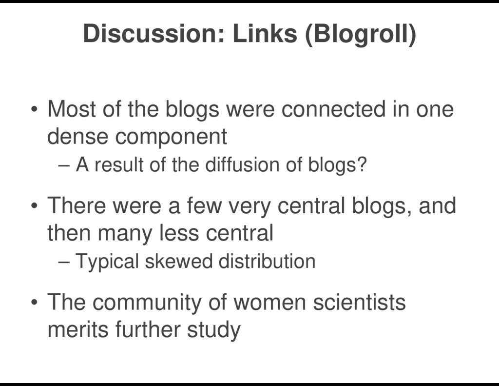 p – A result of the diffus • There were a few ve then many less cent then many less cent – Typical skewed dist • The community of w merits further study merits further study inks (Blogroll) ere connected in one sion of blogs? ery central blogs, and ral ral tribution women scientists