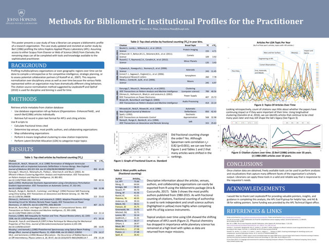 [email protected] This poster presents a case study of how a librarian can prepare a bibliometric profile of a research organization. The case study updated and revisited an earlier study by Berl (1986) profiling the Johns Hopkins Applied Physics Laboratory (APL). Assuming access to either Scopus from Elsevier or Web of Science (WoS) from Clarivate,the remaining steps can all be completed with tools and knowledge available to the sophisticated practitioner. BACKGROUND Profiling multidisciplinary organizations or even geographic regions over time can be done to compile a retrospective or for competitive intelligence, strategic planning, or to assess potential collaboration partners (cf Kostoff et al., 2007). This requires normalization over disciplinary areas as well as over time because the various fields represented within an organization may have dramatically different citing behaviors. The citation source normalization method suggested by Leydesdorff and Opthof (2010) is used for discipline and binning is used for time. METHODS Retrieve article metadata from citation database • Use database organization roll-up feature (Organizations- Enhanced field) , and search Berl(1986) articles individually • Retrieve full record in plain text format for APL’s and citing articles Use R scripts to • Calculate fractional times cited • Determine top venues, most prolific authors, and collaborating organizations • Map collaborating organizations • Perform k-means longitudinal clustering to view citation trajectories • Perform Latent Dirichlet Allocation (LDA) to categorize major topics CONCLUSIONS ACKNOWLEDGEMENTS I would like to thank Loet Leydesdorff for providing valuable pointers, insights, and guidance in completing this analysis, the APL Cool R group for helpful tips, and AG & SB for editing pointers. Some funding was provided by the APL Technical Digest office. 0 200 400 600 800 1000 0 200 400 600 800 1000 APLsum$Rank.Overall APLsum$Rank.Overall.F 2 4 6 8 10 0 20 40 60 30% 30% 20% 10% 10% RESULTS Citation TC TCF Mirowski,M., Reid,P., Mower,M., et al. (1980) Termination of Malignant Ventricular Arrhythmias with an Implanted Automatic Defibrillator in Human-Beings. New England Journal of Medicine 303,322-324. doi:10.1056/NEJM198008073030607 850 42.43 Kanungo,T., Mount,D., Netanyahu,N., Piatko,C., Silverman,R. and Wu,A. (2002). An Efficient k-Means Clustering Algorithm: Analysis and Implementation. IEEE Transactions on Pattern Analysis and Machine Intelligence, 24, 881-892. doi:10.1109/TPAMI.2002.1017616 789 40.56 Spall,J.(1992). Multivariate Stochastic-Approximation using a Simultaneous Perturbation Gradient Approximation. IEEE Transactions on Automatic Control, 37, 332-341. doi:10.1109/9.119632 568 32.98 Raney,R., Runge,H., Bamler,R., Cumming,I. and Wong,F. (1994) Precision SAR Processing using Chirp Scaling. IEEE Transactions on Geoscience and Remote Sensing, 32, 786-799. doi:10.1109/36.298008 315 25.63 Ottman,G., Hofmann,H., Bhatt,A. and Lesieutre,G. (2002). Adaptive Piezoelectric Energy Harvesting Circuit for Wireless Remote Power Supply. IEEE Transactions on Power Electronics, 17, 669-676. doi:10.1109/TPEL.2002.802194 407 23.72 Brown,M., Burschka,D. and Hager,G. (2003). Advances in Computational Stereo. IEEE Transactions on Pattern Analysis and Machine Intelligence, 25, 993-1008, doi:10.1109/TPAMI.2003.1217603 414 22.14 Franson,J (1989). Bell Inequality for Position and Time. Physical Review Letters, 62, 2205- 2208, doi:10.1103/PhysRevLett.62.2205 471 20.16 Sharpe,W., Yuan,B. and Edwards,R.(1997) A New Technique for Measuring the Mechanical Properties of Thin Films. Journal of Microelectromechanical Systems 6,193-199. doi:10.1109/84.623107 285 16.85 Murphy,J. and Aamodt,L.(1980) Photothermal Spectroscopy using Optical Beam Probing - Mirage Effect. Journal of Applied Physics, 51, 4580-4588, doi:10.1063/1.328350 276 16.57 Ott,E. and Sommerer,J.(1994) Blowout Bifurcations - the Occurrence of Riddled Basins and on Off Intermittency. Physics Letters A, 18, 39-47, doi:10.1016/0375-9601(94)90114-7 378 15.34 REFERENCES & LINKS Scripts can be found on https://github.com/cpikas/institutionalprofiles Poster can be found on https://speakerdeck.com/cpikas Aria, M. & Cuccurullo, C. (2017) bibliometrix: An R-tool for comprehensive science mapping analysis. Journal of Informetrics, 11, 959-975. doi:10.1016/j.joi.2017.08.007 Berl, W. G. (1986). The 22 most frequently cited APL Publications. Johns Hopkins APL Technical Digest, 7, 221-232. http://www.jhuapl.edu/techdigest/views/pdfs/V07_N2_1986/V7_N2_1986_Berl.pdf Genolini, C., Ecochard,R., Benghezal,M. Driss, R., Andrieu, S., & Subtil, F. (2016). kmlShape: An efficient method to cluster longitudinal data (time-series) according to their shapes. PLoS One, 11, e0150738. doi:10.1371/journal.pone.0150738 Kostoff, R. N., del Rio, J. A., Cortes, H. D., Smith, C., Smith, A., Wagner, C., ... Tshiteya, R. (2007). Clustering methodologies for identifying country core competencies. Journal of Information Science, 33, 21. doi:10.1177/0165551506067124 Leydesdorff, L., & Opthof, T. (2010). Scopus's source normalized impact per paper (SNIP) versus a journal impact factor based on fractional counting of citations. Journal of the American Society for Information Science and Technology, 61, 2365-2369. doi:10.1002/asi.21371 R Core Team (2017). R: A language and environment for statistical computing [Computer software]. R Foundation for Statistical Computing, Vienna, Austria. https://www.R-project.org/. Author ArticlesF Lui, ATY 75.66 Meng, CI 64.64 Krimigis, SM 58.25 Newell, PT 49.70 Cheng, AF 41.56 Roelof, EC 41.01 Potemra, TA 40.35 Anderson, BJ 39.33 Sibeck, DG 36.51 Franson, JD 35.75 Greenwald, RA 33.00 Mitchell, DG 32.75 Lorenz, RD 32.14 Goldhirsh, J 31.35 Williams, DJ 30.27 Ohtani, S 28.97 Mauk, BH 27.92 Monchick, L 27.58 Paxton, LJ 27.48 Spall, JC 26.42 0% 5% 10% 15% 20% 25% 1986 1989 1990 1991 1992 1993 1994 1995 1996 1997 1998 1999 2000 2001 2002 2003 2