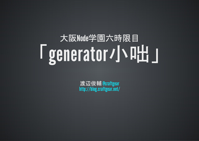 メソッドに引数を渡すと、 generator に値 を送りこめる function* hoge(){ var x = null; console.log('inside generator: x is ', x); x = yield 1; console.log('inside generator: after yielded, x is ', x); } var iterator = hoge(); console.log('return value of next', iterator.next()); console.log('return value of next', iterator.next('hoge')); 1 2 3 4 5 6 7 8 9 10 11 inside generator: x is null return value of next { value: 1, done: false } inside generator: after yielded, x is hoge return value of next { value: undefined, done: true } 1 2 3 4 https://github.com/craftgear/ong6/tree/master/example/03_next.js