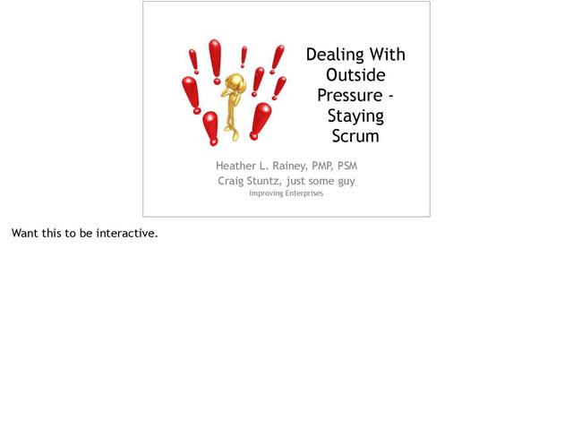 Roles: Team Member, Product Owner, ScrumMaster • Specific artifacts: Product increment, product backlog, sprint backlog, burndown • Activities: Backlog refinement, sprint planning, daily scrum, sprint retrospective • Emphasizes self-organization, collaboration, and communication What is Scrum? 4 https://www.scrumalliance.org/why-scrum/core-scrum-values-roles I’m going to talk about Scrum because that’s what I know best. However, the need to deal with outside interference is common to all processes. Not just software!
